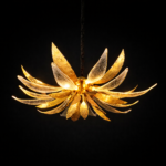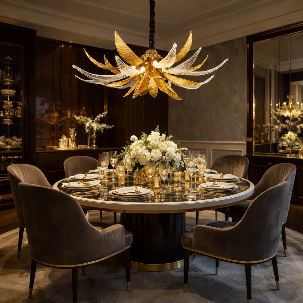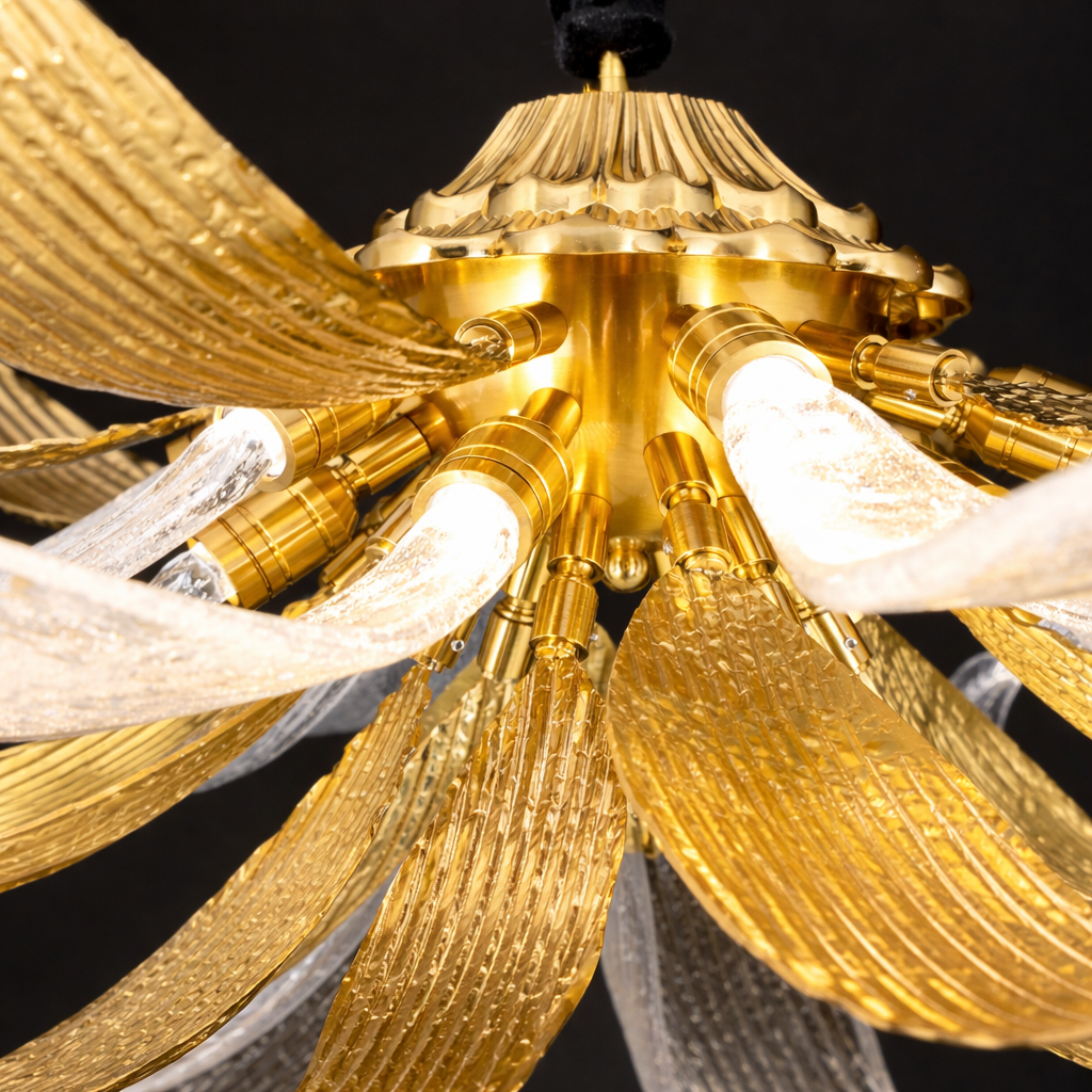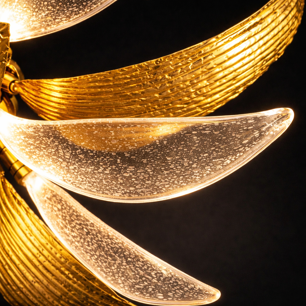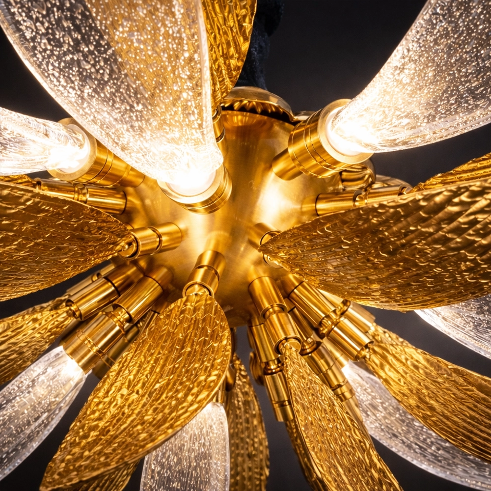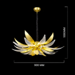 The Aurelion Bloom Sculptural Chandelier is a striking fusion of artistic design and modern illumination, inspired by the organic elegance of a blooming flower. Radiating from its central gold core, a dramatic arrangement of textured metallic petals and translucent glass blades unfolds outward in a dynamic layered composition. Each sculpted element reflects and diffuses light differently, creating a captivating interplay of shimmer, shadow, and warm ambient glow.