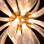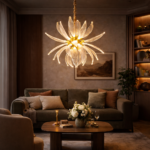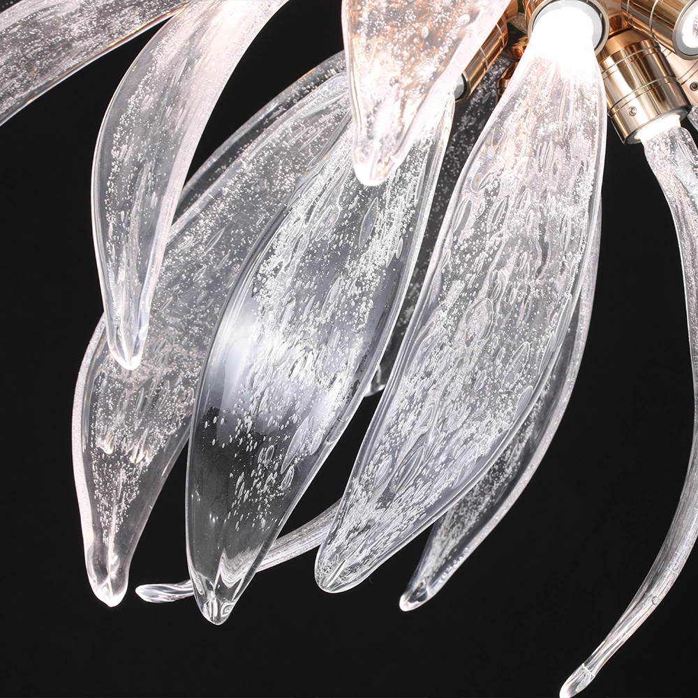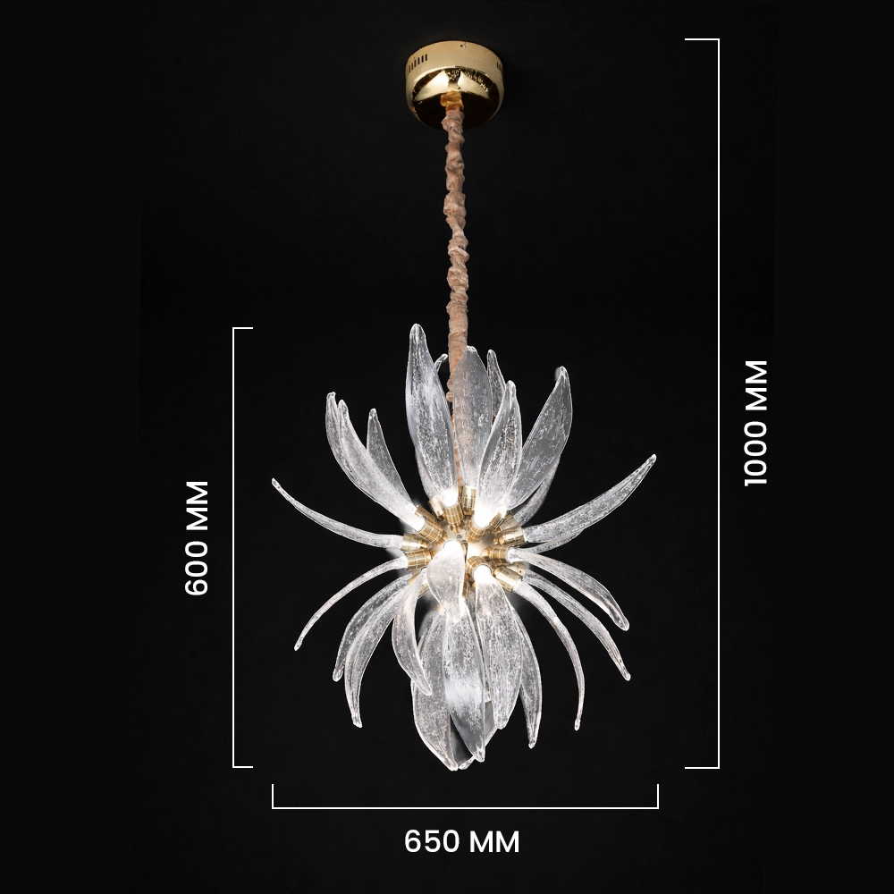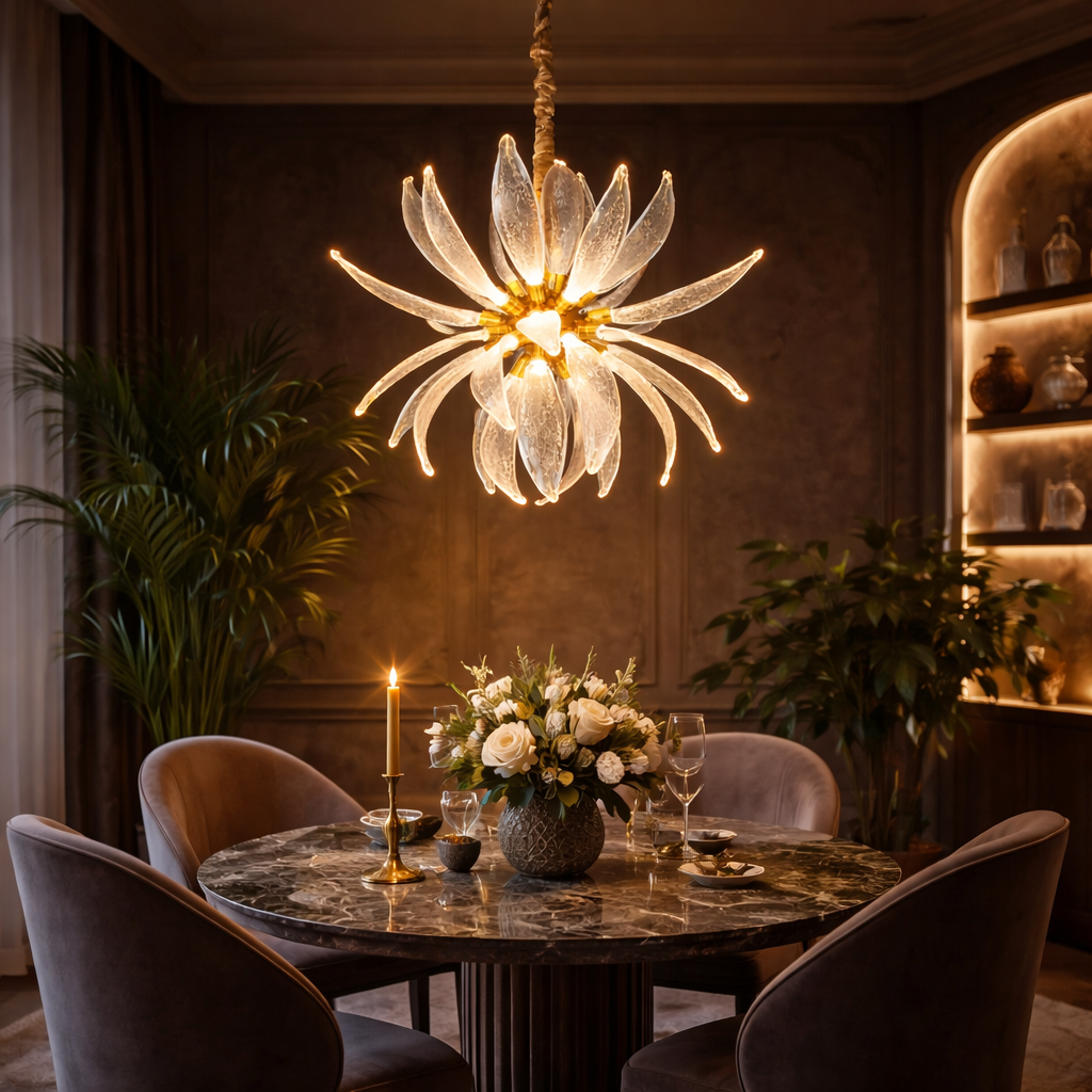 The Celestia Radiant Petal Glass Chandelier is a breathtaking statement light designed to resemble a luminous flower in full bloom. Crafted with multiple textured glass petals that radiate outward from a polished gold center, the chandelier creates a dynamic starburst silhouette that transforms any room into a sophisticated visual experience.