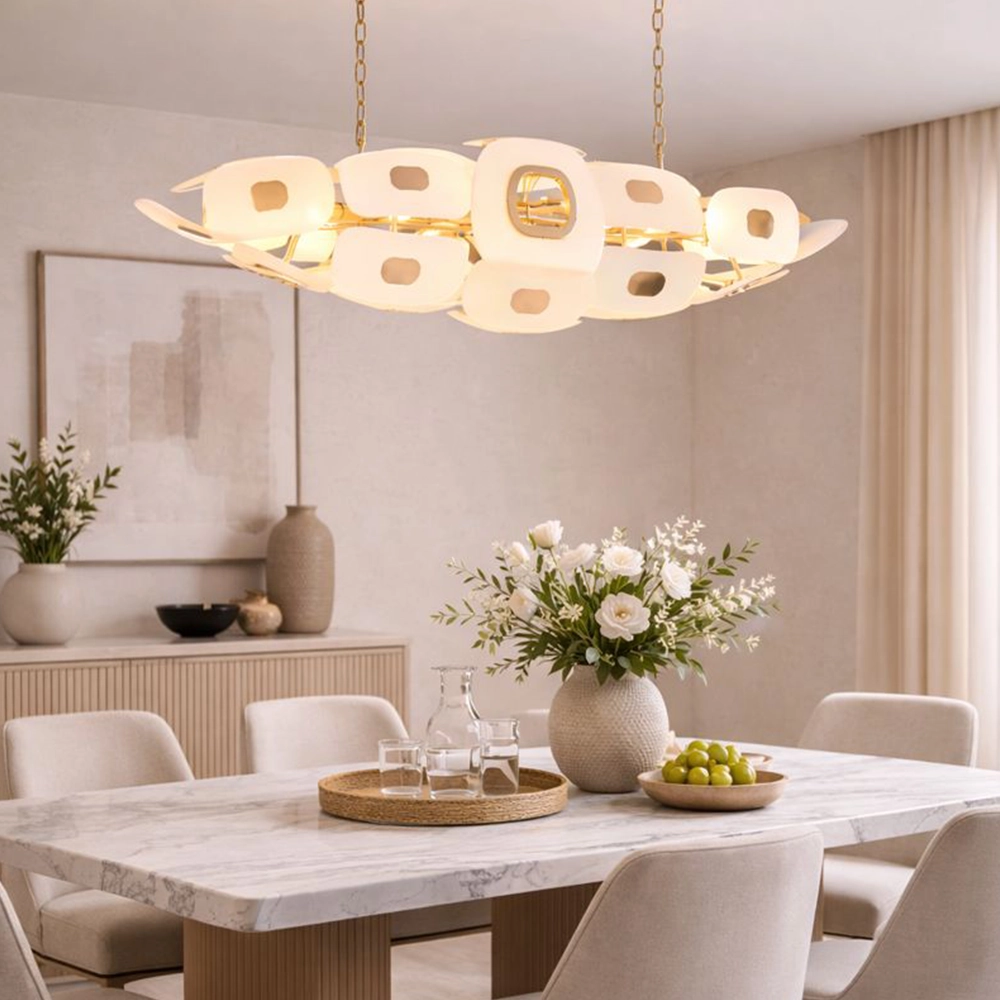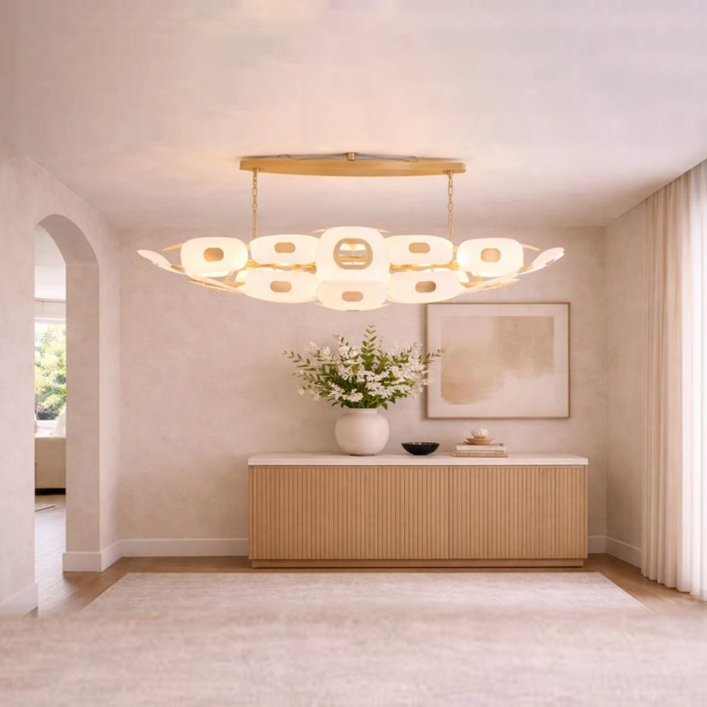 A suspended bar of pale porcelain cradles oversized oval medallions with golden eclipses at their hearts, their milky glow evoking lunar phases drifting across shadowed vaults. This celestial convoy hovers over whiskey bars, nocturnal libraries, and modernist dining realms where subtle mystery illuminates intimate soirées.