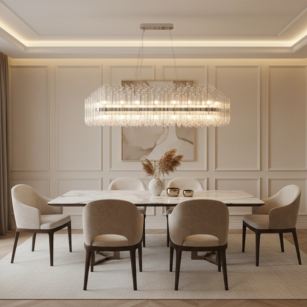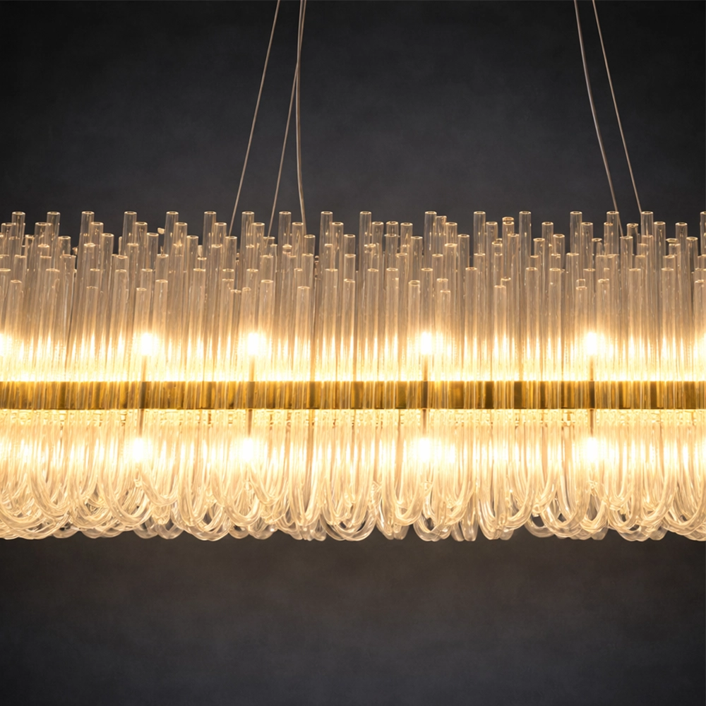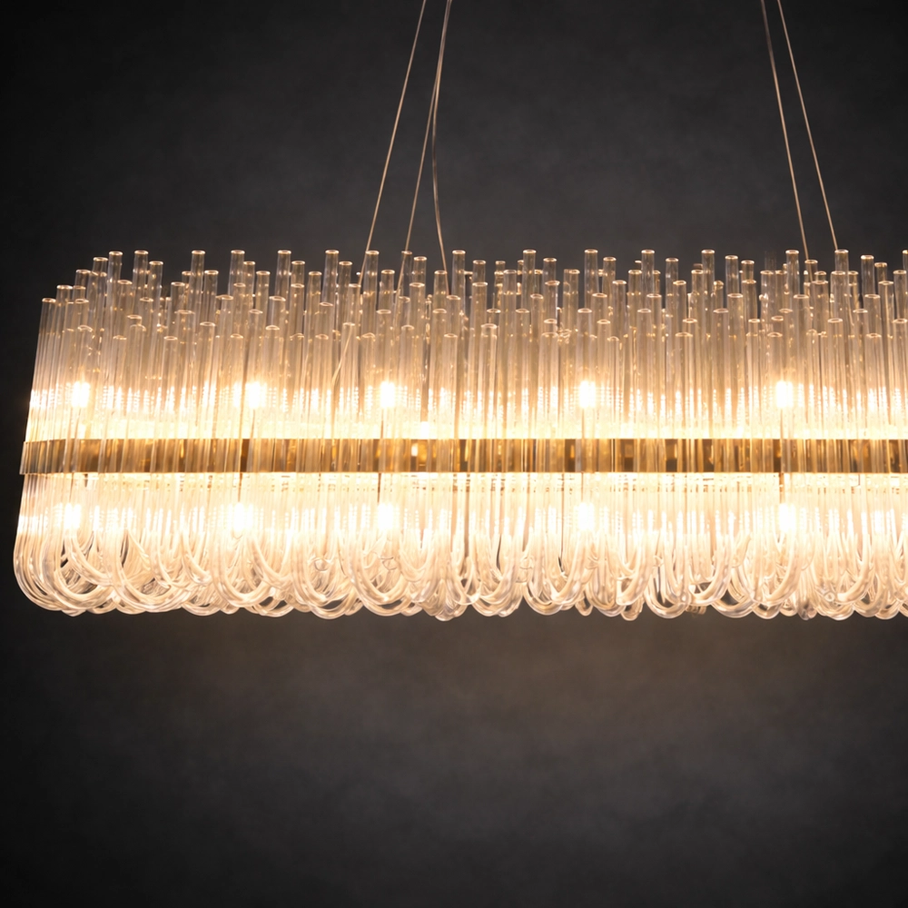 Span modern dining tables with the Linear Acrylic Tube Bar Chandelier, where parallel clear acrylic tubes create elongated luminous glow framed by polished gold brackets for contemporary linear lighting. Sleek rectangular pendant perfect for kitchens, conference rooms, or loft spaces—search “gold acrylic tube linear chandelier”. Dimmable multi-bulb design offers focused illumination; easy height adjustment for versatile installations.