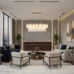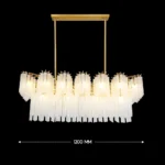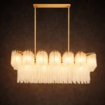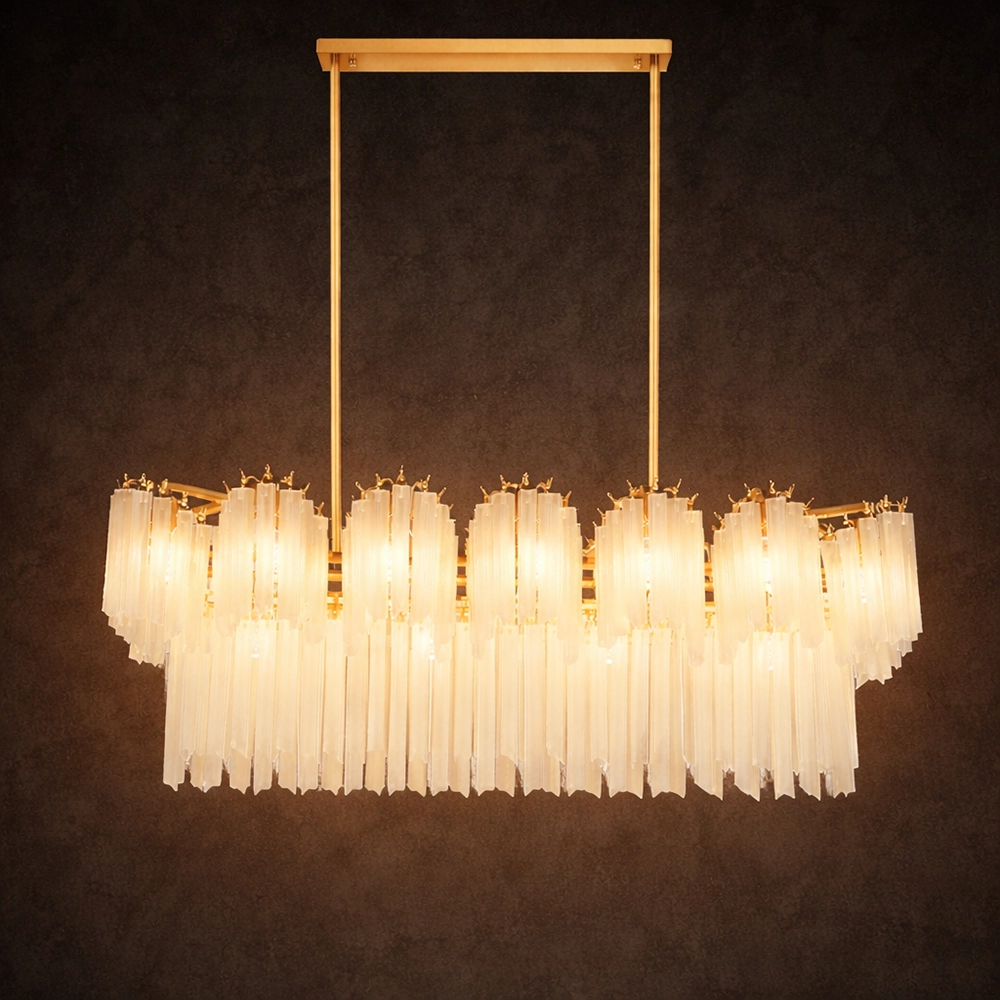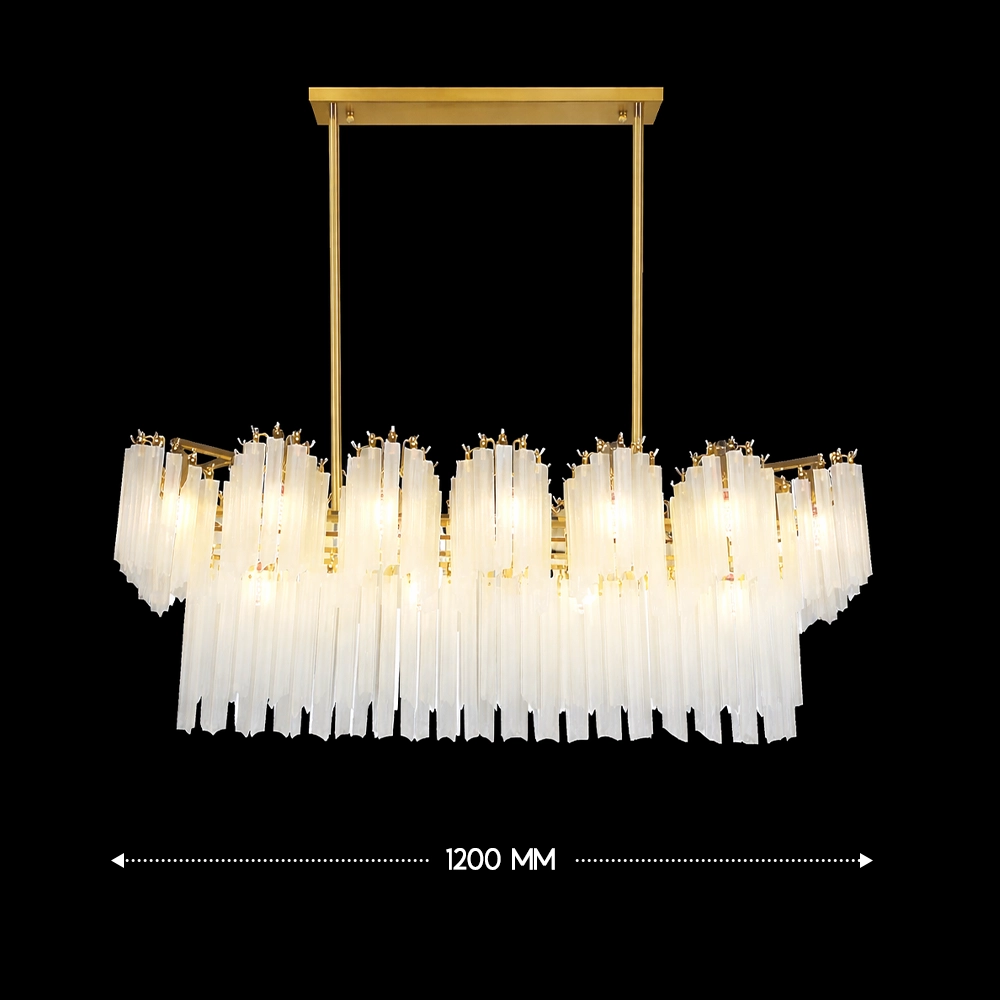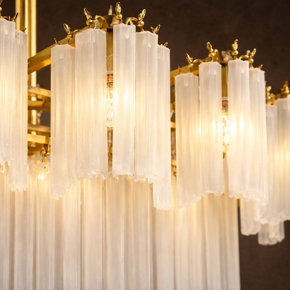 Lumira is a modern linear chandelier defined by cascading frosted glass prisms suspended from a slim brass frame. The layered vertical elements diffuse light evenly, creating a soft, luminous presence over dining tables, kitchen islands, and conference spaces. Designed for contemporary interiors that favor clean geometry with refined detailing.