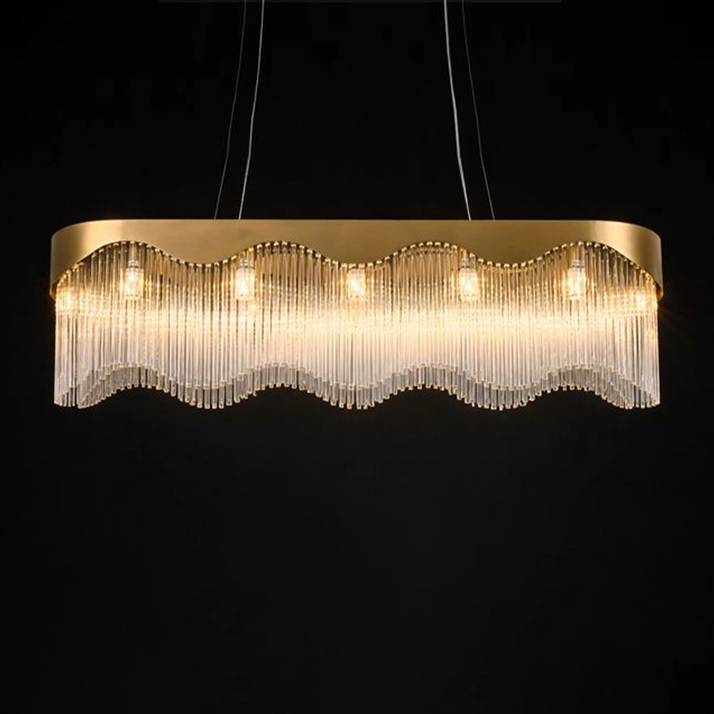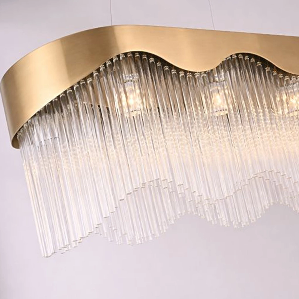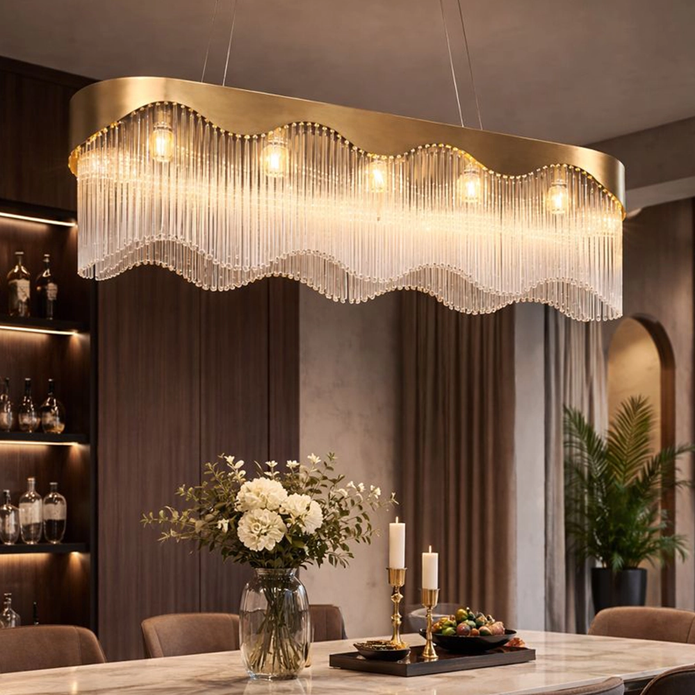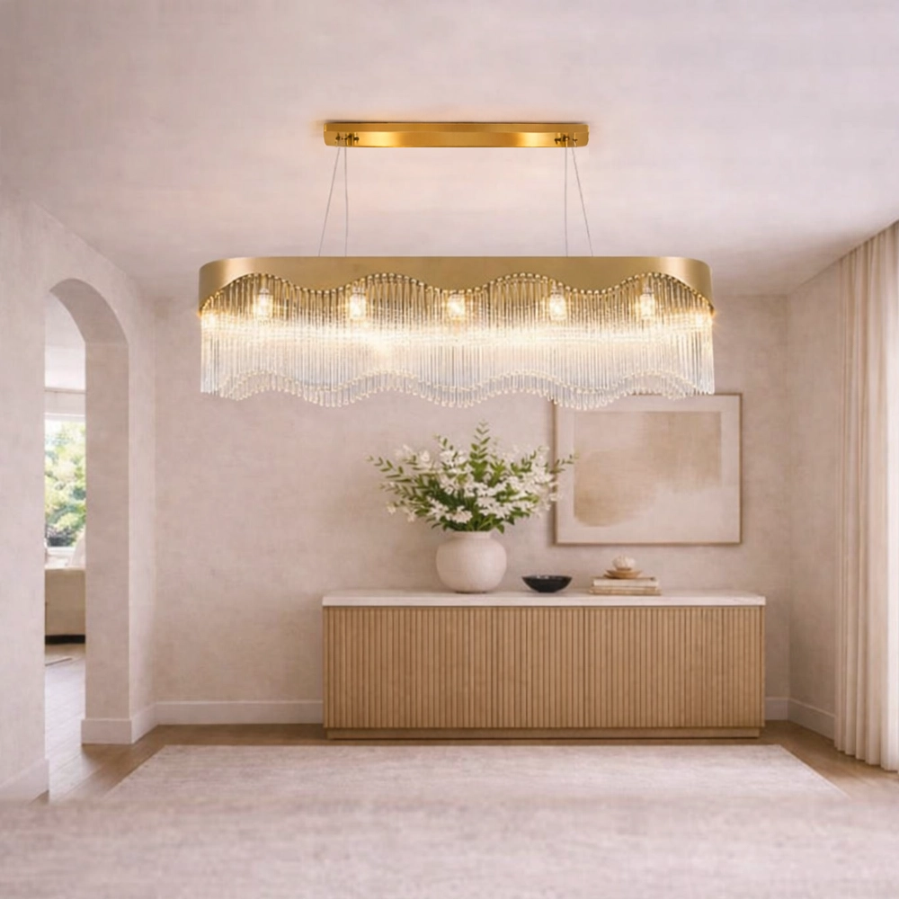A golden wave frame drips endless strands of crystal fringe like sea foam pulled from crashing surf, swaying with inner light to mimic tidal fringes over countertops. This underwater cascade drapes kitchen islands, oyster bars, and yacht salons where oceanic elegance flows in shimmering strands.