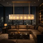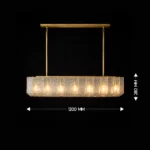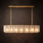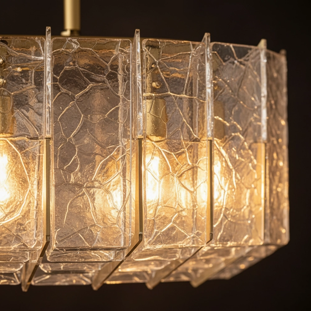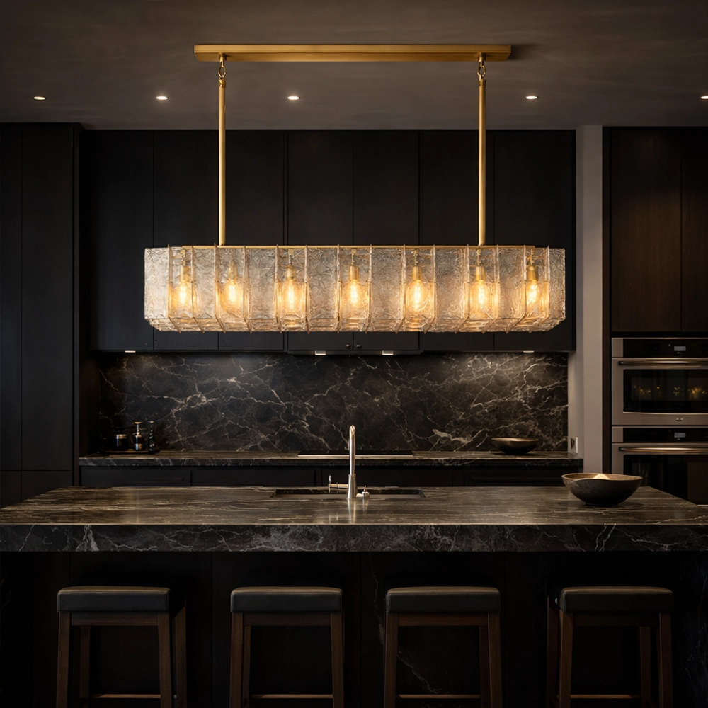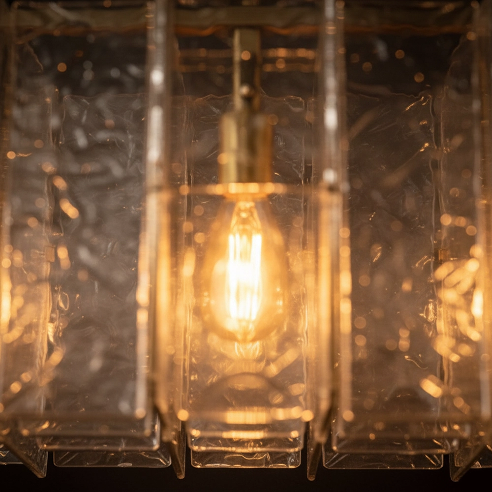 Vireon is a modern linear chandelier featuring textured glass panels suspended within a slim brass frame. The evenly spaced light points create a balanced, warm glow while the layered glass adds depth and subtle sparkle. Ideal for dining tables, kitchen islands, and contemporary spaces that call for refined linear lighting.