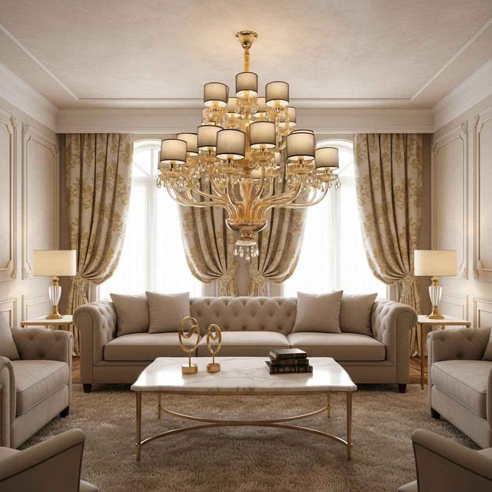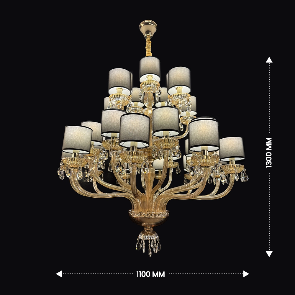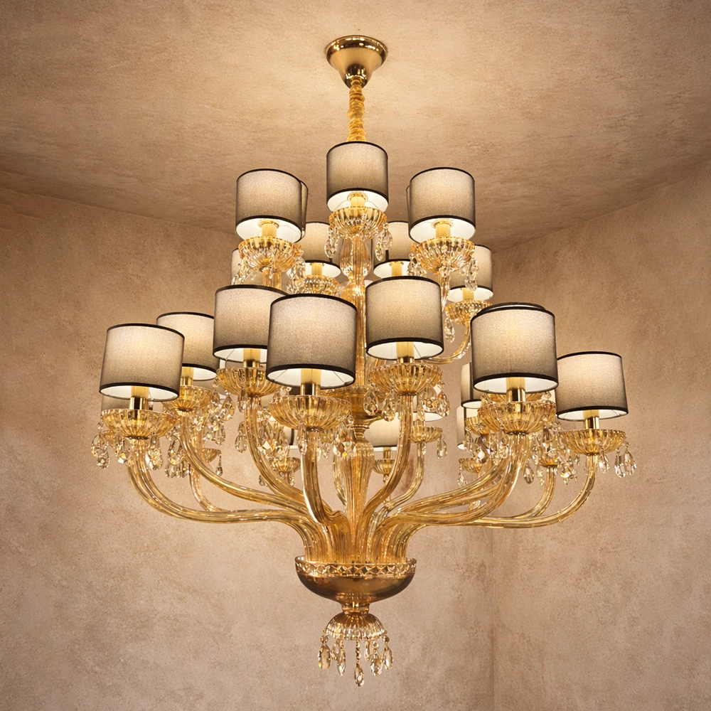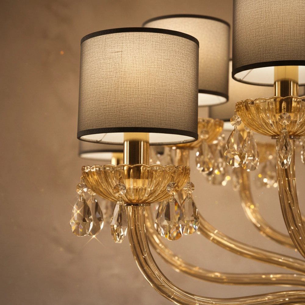 Dazzle grand spaces with the Amber Lampshade Crystal Cascade Chandelier, featuring 12 textured fabric shades atop sweeping gold crystal arms for opulent multi-layered illumination. Lavish 8-light statement fixture perfect for dining halls, hotel lobbies, or villas—search “gold crystal lampshade chandelier luxury”. Handcrafted brass and crystal ensure enduring elegance; dimmable for sophisticated ambient lighting.
