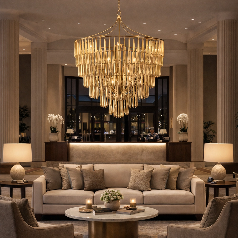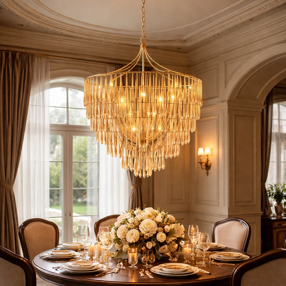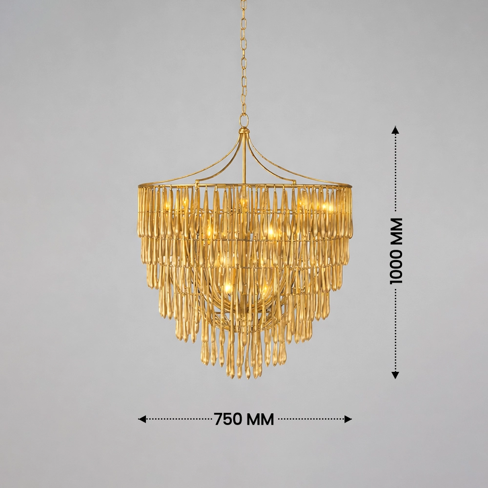The Aurevane LatticeDrop Gold Chandelier is a refined statement lighting fixture designed to bring warmth, elegance, and architectural beauty into sophisticated interiors. Featuring a circular gold frame with layered elongated metal drops, this modern luxury chandelier creates a graceful cascading effect that diffuses light beautifully.