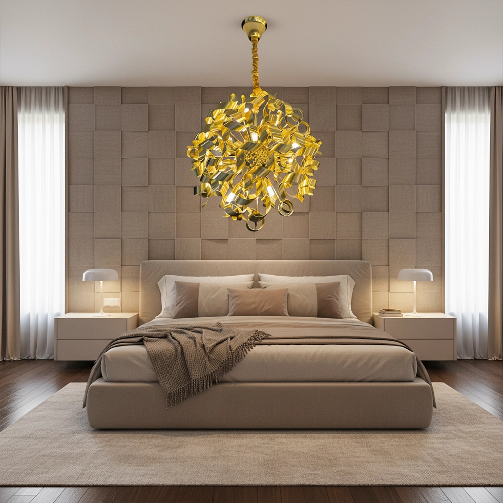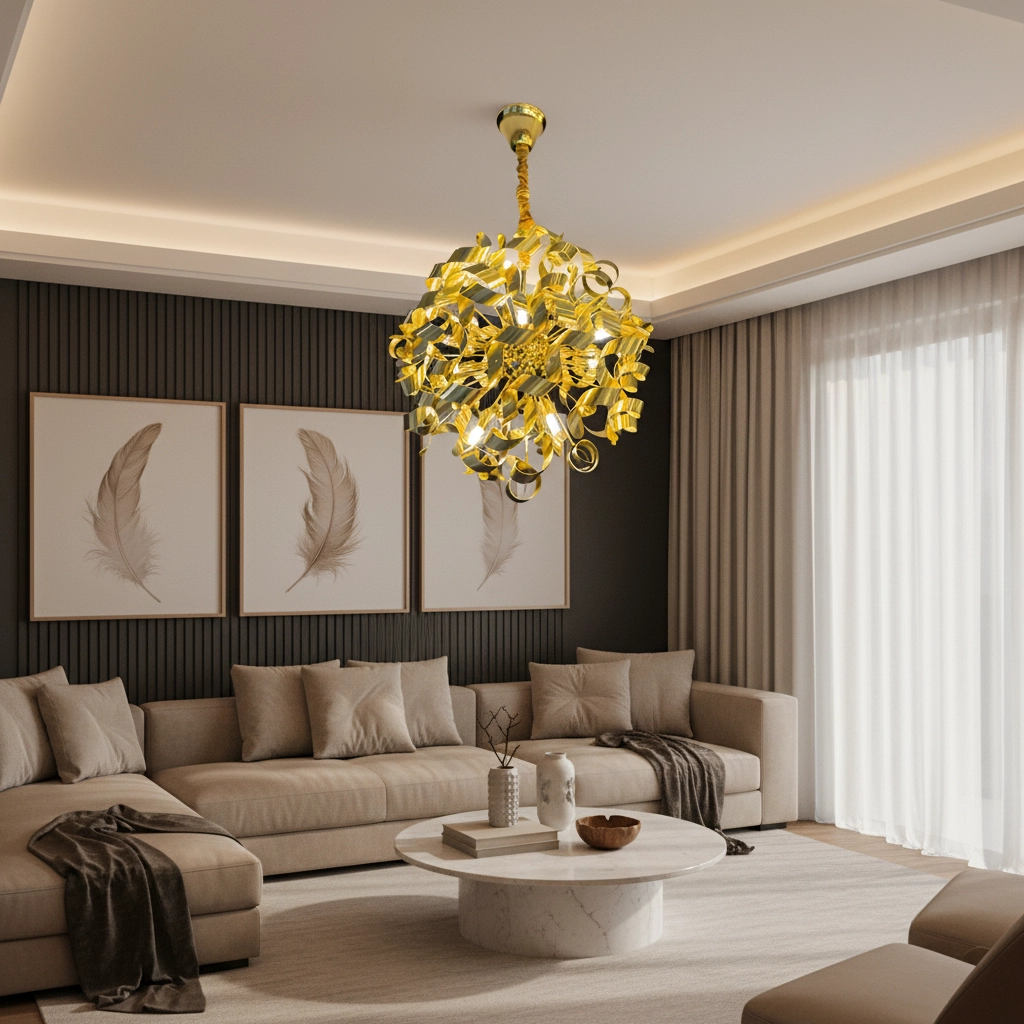 Command attention overhead with the Braided Gold Ribbon Cascade Chandelier, where twisted brass ribbons unfurl from a knotted rope suspension, casting dynamic layered glow across modern dining or living spaces. Premium multi-bulb pendant ideal for luxury interiors—search “twisted brass ribbon chandelier modern”. Robust gold finish diffuses warm light beautifully; adjustable chain for custom heights.