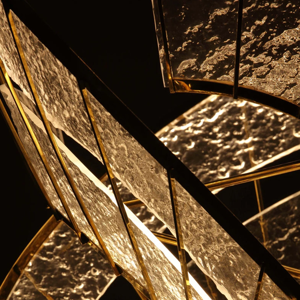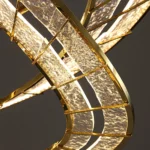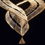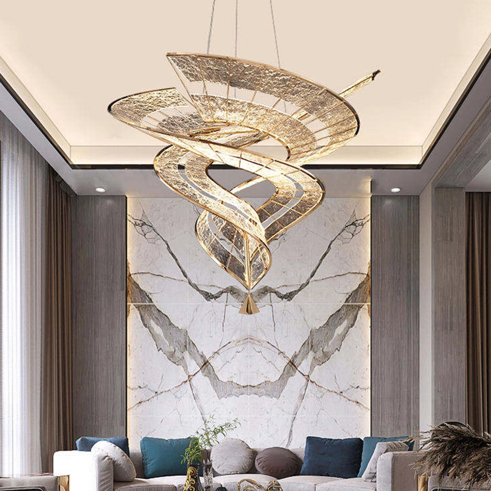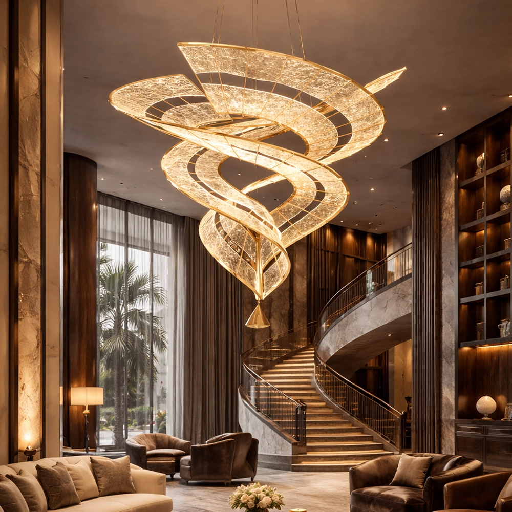 Twisted gold lattice spirals into a hypnotic vortex of fractured metallic wings, channeling light through razor voids like a phoenix caught in eternal golden spin. This kinetic inferno spirals above atrium voids, VIP club cores, and opulent ballrooms where dramatic ascent fuels breathless spectacle.
