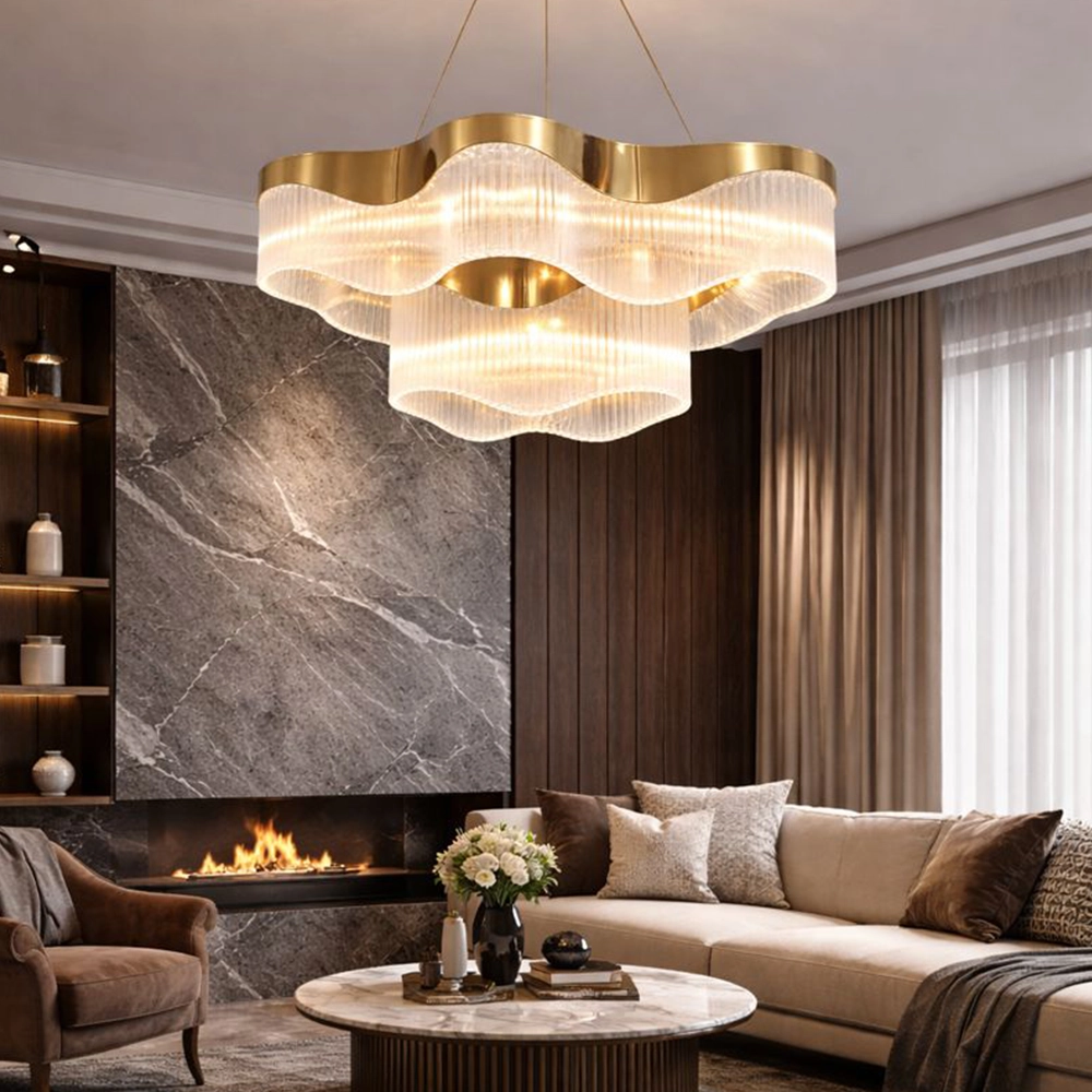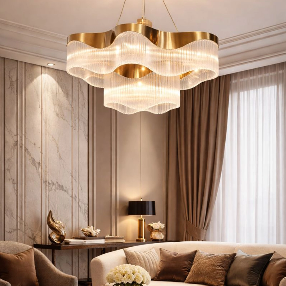 Wavy glass tiers ripple outward from a gleaming gold core like ocean swells captured in eternal crest, channeling light through fluid ridges into mesmerizing wave patterns below. This marine symphony surfs above coastal dining nooks, infinity pool lounges, and seaside penthouses craving the thrill of liquid motion frozen in glow.