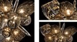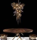 This one-of-a-kind light fixture is a true work of art, featuring a unique and creative design made with superior quality crystal and glass. The combination of magnificent proportions and superior craftsmanship, including glass shards, hand-blown and carved Murano glass globes, and a bronze honeycomb design, make this piece a lighting masterpiece. The various incandescent reflections it creates will uplift the ambiance of any space it’s placed in, making it a perfect statement piece in any room. It’s a perfect addition to any high-end or luxury spaces such as living rooms, dining rooms, entryways and more.