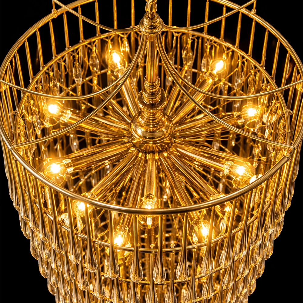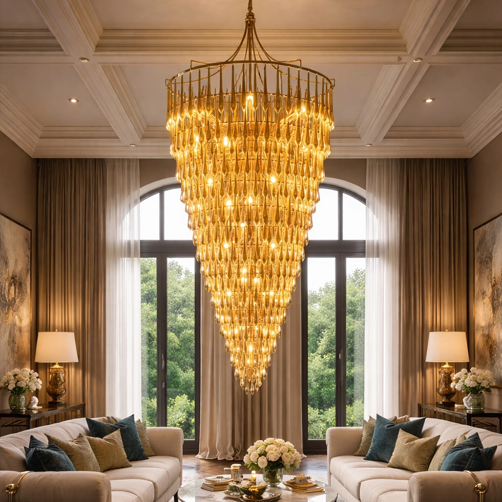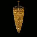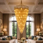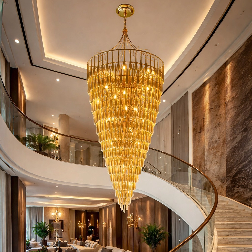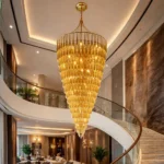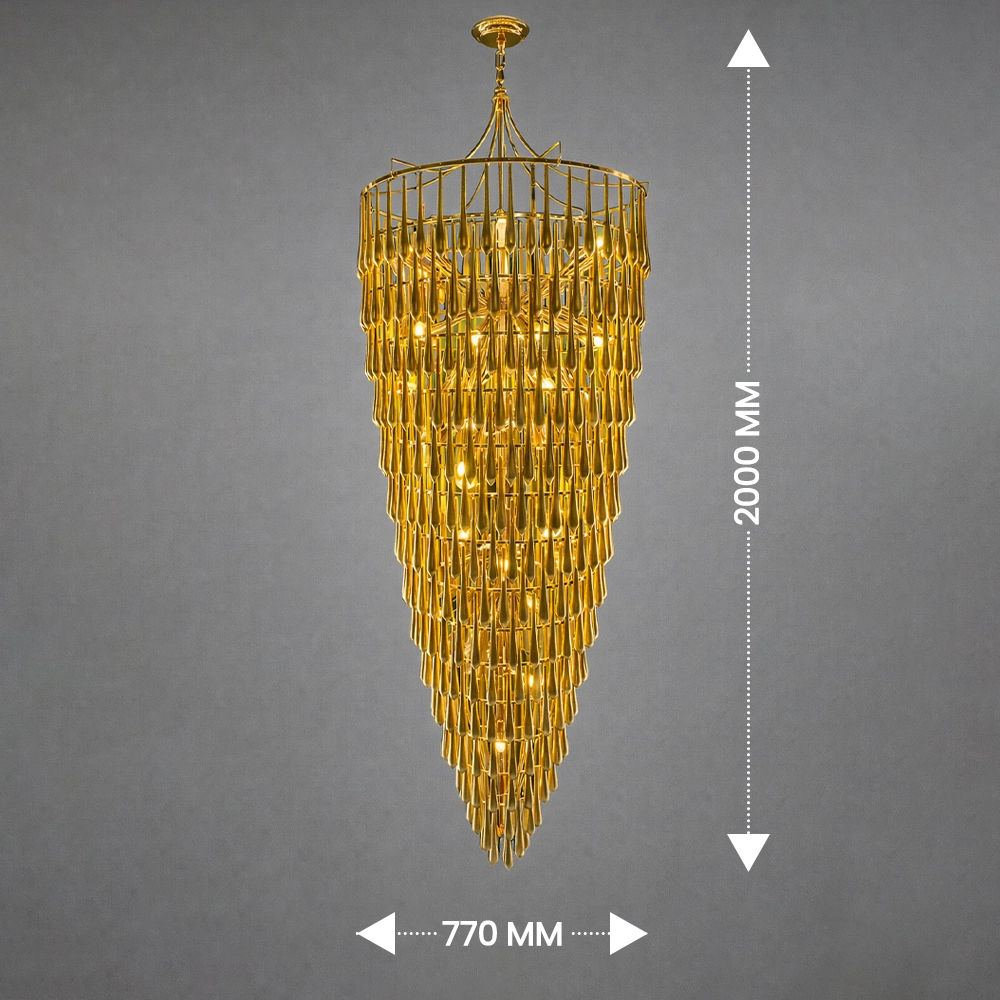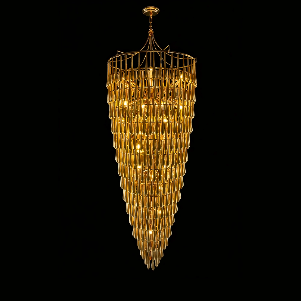 The Velmora Cascading Goldspire Chandelier is a breathtaking luxury lighting statement designed to elevate grand interiors. Crafted with a tiered cascading silhouette, this gold-finished chandelier features meticulously arranged metal elements that create a dramatic waterfall effect of warm illumination. Its elongated conical form makes it ideal for double-height ceilings, staircases, hotel lobbies, banquet halls, and luxury living spaces.