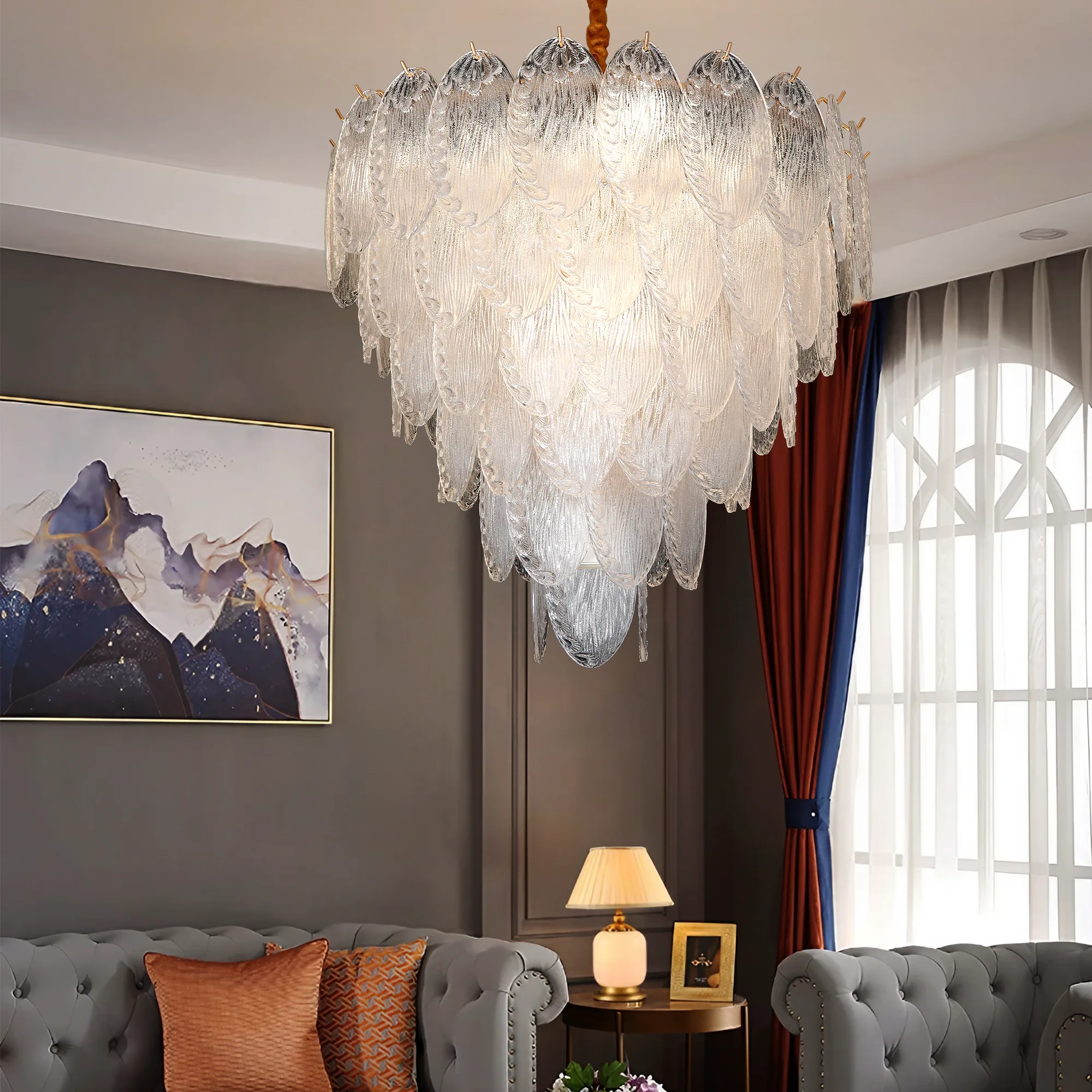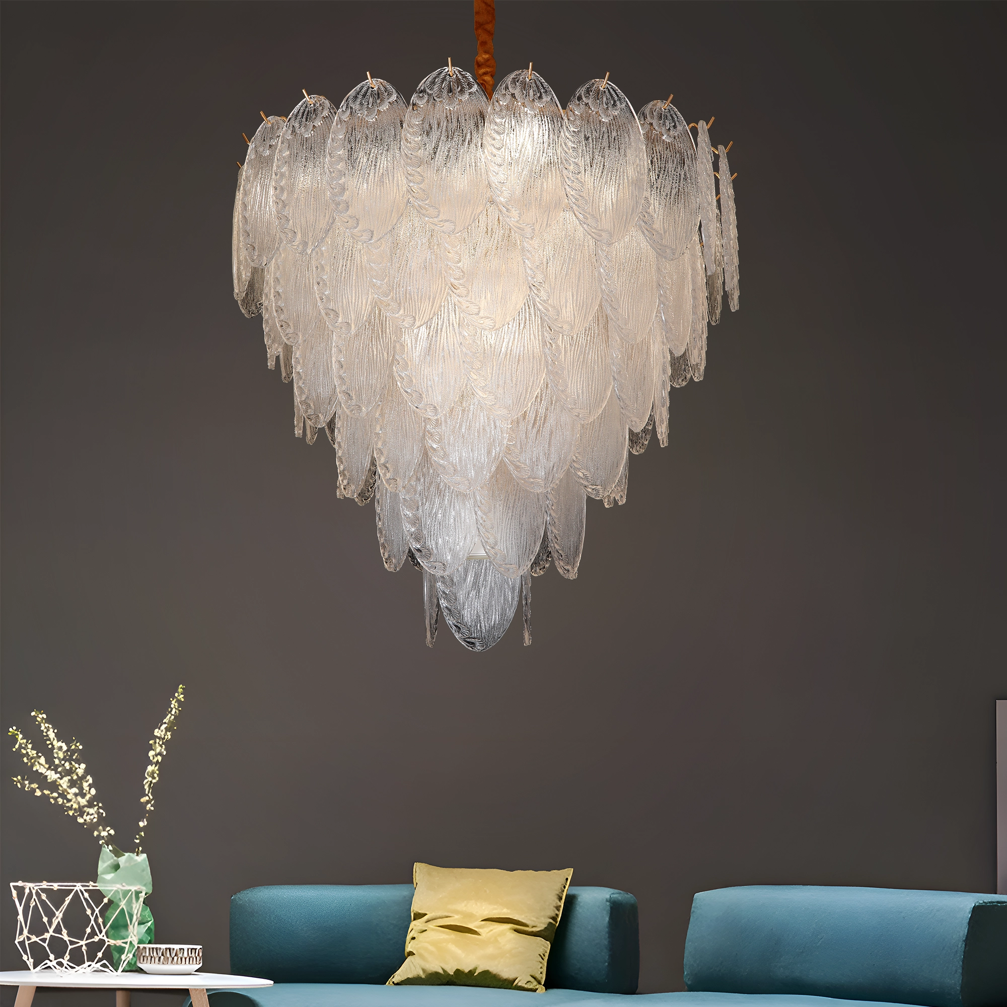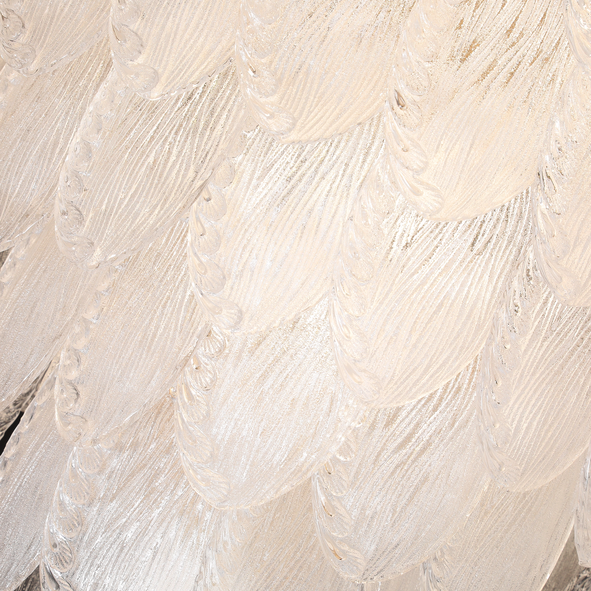Discover the captivating beauty of the Whispering Leaf Motif Glass Chandelier, a masterpiece of light and form that brings an organic, serene presence to any grand interior. This large-scale chandelier is distinguished by its tiers of delicately formed glass pieces, each resembling a frosted leaf or a gentle frond. The subtle textures within the glass create a soft, diffused light, evoking a tranquil and inviting atmosphere. Suspended from a sleek metallic top in a warm gold or brass finish, its naturalistic design provides a unique blend of artistry and illumination. Perfect for creating a focal point in a double-height living room, adding a sophisticated touch to a master suite, or enhancing the natural light in a sunroom or conservatory. This leaf motif glass chandelier is a statement piece for modern organic, transitional, and nature-inspired luxury decor. With its intricate craftsmanship and ability to transform light into a soft, ambient glow, the Whispering Leaf Motif Glass Chandelier promises to be a timeless addition, offering both functional elegance and unparalleled visual allure.