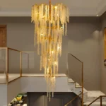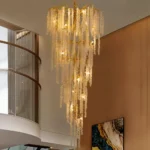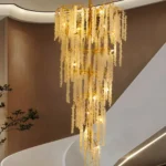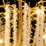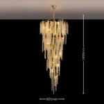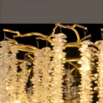 Transform your space into a winter wonderland with this breathtakingly beautiful chandelier. Drawing inspiration from nature, it features long icicles hanging from golden tree branches, creating a stunning visual spectacle. The branches, finished in a warm golden hue, are adorned with clear crystals that sparkle and shine like diamonds, bringing an organic and modern feel to your home. Whether hung in a stairway, large living room, or entryway, this spectacular statement piece will be the centerpiece of any space. With its pure and romantic charm, it will bring a touch of glamour and sophistication to your decor. So, if you’re looking to make a bold design statement in your home, this chandelier is a must-have addition.
