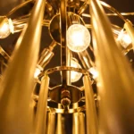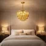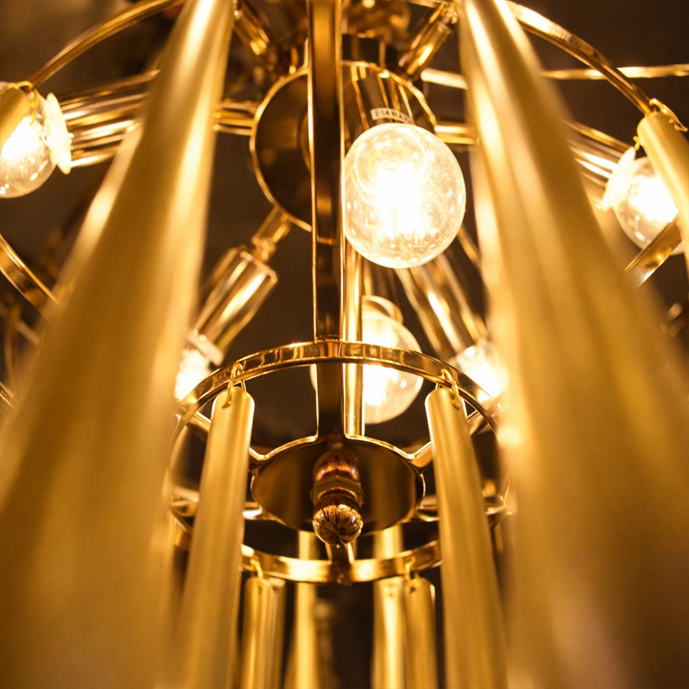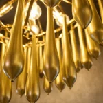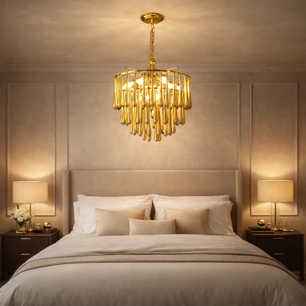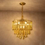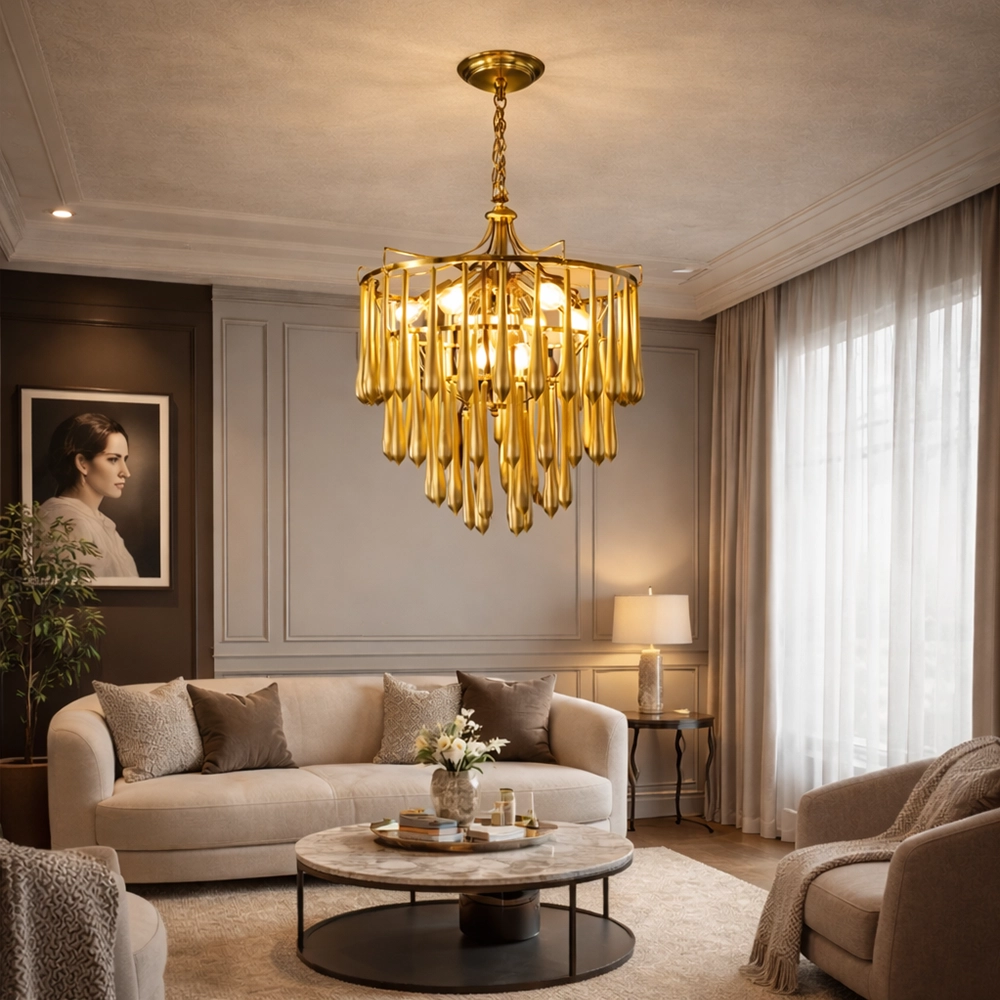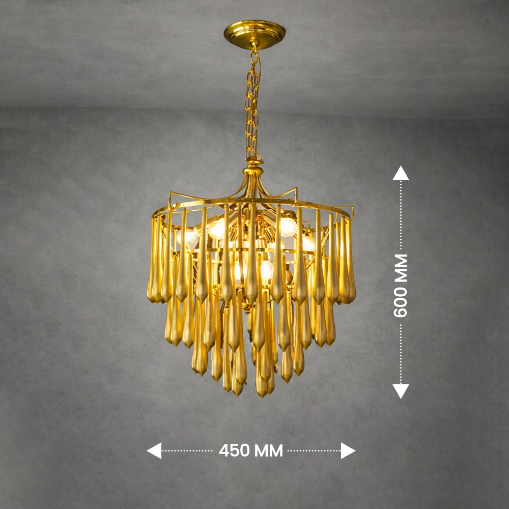 The Zyrelith CrownDrop Gold Chandelier is a modern luxury ceiling light designed to add sophistication and warm brilliance to contemporary interiors. Featuring a structured gold frame with layered elongated drop accents, this designer chandelier creates a rich cascading effect that enhances ambient lighting while maintaining a refined silhouette.