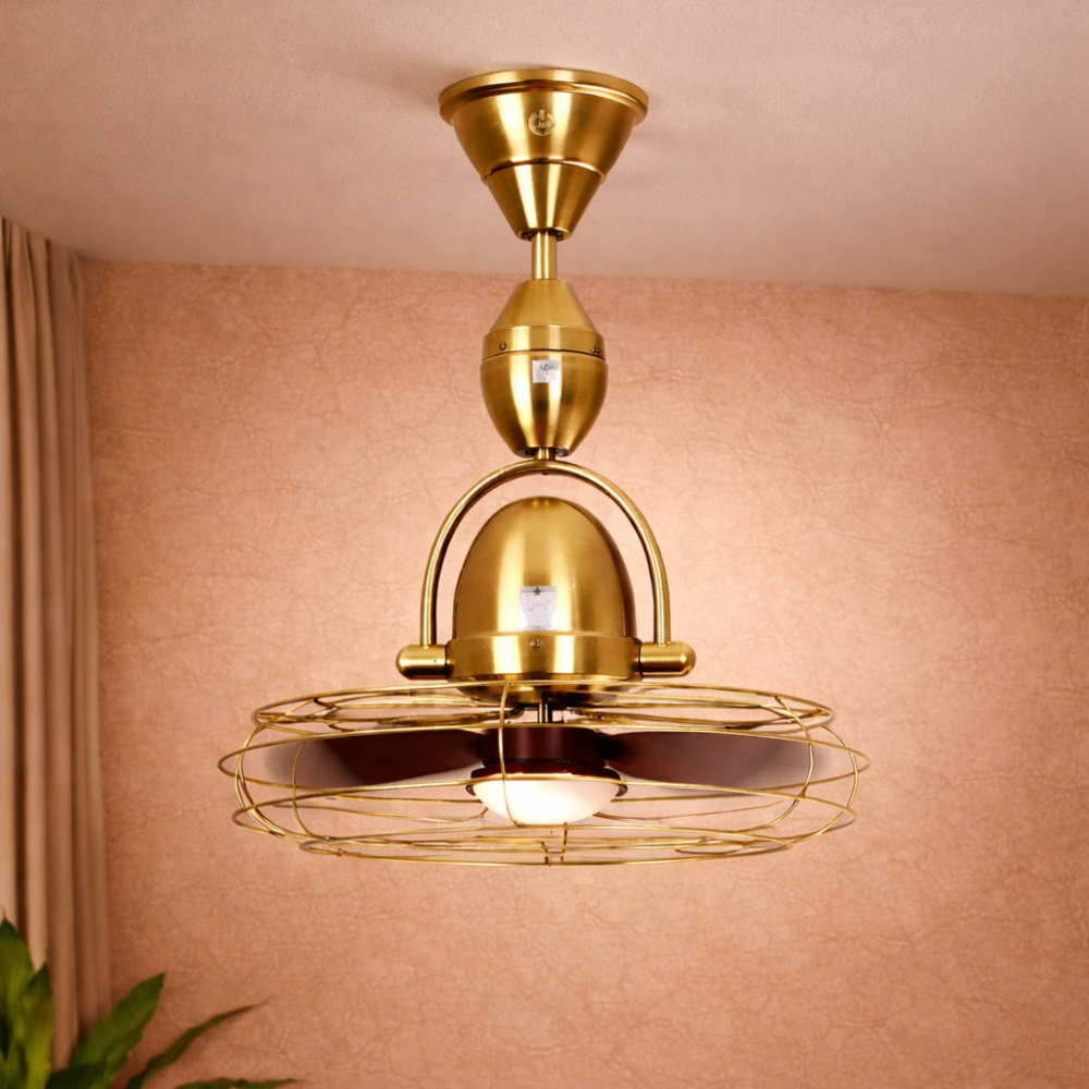 This Toucan Golden Ceiling Fan features a radiant brass finish, natural wood blades, and a space-saving design with Cage perfect for bedrooms, home offices, or cozy nooks. It delivers quiet, efficient airflow while doubling as a stunning antique-style decor piece. Ideal for traditional, rustic, or industrial interiors.