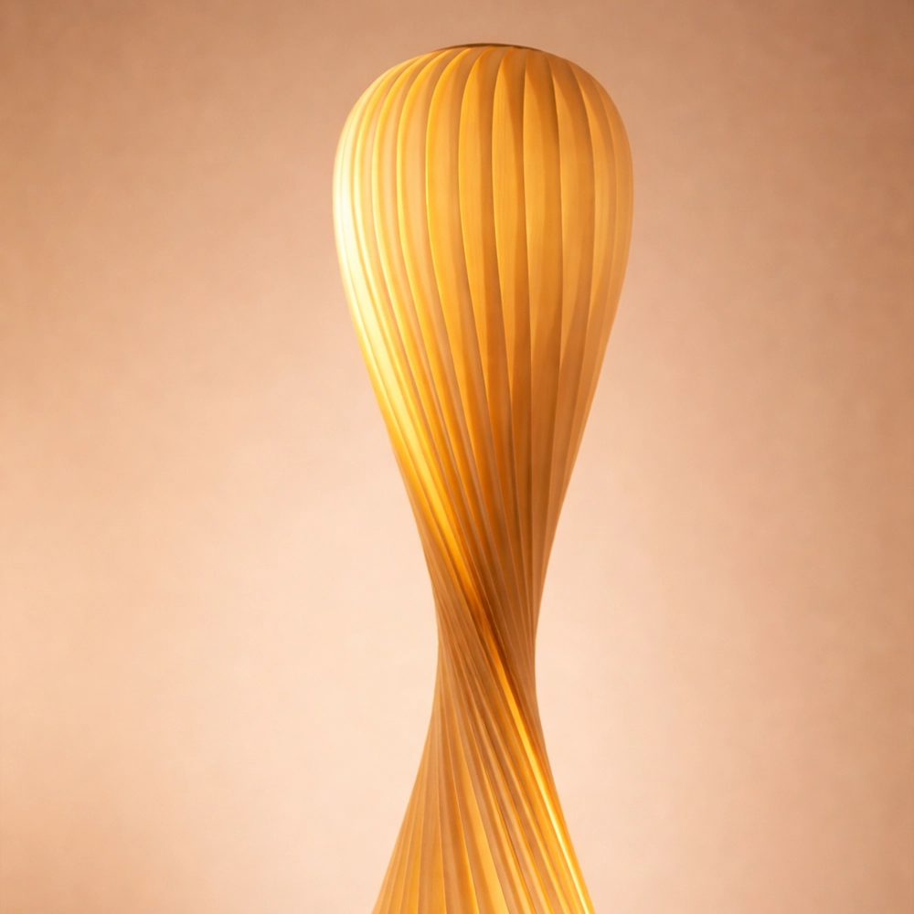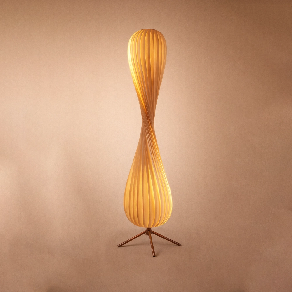 Liora Helix is a sculptural floor lamp featuring a softly twisted vertical form that diffuses light through its ribbed surface. The warm glow highlights the flowing geometry, creating a calm yet striking presence. Designed for modern living spaces, reading corners, and design-forward interiors that seek functional art.