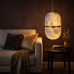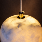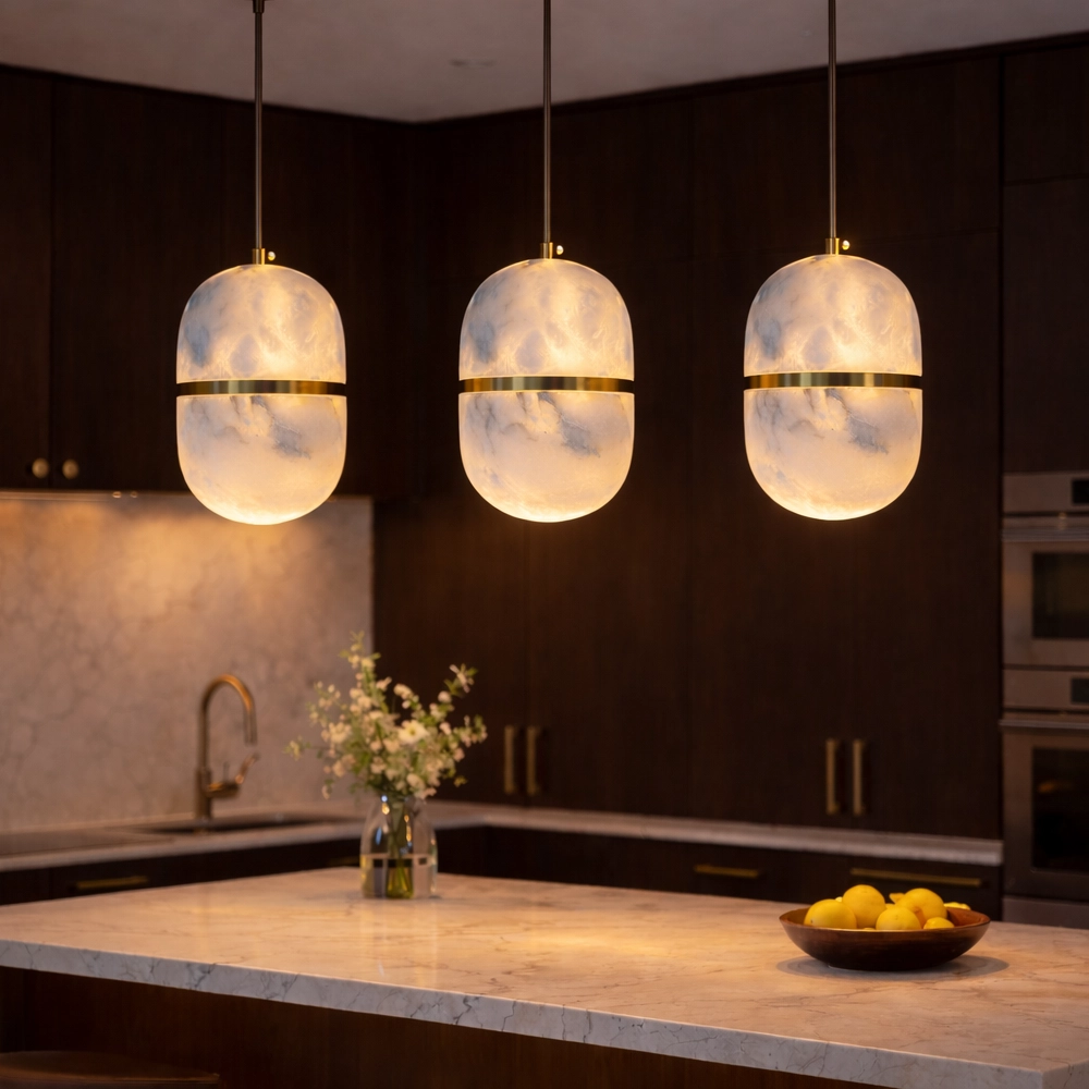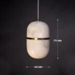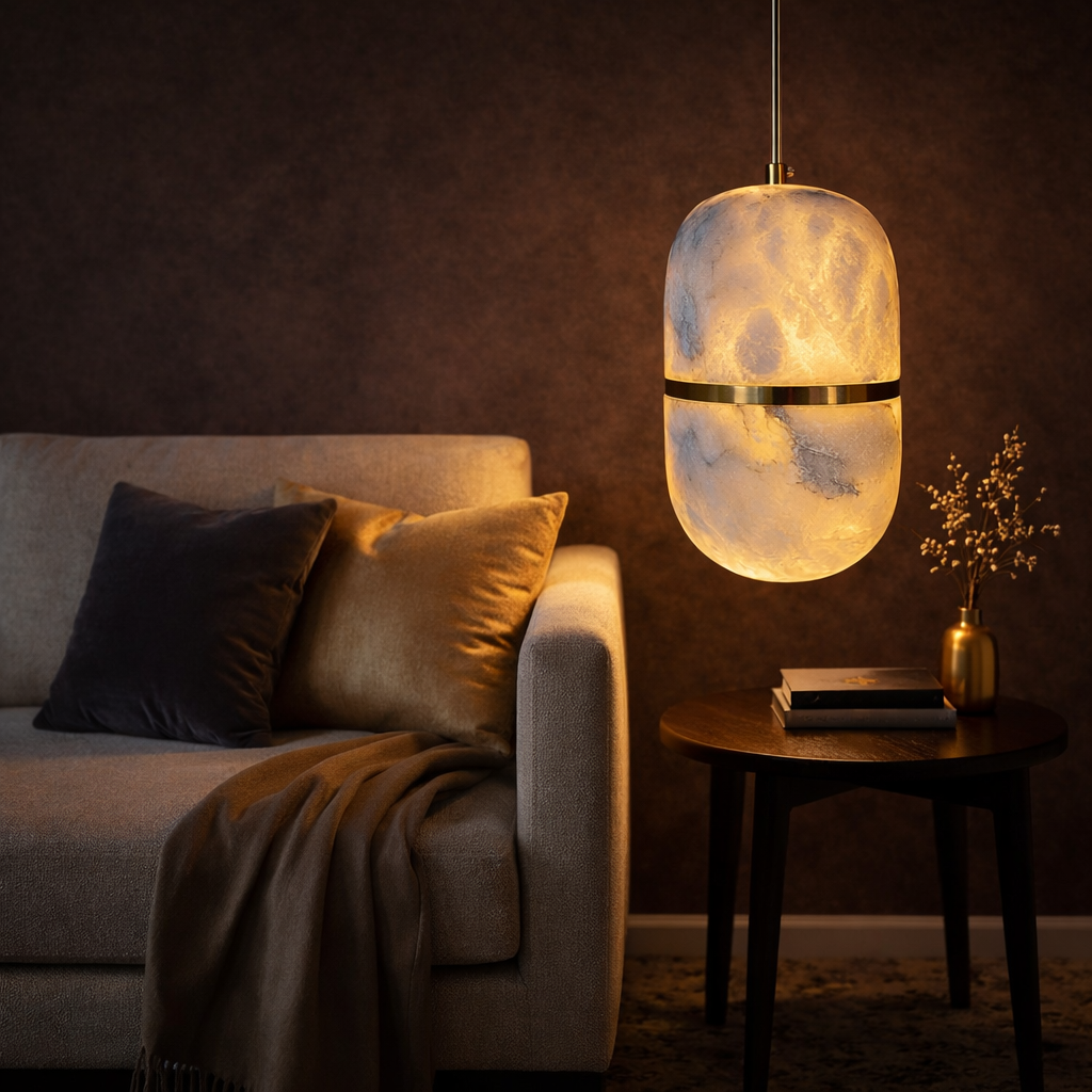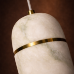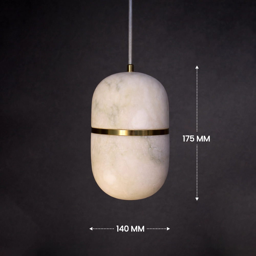 Alba Capsule is a refined pendant light featuring a smooth capsule-shaped marble shade accented with a slim brushed brass band. The natural stone softly diffuses light, creating a warm, ambient glow with subtle veining detail. Ideal for bedside lighting, dining clusters, and contemporary interiors that favor clean form with material richness.