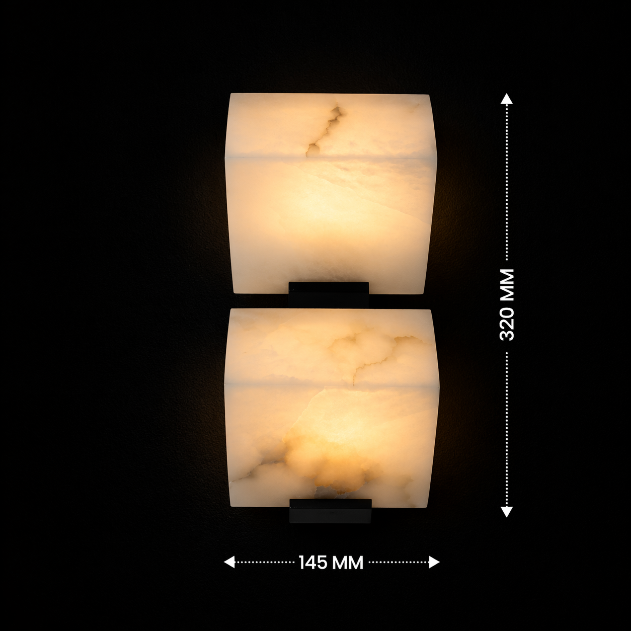Altura Dual is a sculptural wall light featuring two faceted marble blocks mounted on a minimal black bracket. The geometric stone forms softly diffuse light, creating a warm layered glow with natural veining detail. Ideal for hallways, bedside walls, and contemporary interiors that value architectural lighting with material presence.