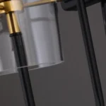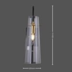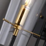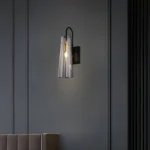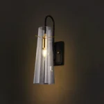 Elevate your contemporary interior with the striking Apex Cone Minimalist Black Wall Sconce, a fusion of sleek design and ambient illumination. This distinctive fixture features a robust matte black metal backplate and arm, providing a strong, minimalist foundation. Suspended gracefully is a sophisticated tapered clear glass shade (with a subtle smoked or grey tint), allowing the warm glow of the exposed bulb to create an inviting atmosphere. A prominent gold-finished accent ring or band adds a touch of refined luxury and visual interest. Perfect for enhancing hallways, adding sophisticated task lighting in a study, or creating a focal point in a modern living room or bedroom. This industrial-chic black and gold wall light is crafted with high-quality materials for durability and a premium feel, ensuring long-lasting beauty and performance. The Apex Cone is an ideal choice for homeowners and designers seeking a unique blend of functionality, artistic flair, and a bold contemporary statement.
