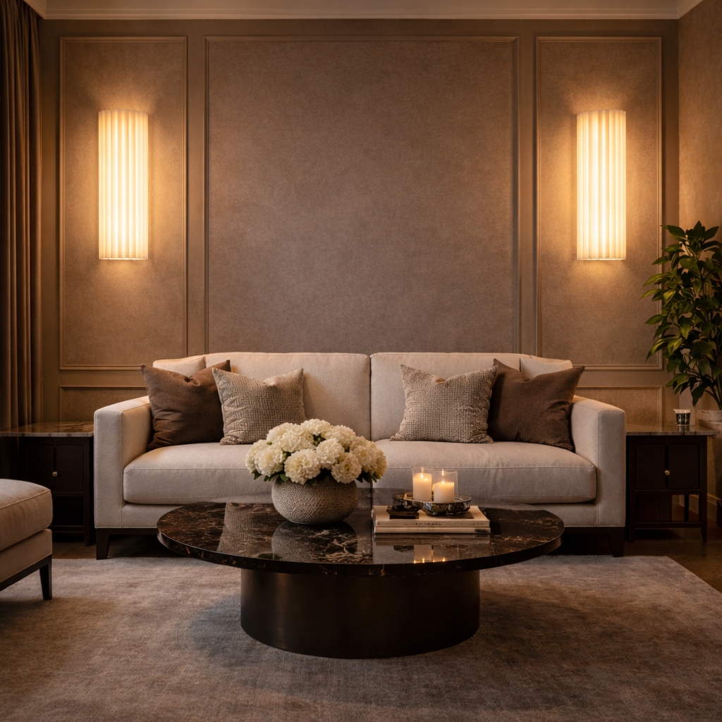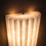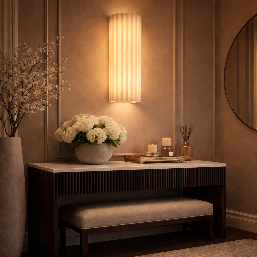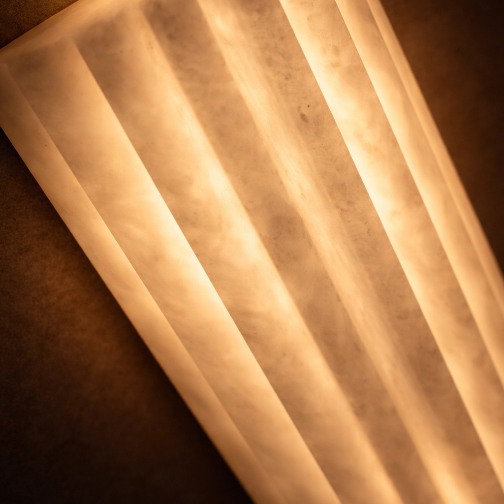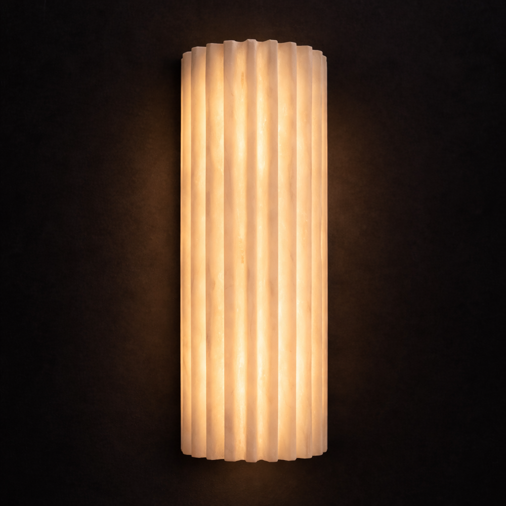 Arvona is a vertical wall light crafted from fluted marble that gently diffuses light through its ribbed surface. The elongated cylindrical form creates a soft, even glow while emphasizing the natural veining of the stone. Ideal for corridors, bedside installations, and contemporary interiors seeking refined architectural lighting.