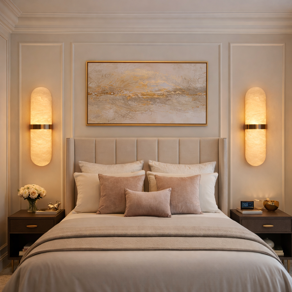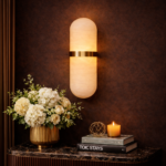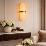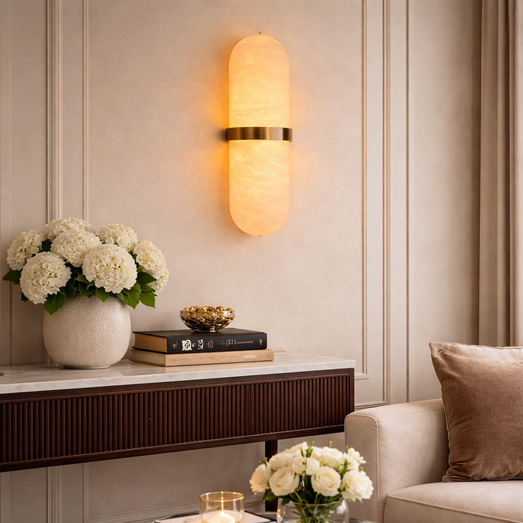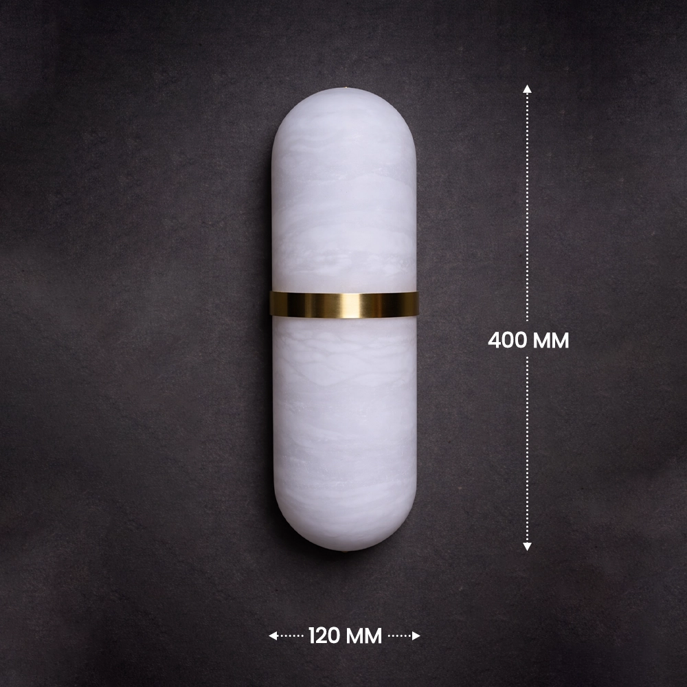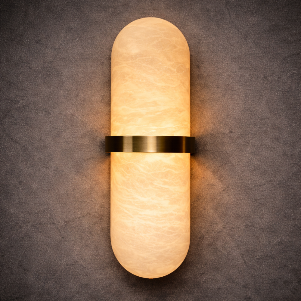 The Auralis Capsule Marble Wall Sconce is a sleek modern lighting fixture that combines sculptural simplicity with the natural elegance of marble. Designed in a smooth capsule silhouette, the elongated marble diffuser emits a soft, warm glow that gently illuminates surrounding surfaces while showcasing the subtle beauty of natural stone.