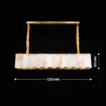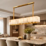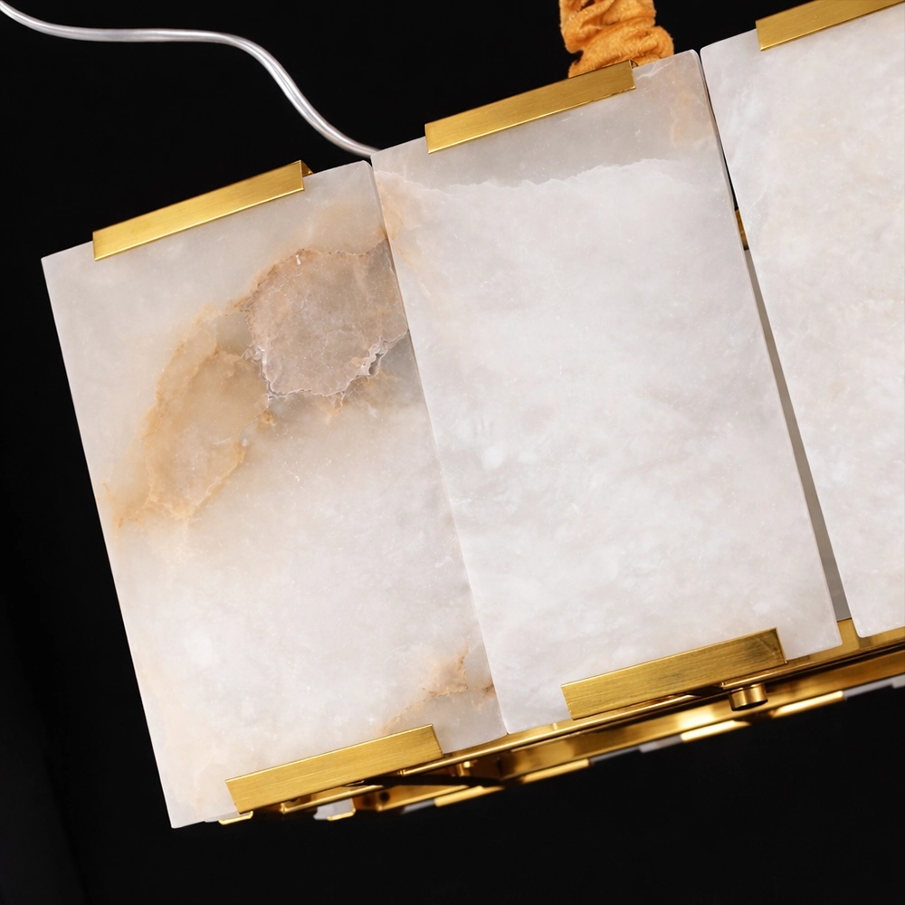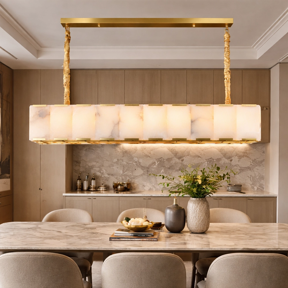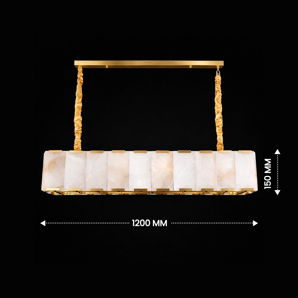 Aurelia is a sophisticated linear chandelier featuring hand-set marble panels framed within a sleek brass structure. The elongated form casts a warm, balanced glow across dining tables and kitchen islands, while the natural veining of the stone adds depth and individuality. Designed for contemporary interiors that blend architectural lines with refined material luxury.