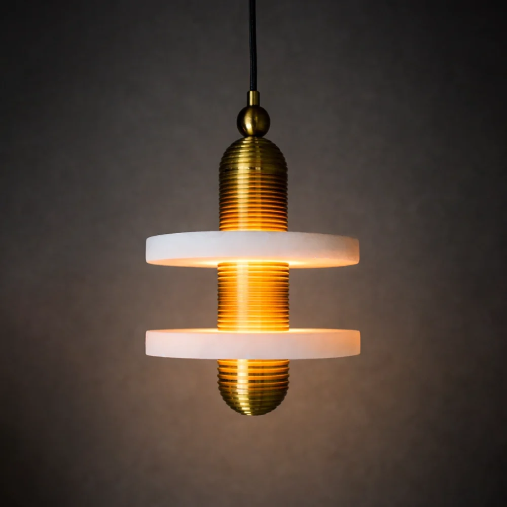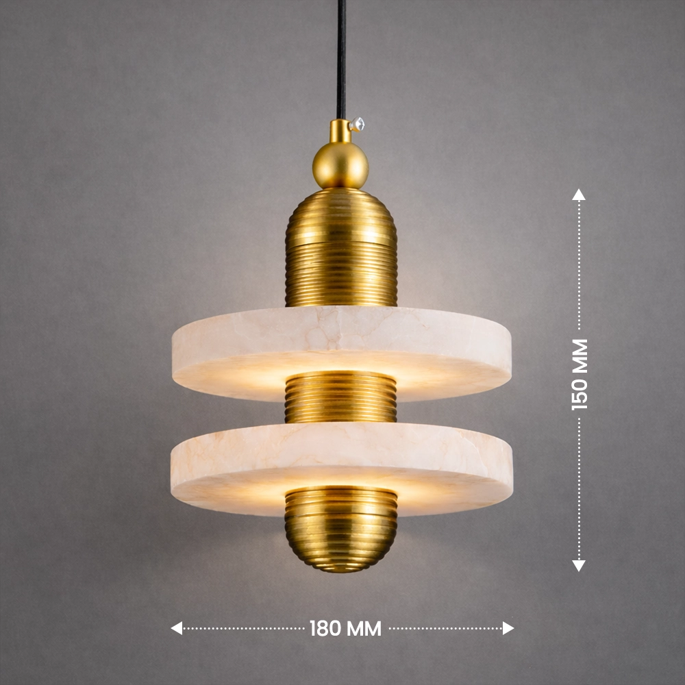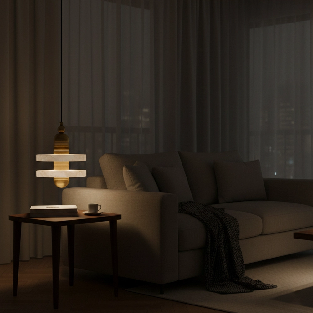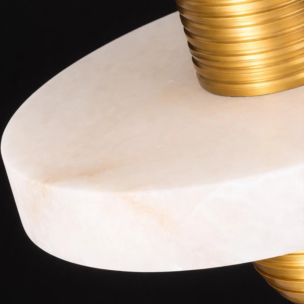 Aurelis Dual Halo is a sculptural pendant light featuring two floating marble-effect rings intersecting a ribbed brass core. The layered composition creates a striking halo glow while casting warm, balanced illumination above and below. Designed for dining areas, statement foyers, and contemporary interiors that embrace architectural lighting with luxury materials.