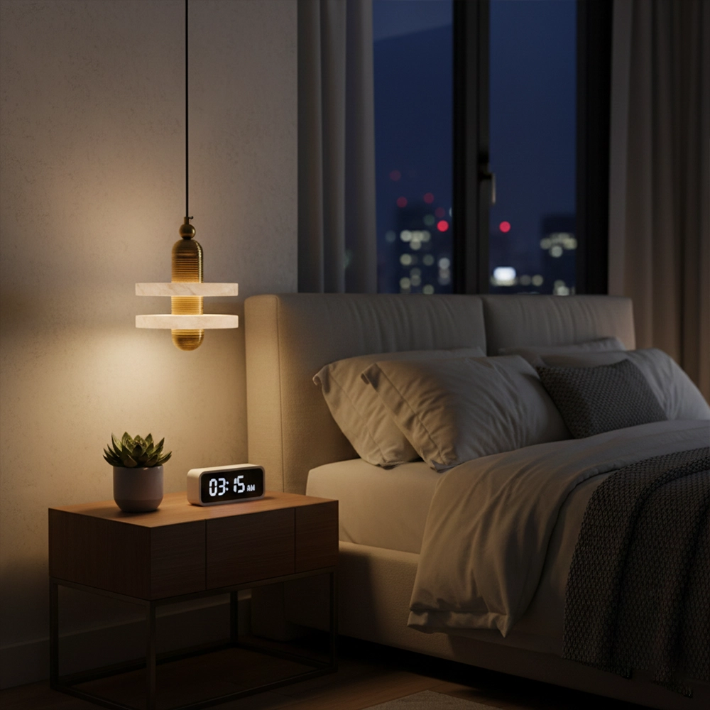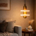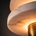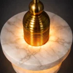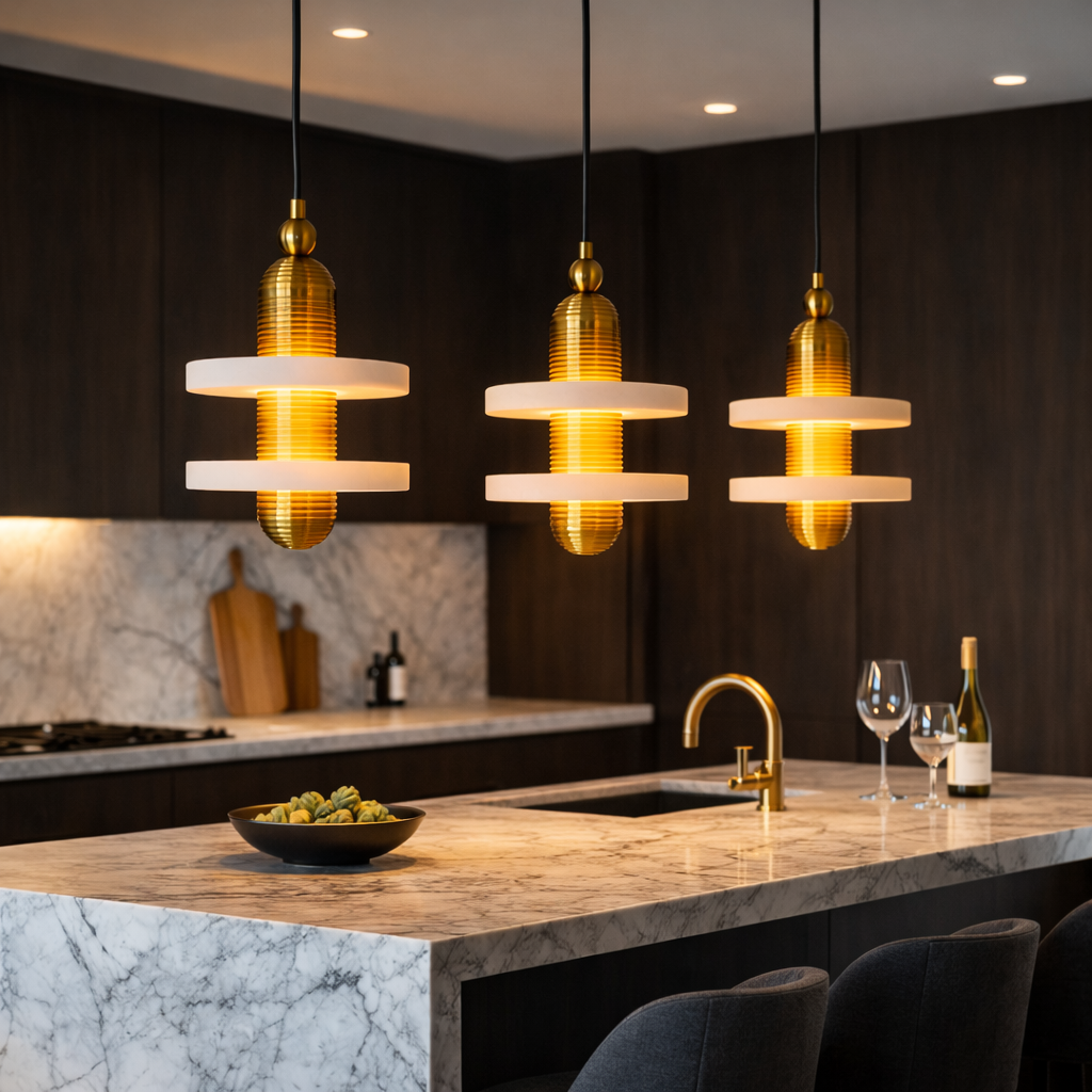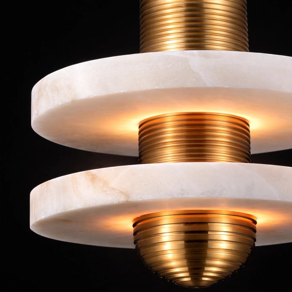 Aurelis Dual Halo is a sculptural pendant light featuring two floating marble-effect rings intersecting a ribbed brass core. The layered composition creates a striking halo glow while casting warm, balanced illumination above and below. Designed for dining areas, statement foyers, and contemporary interiors that embrace architectural lighting with luxury materials.