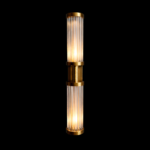 The Aurelius Dual Prism Glass Wall Sconce is a sophisticated architectural lighting piece designed to elevate modern interiors with its elegant symmetry and radiant glow. Featuring two vertically stacked ribbed glass columns framed by polished brass accents, this sconce diffuses light through precision-cut glass rods to create a warm, layered illumination.
