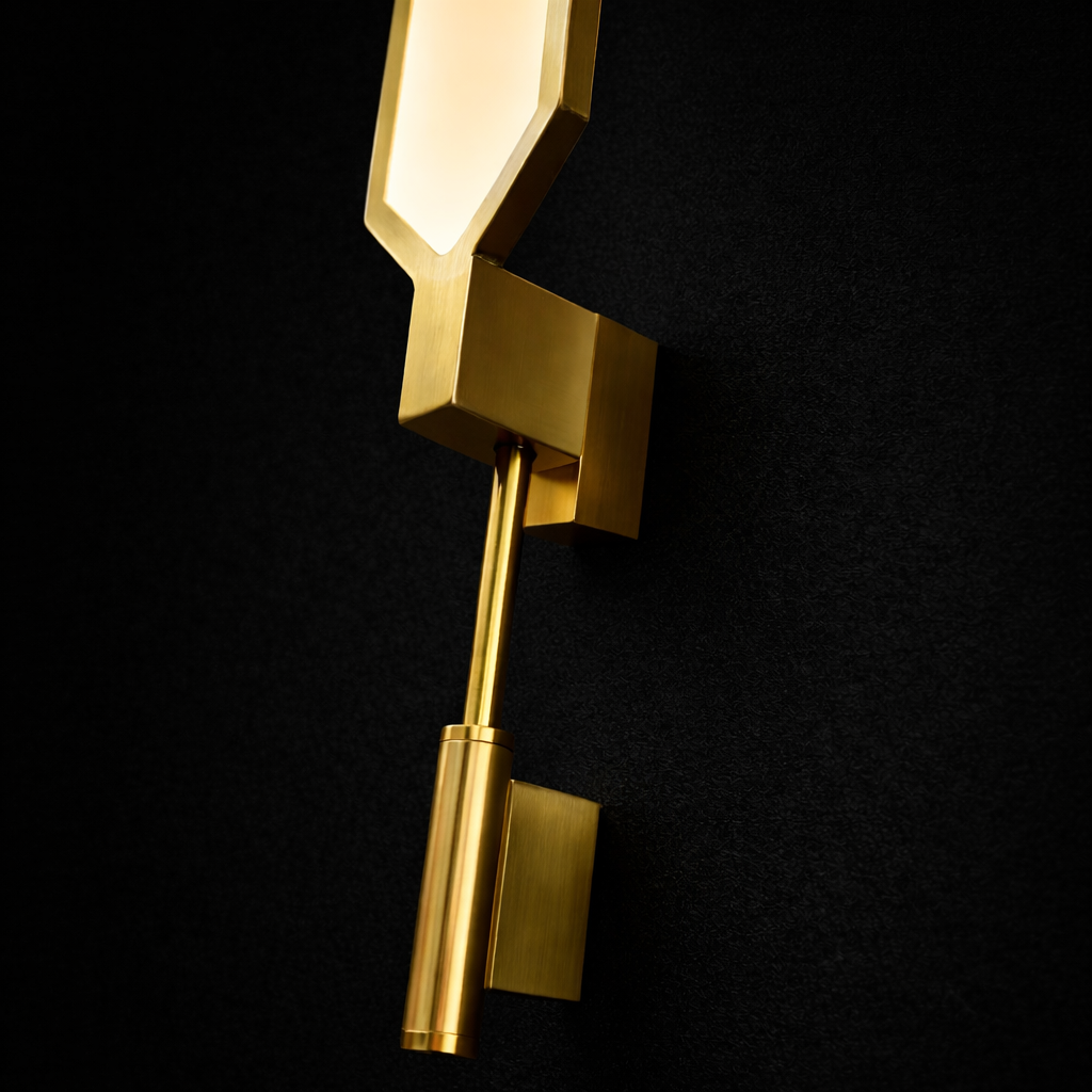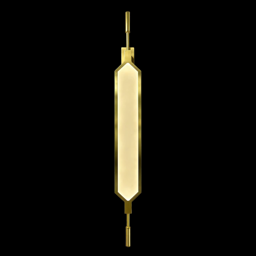 The Aureon Prism Vertical LED Wall Sconce is a bold architectural lighting piece designed to bring modern elegance and sculptural impact to contemporary interiors. Featuring an elongated prism-shaped illuminated core framed in brushed brass, this wall light emits a warm ambient glow that gently washes the surrounding wall with soft golden light.