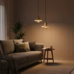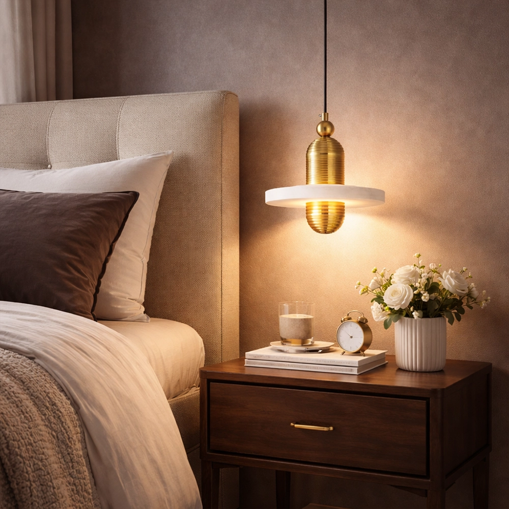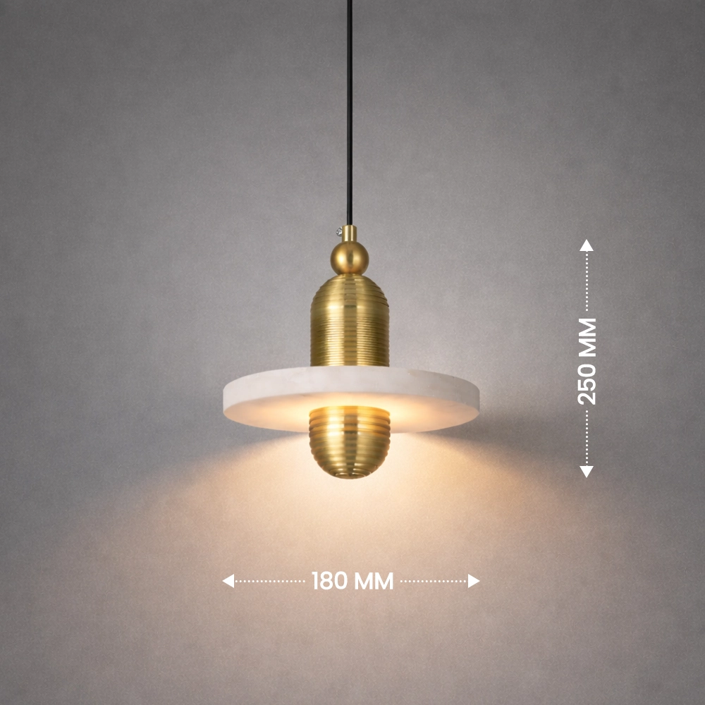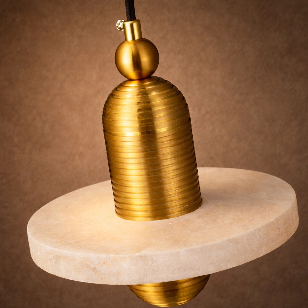 Aurexo Disc is a contemporary pendant light featuring a ribbed brass body intersected by a floating frosted glass ring. The layered form creates a soft halo effect while casting focused downward illumination. Ideal for dining spaces, bedside settings, and modern interiors that favor sculptural, design-led lighting.
