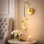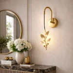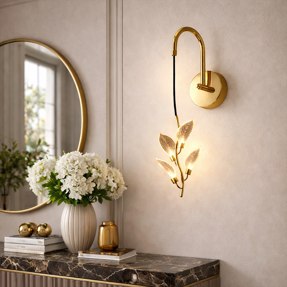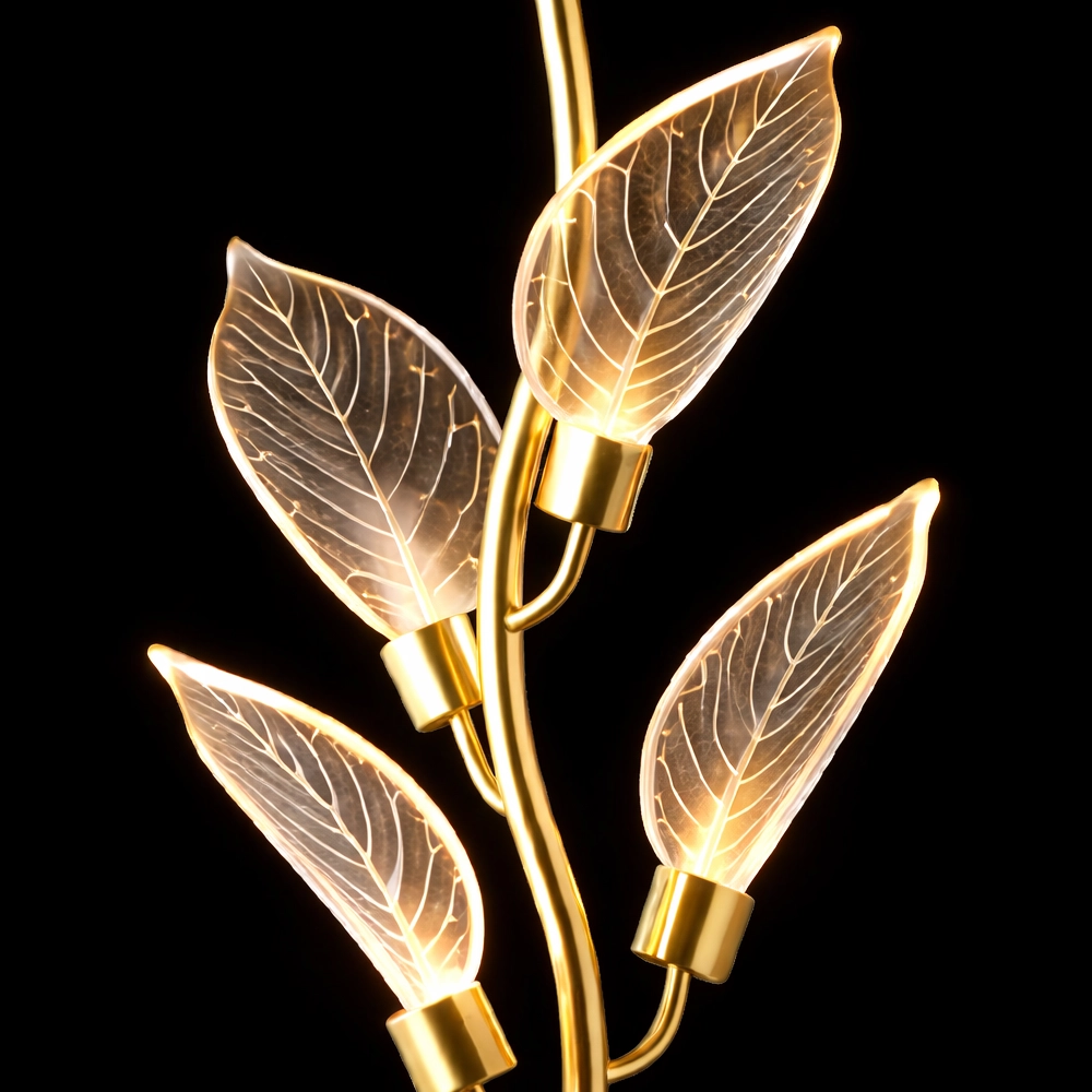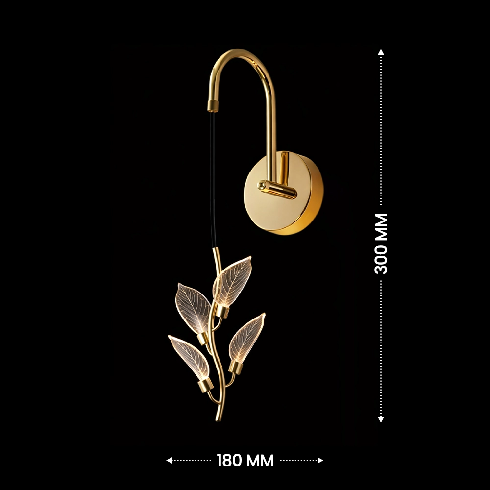 The Aurora Vine Crystal Leaf LED Wall Sconce captures the elegance of nature through a refined modern lighting design. Featuring a gracefully curved gold-finished arm, this wall light suspends a delicate vine of illuminated crystal leaves that appear to gently bloom with warm ambient light. Each leaf is intricately etched with natural vein patterns, allowing the LED illumination to glow softly through the translucent surface and create a subtle shimmering effect on surrounding walls.