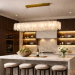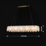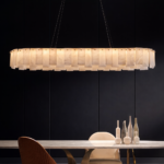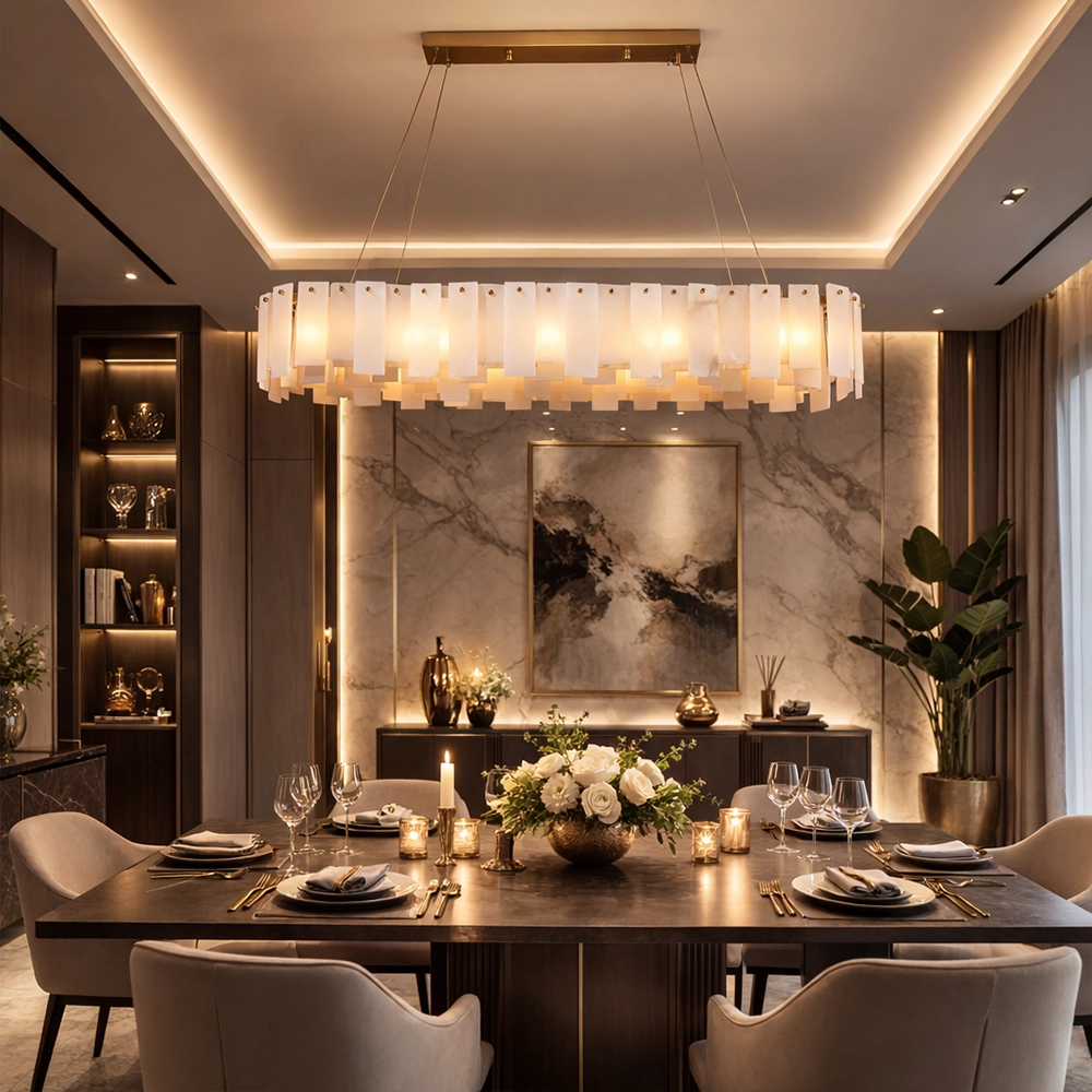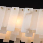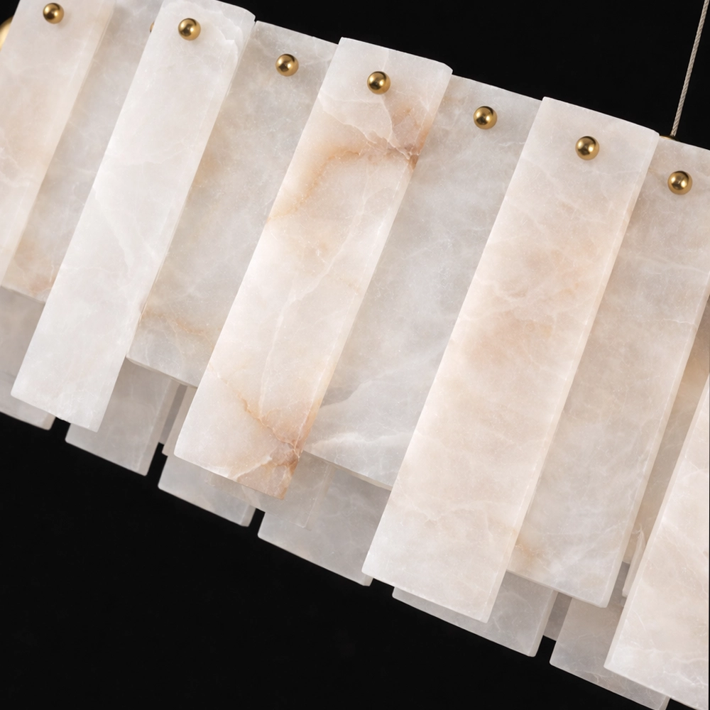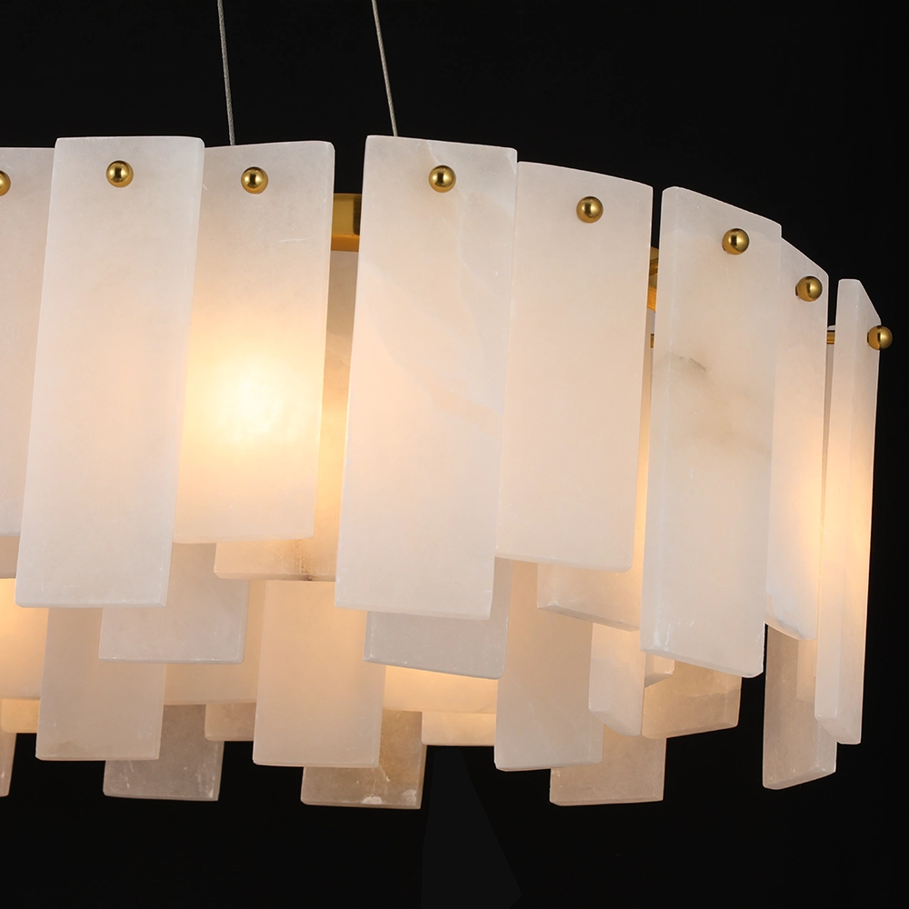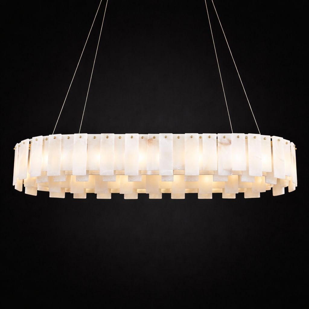 Averra Grand is a statement ring chandelier featuring layered marble panels suspended in a seamless circular form. The staggered stone elements diffuse light into a soft, radiant glow while subtle brass accents add refined contrast. Ideal for large dining spaces, luxury living rooms, and double-height interiors seeking architectural lighting with timeless material elegance.