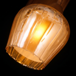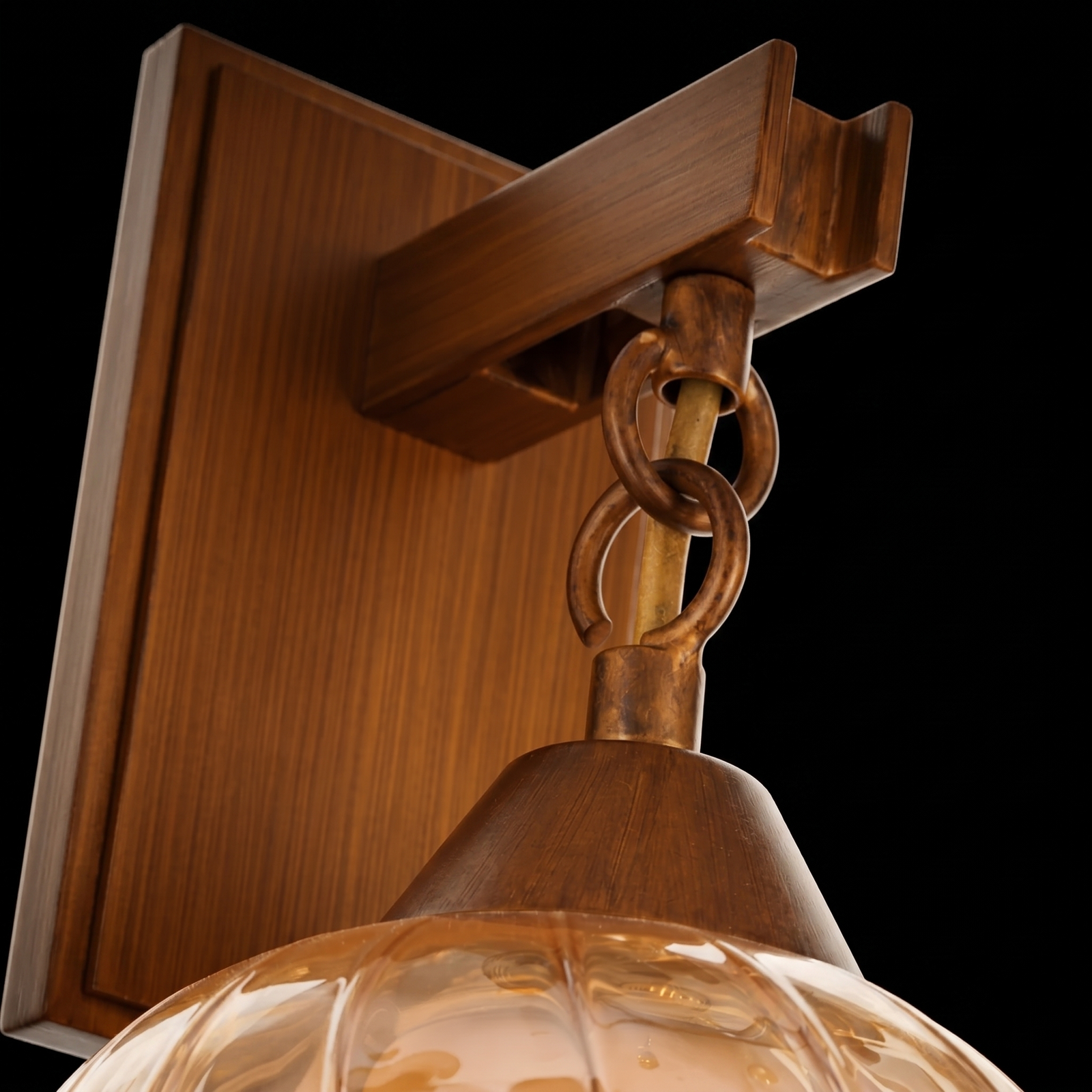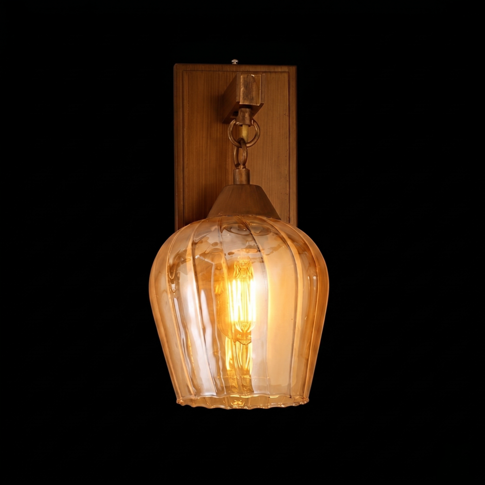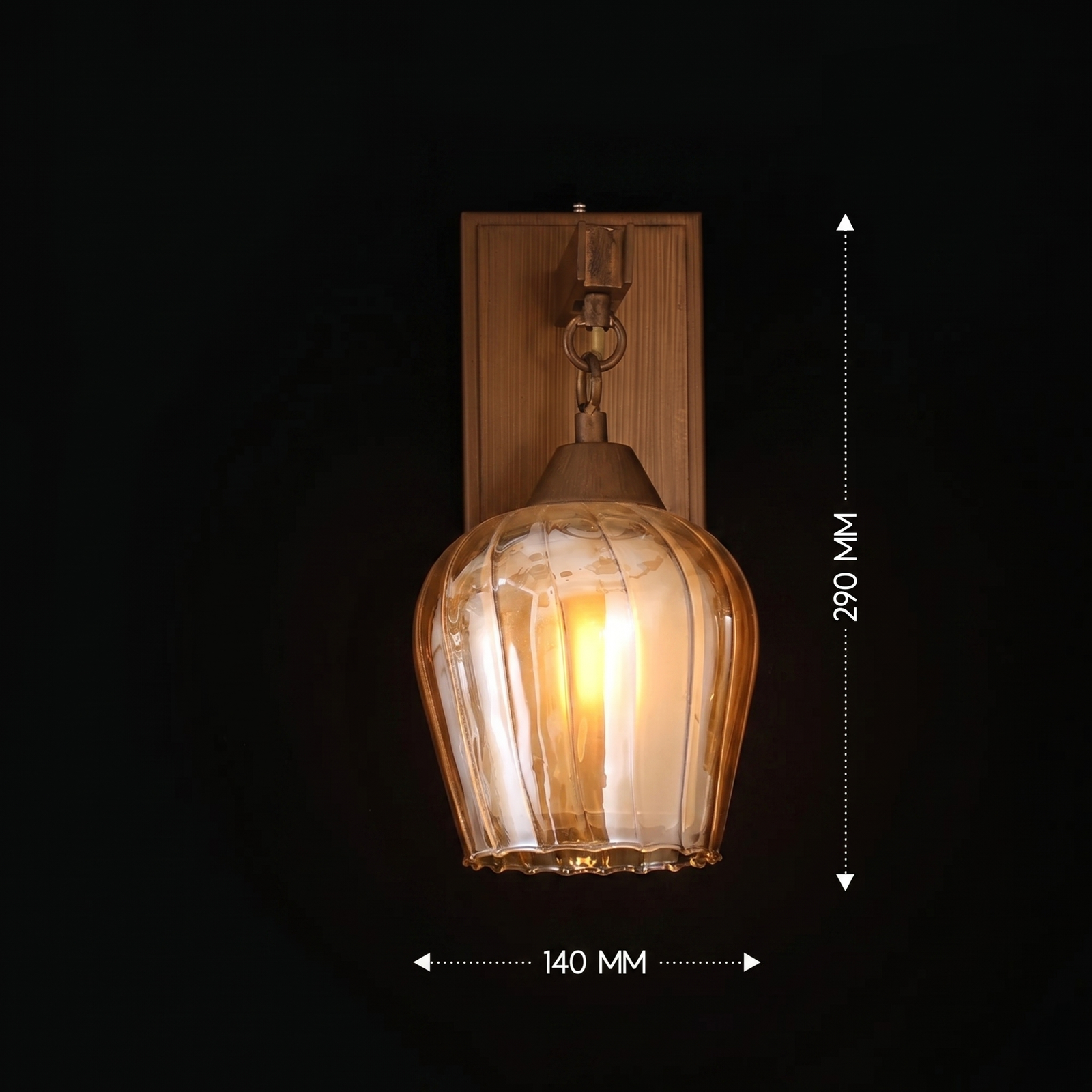 Caldera is a vintage-inspired wall lantern featuring a hand-shaped amber glass shade suspended from a solid metal backplate with chain detailing. The softly rippled glass enhances the warm glow of the light, creating a relaxed, atmospheric feel. Ideal for living spaces, reading corners, and boutique interiors that favor timeless warmth and character.