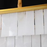 Cascara is a striking tiered chandelier crafted with layered marble panels suspended beneath a polished brass crown. The cascading stone elements create a sculptural silhouette while diffusing light into a warm, ambient glow. Ideal for dining rooms, foyers, and luxury interiors seeking statement lighting that blends natural stone texture with refined architectural form.