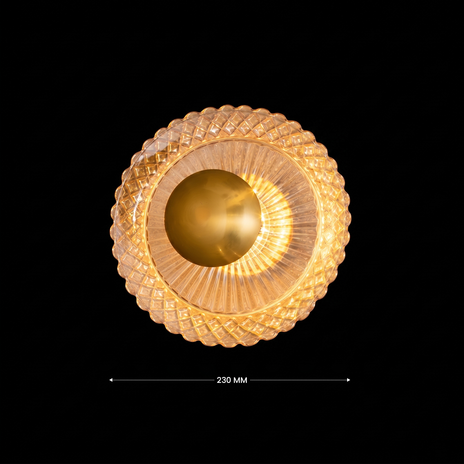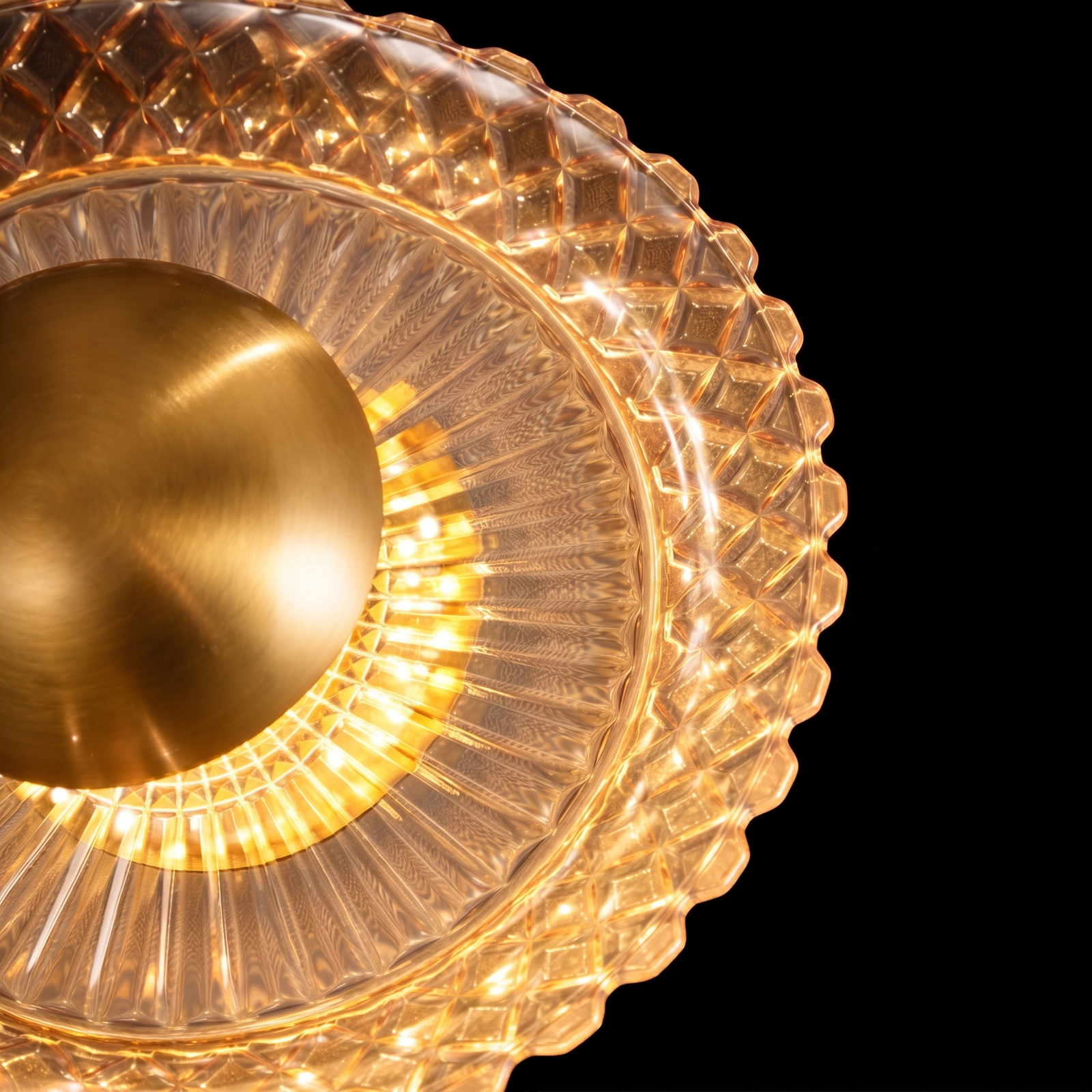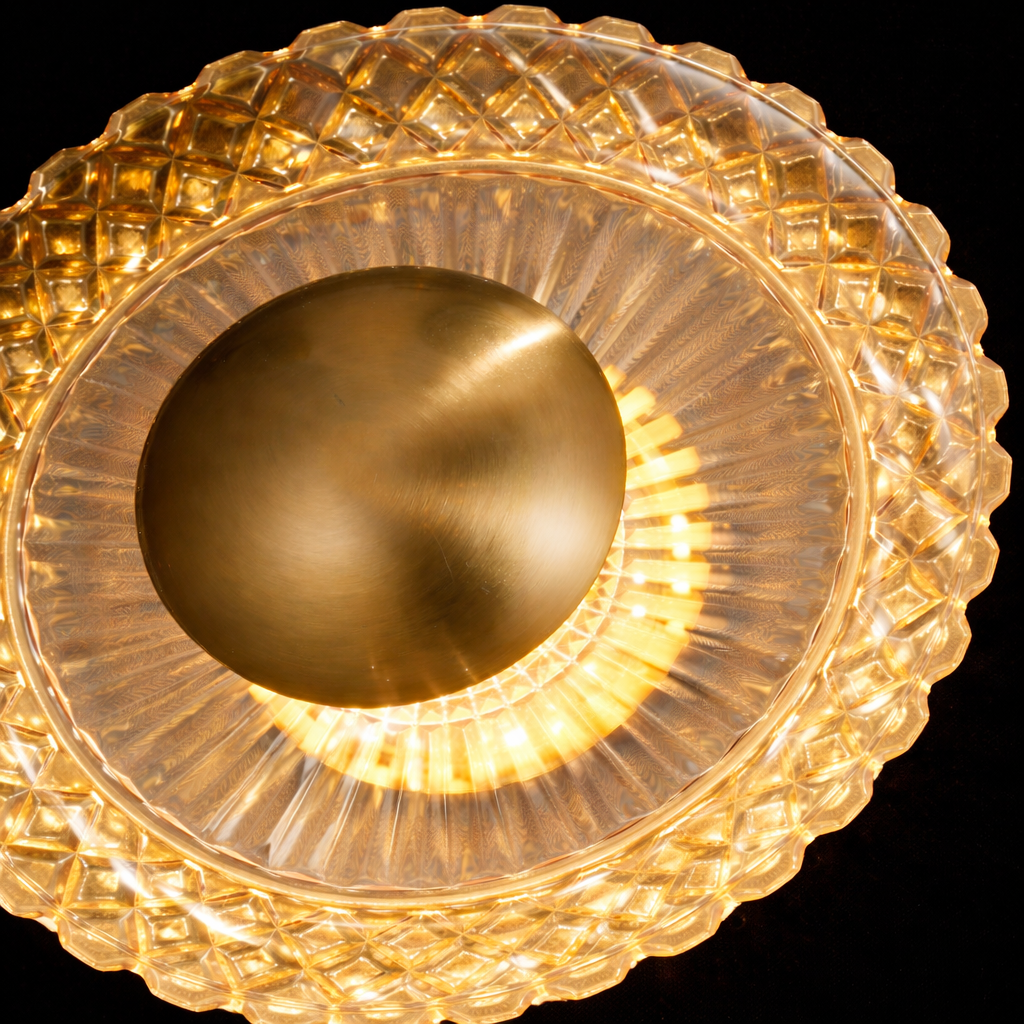 Facets of crystalline glass encircle a dominant gold orb, refracting light into a radiant corona like a diamond-crusted eclipse unveiling solar fury. This stellar beacon crowns opulent powder chambers, vaulted alcoves, and celestial observatories where prismatic rays herald cosmic rebirth.