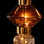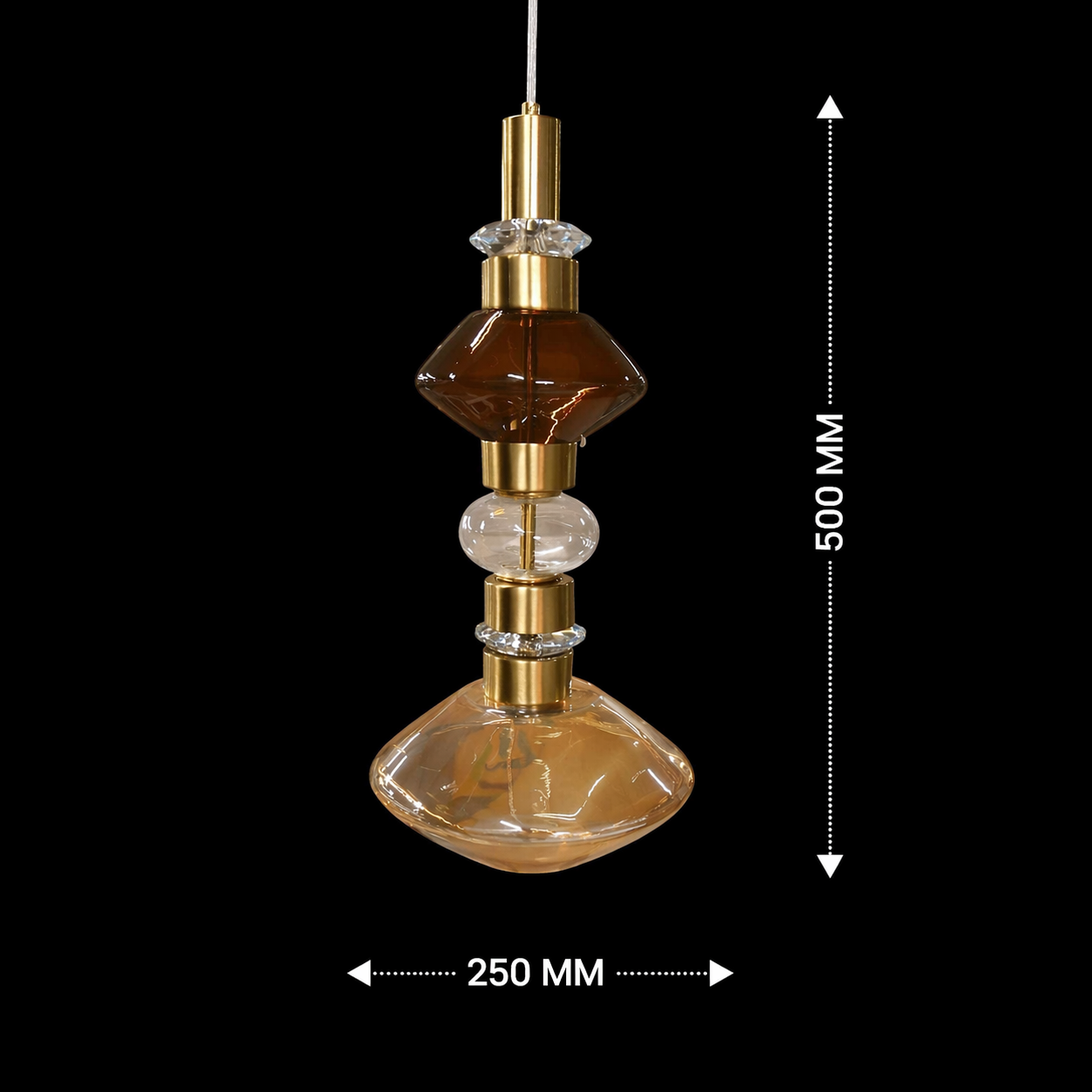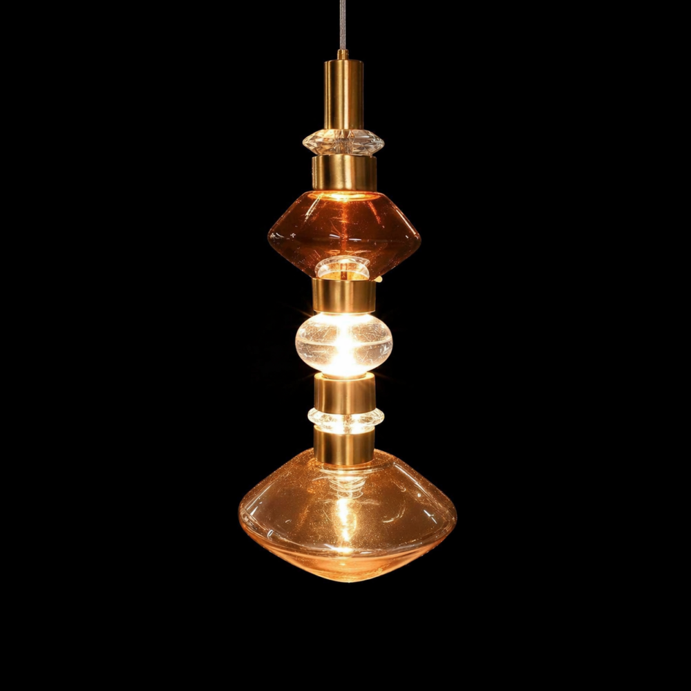 The Elvarique Amber Prism Luxe Pendant is a statement glass hanging light designed to bring sculptural elegance and warm sophistication to modern interiors. Featuring layered geometric glass elements in rich amber and clear crystal tones, accented with polished gold metal detailing, this designer pendant light creates a striking vertical silhouette that doubles as functional art.