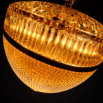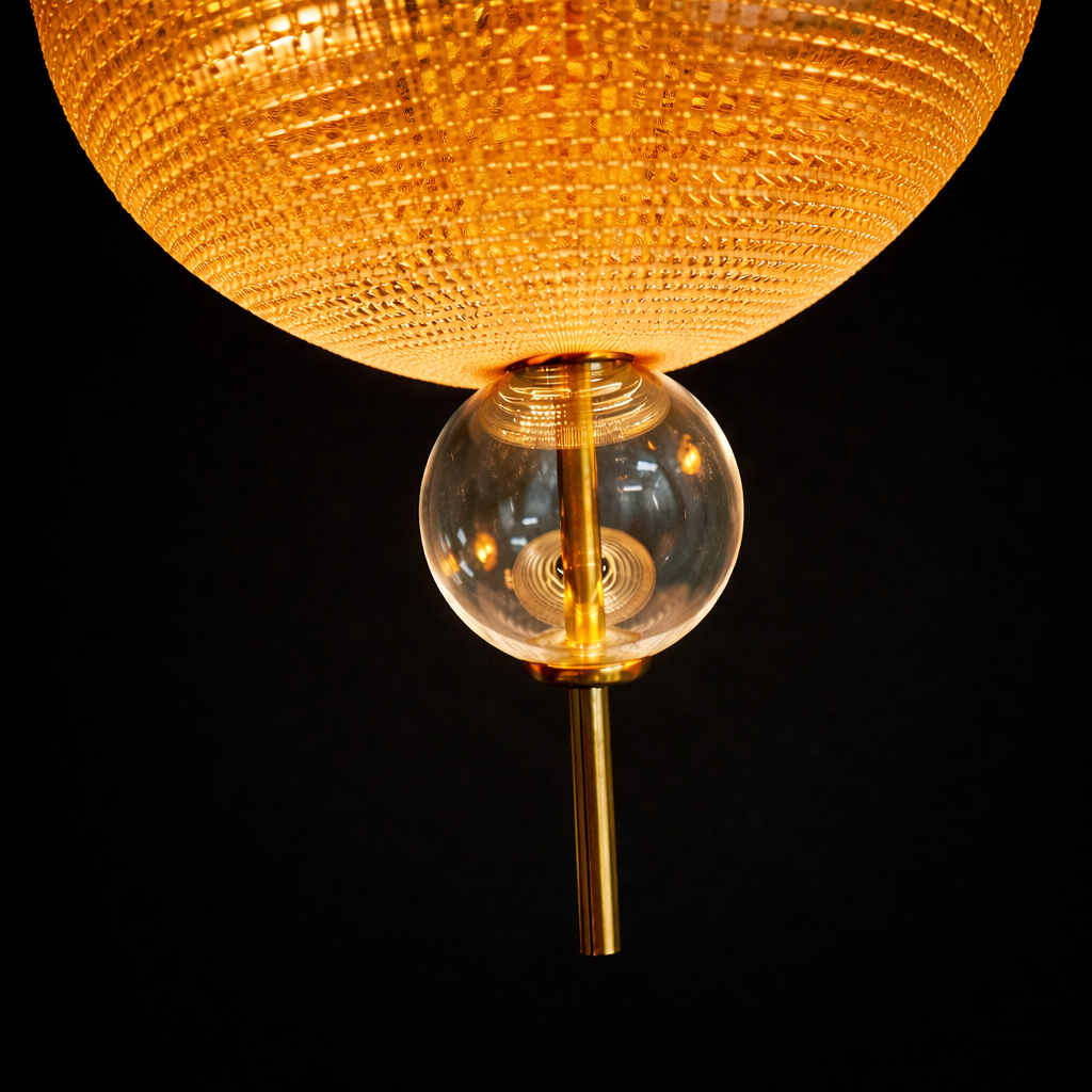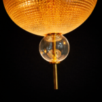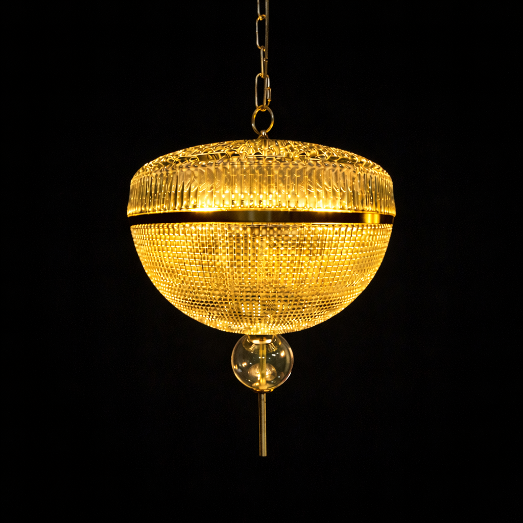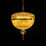 Transform interiors with the Gilded Ribbed Dome Pendant Light, showcasing a ribbed gold glass bowl suspended by chain, accented with clear bubble finial for luxurious diffused illumination. Ideal hanging chandelier for kitchens, dining areas, or lounges—target “gold ribbed glass pendant light India”. Brass accents ensure premium durability; dimmable for versatile modern or art deco styling.