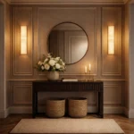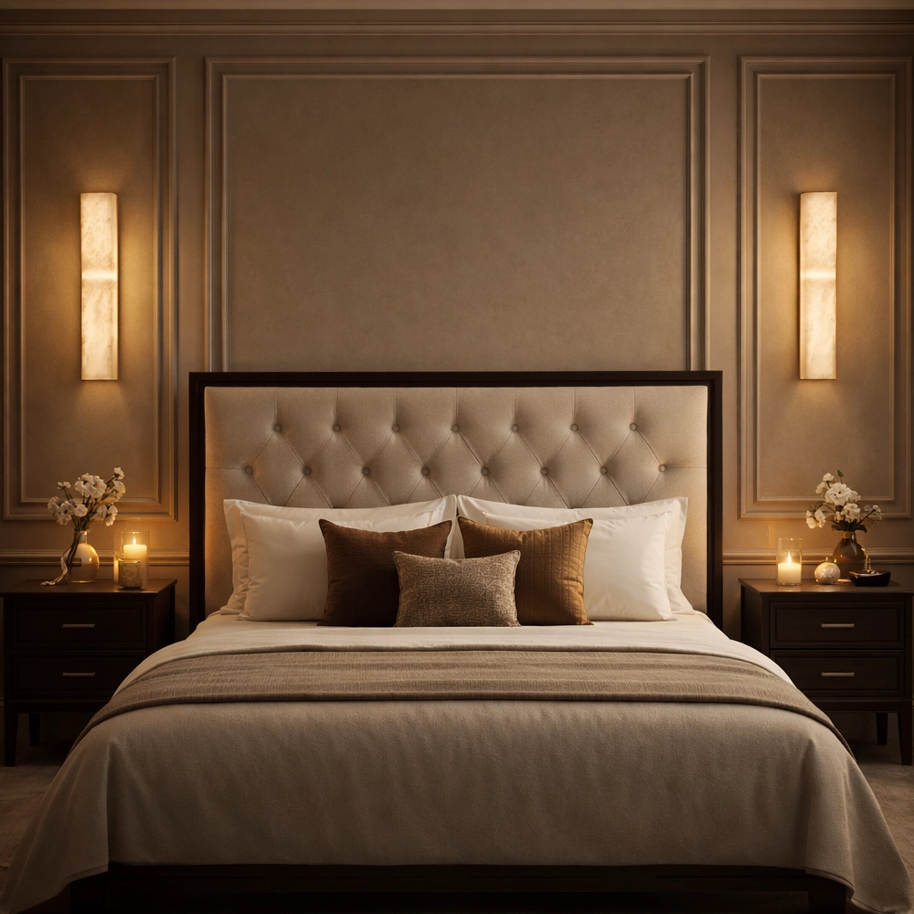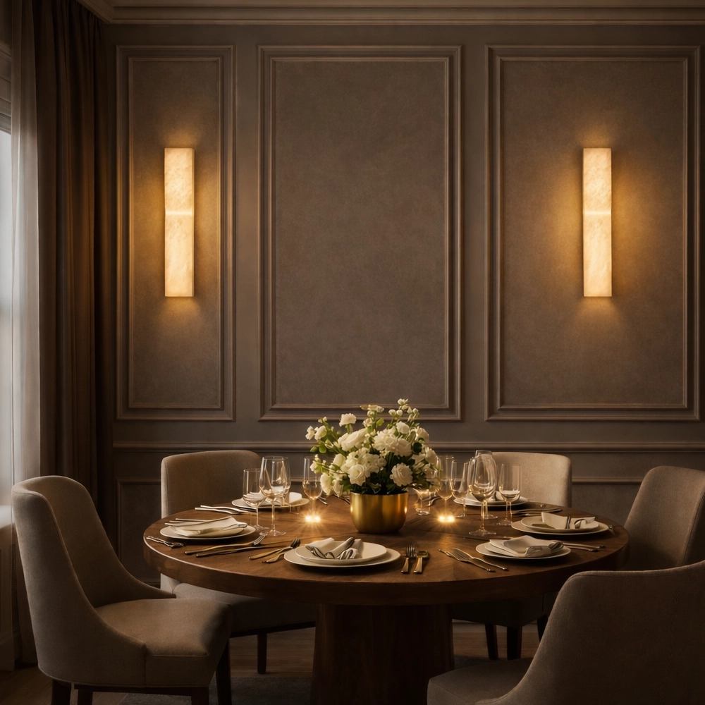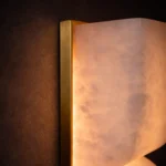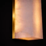 Lumiera Sculpted is a vertical wall light crafted from carved marble with a softly contoured center and a brushed brass backplate. The natural stone glows warmly when illuminated, highlighting its organic veining and refined silhouette. Ideal for hallways, bedside panels, and luxury interiors that favor architectural lighting with material depth.