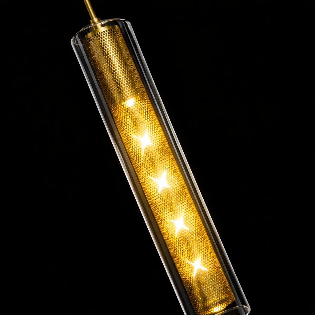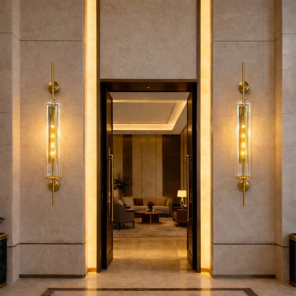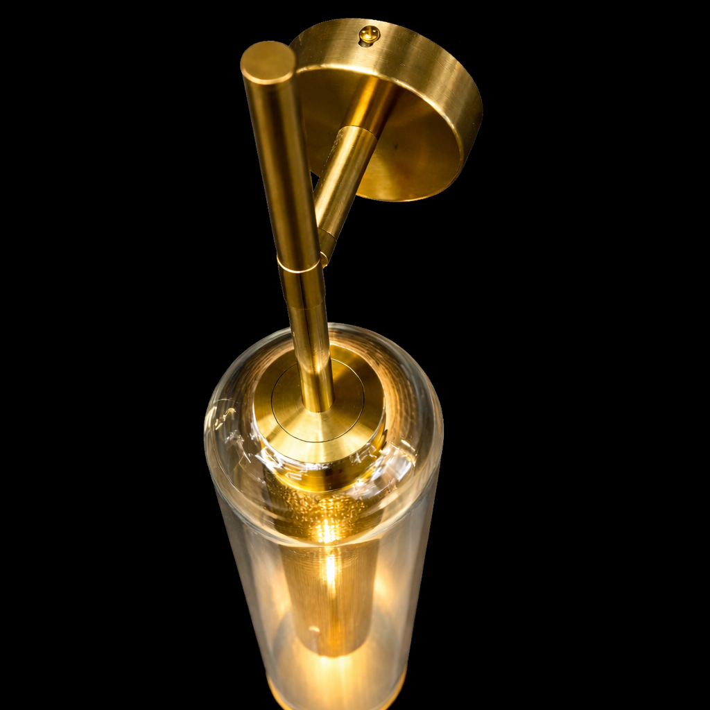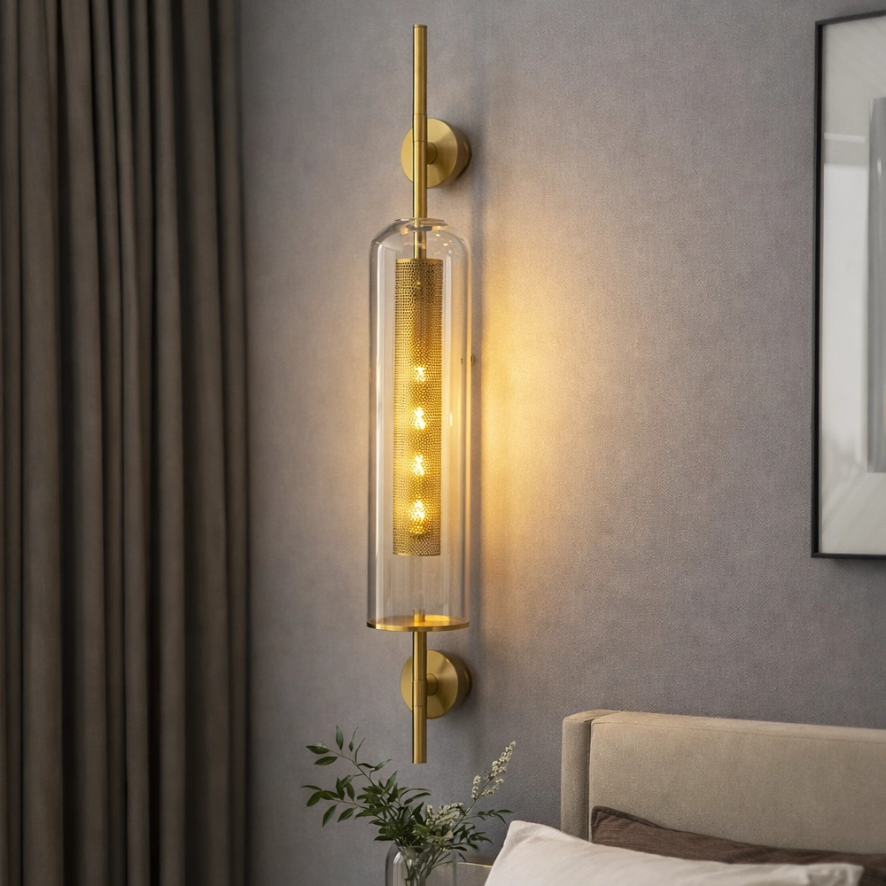 The Luminara Glass Column Wall Sconce is a refined fusion of modern elegance and architectural lighting design. Featuring a sleek cylindrical glass enclosure surrounding a perforated brass light core, this wall fixture creates a mesmerizing glow that radiates softly through the transparent glass while casting warm ambient light across surrounding surfaces.