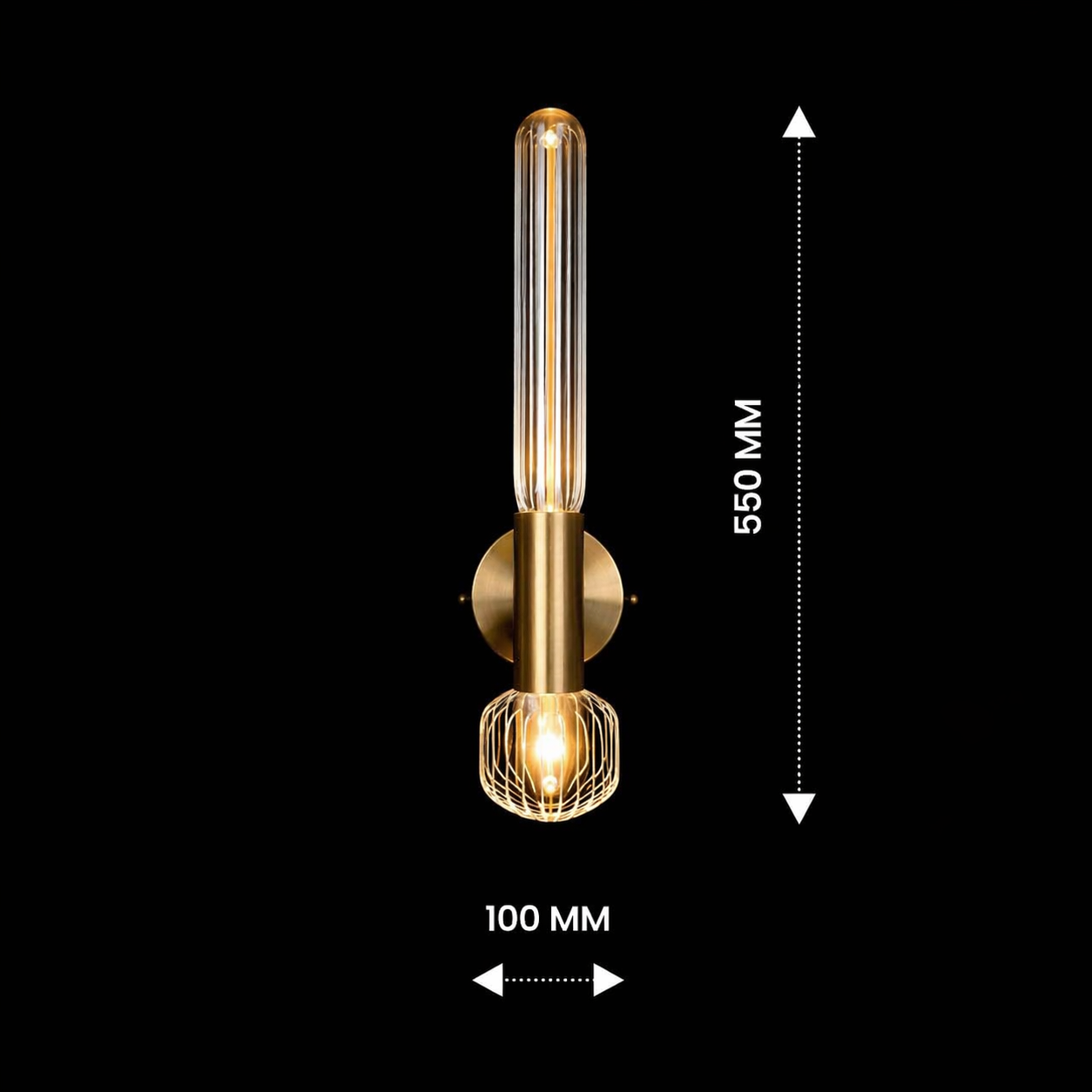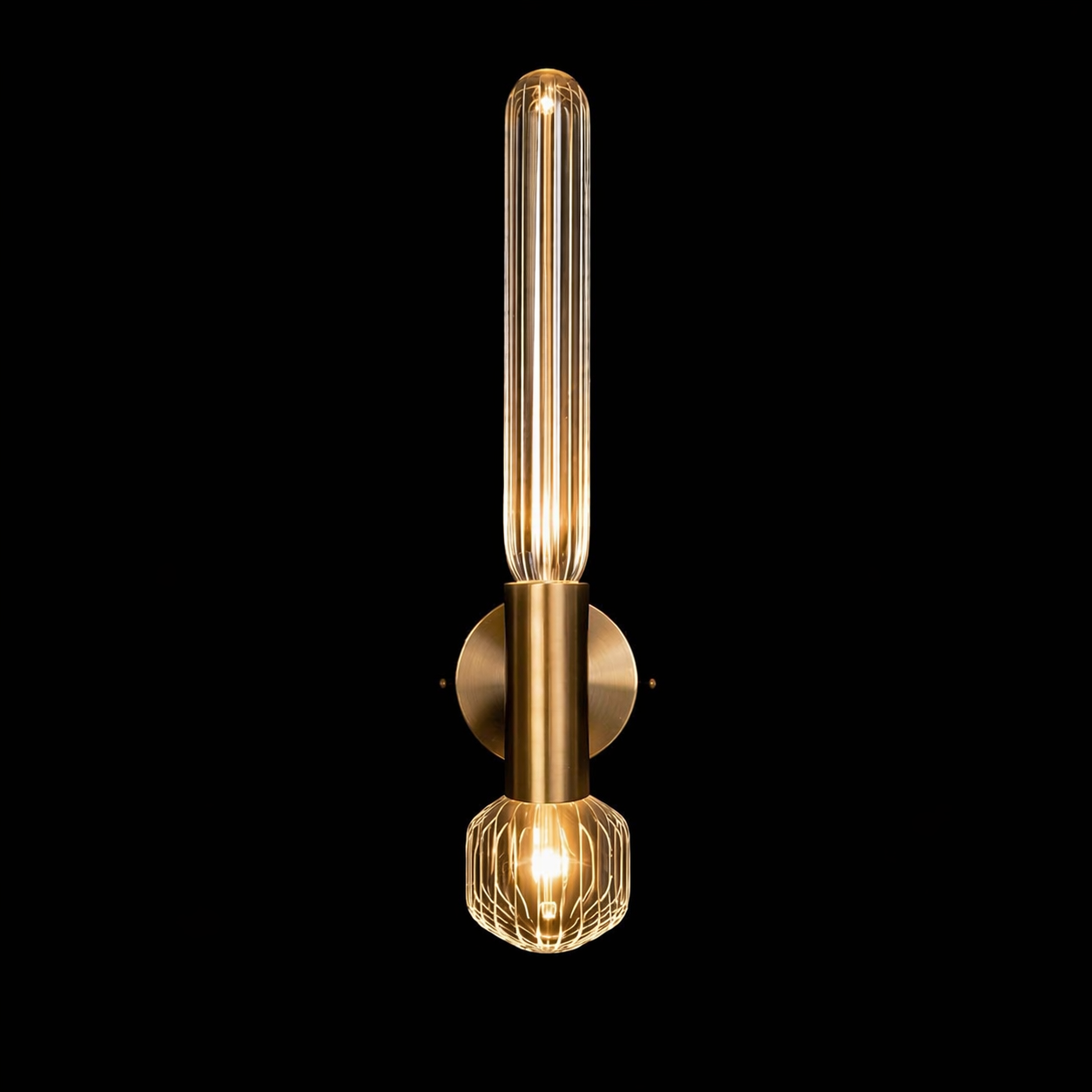 The Lumivane VerticaGlow Brass Wall Sconce is a modern luxury lighting fixture crafted to bring vertical elegance and warm ambient illumination to sophisticated interiors. Featuring a tall ribbed glass tube paired with a decorative caged glass accent at the base, this designer wall light delivers layered lighting with architectural appeal.