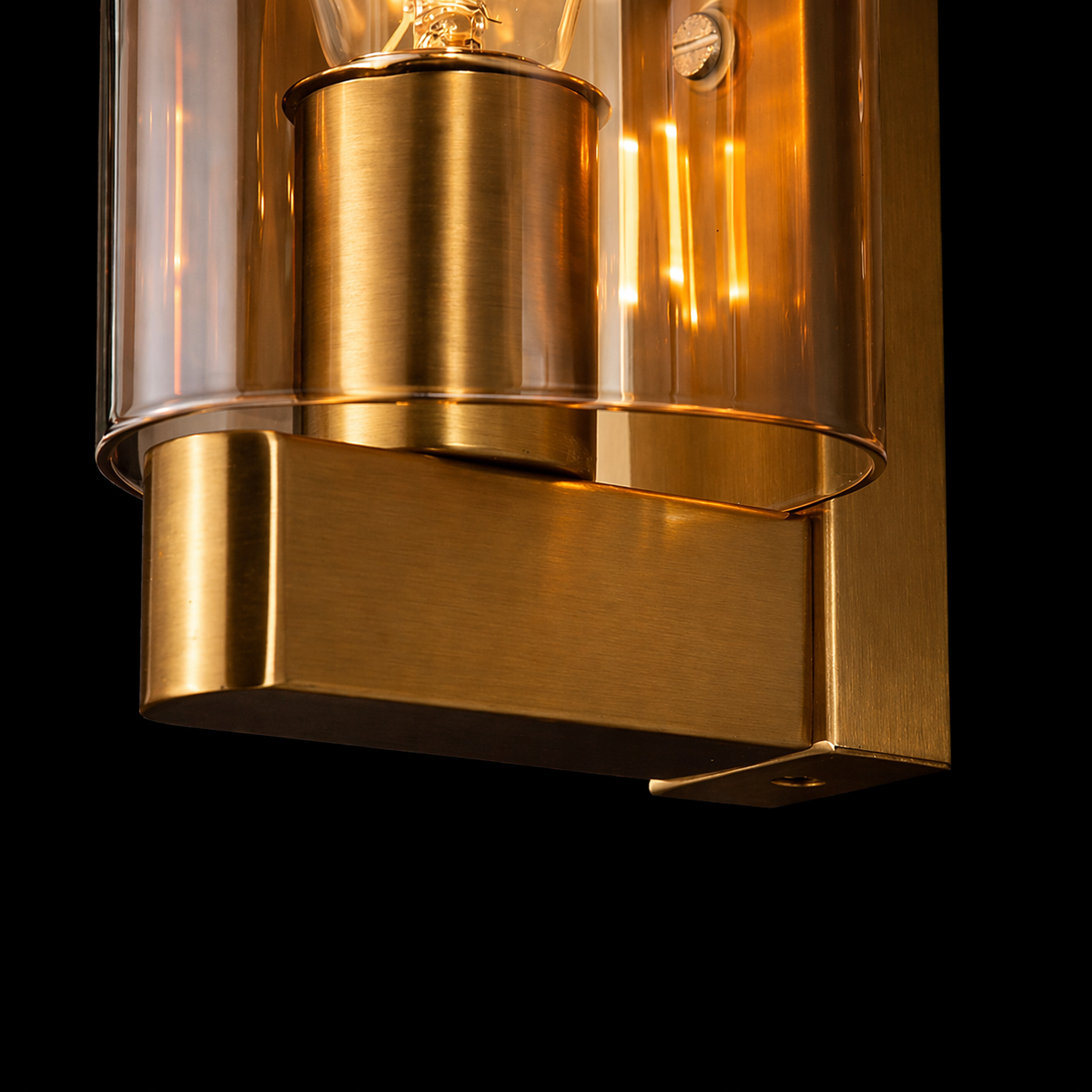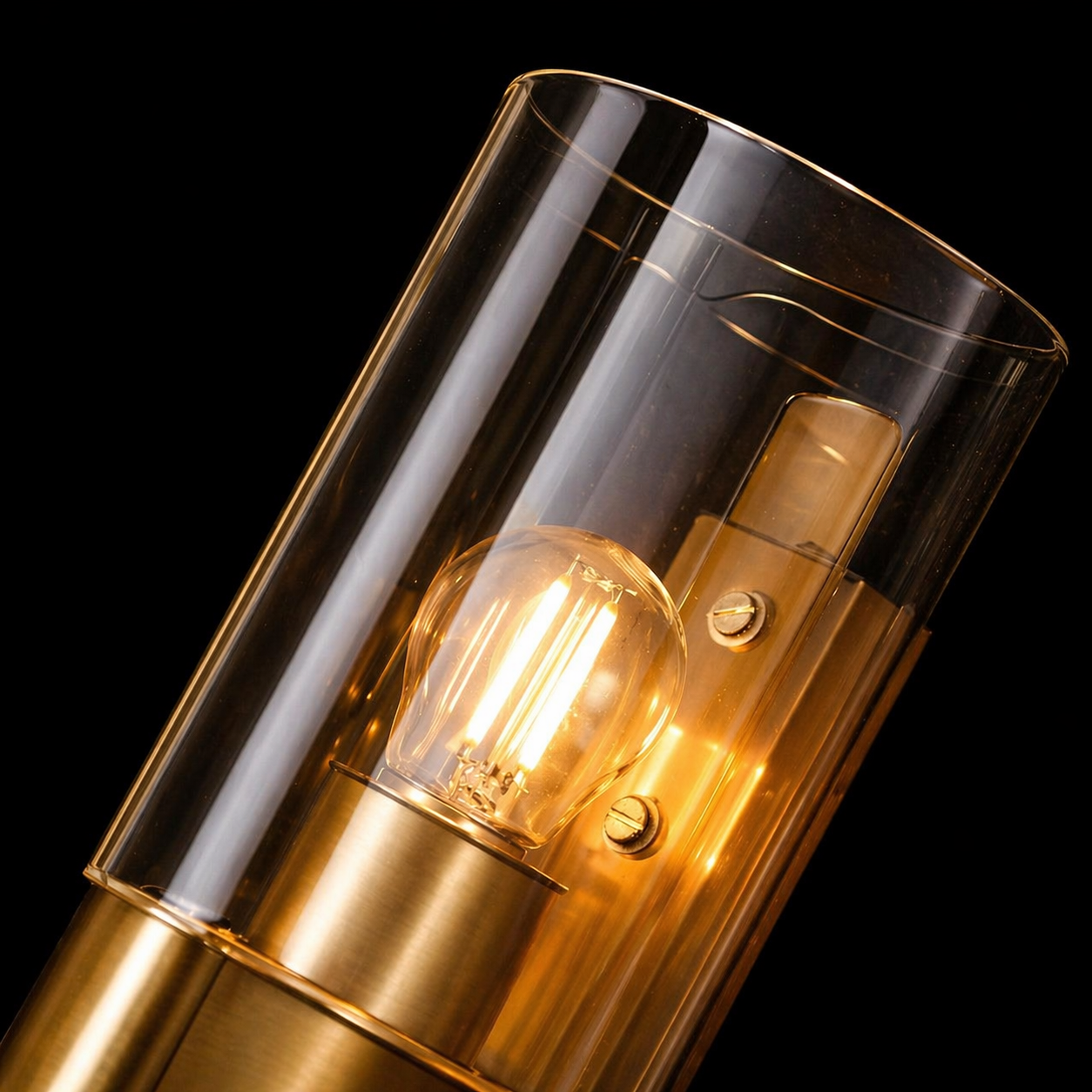 Lunara is a modern cylindrical wall light featuring a clear glass enclosure and a solid brass base that highlights the glow of the exposed bulb. Its minimal silhouette and warm metallic finish create a refined ambient light, ideal for corridors, bedside walls, and contemporary living spaces where subtle elegance is key.