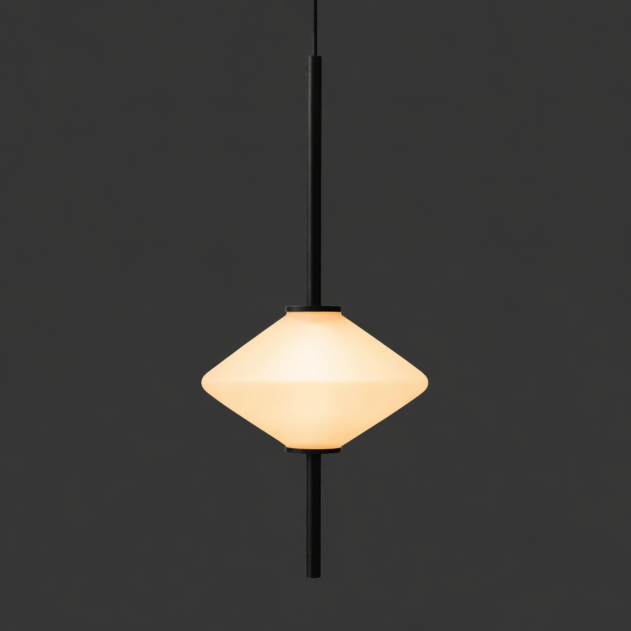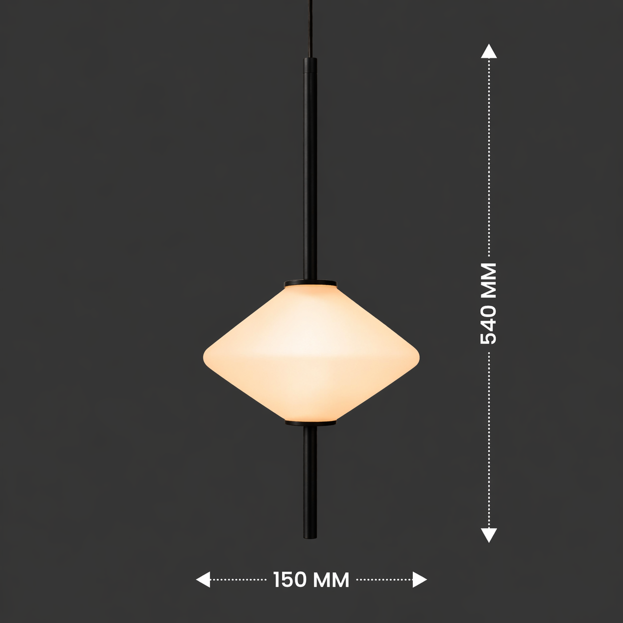The Virello AxisLume Pendant Light is a sleek architectural lighting fixture designed for refined contemporary interiors. Featuring a slim black vertical rod and a softly illuminated diamond-shaped frosted glass diffuser, this designer pendant creates a warm, balanced glow that enhances modern living spaces.