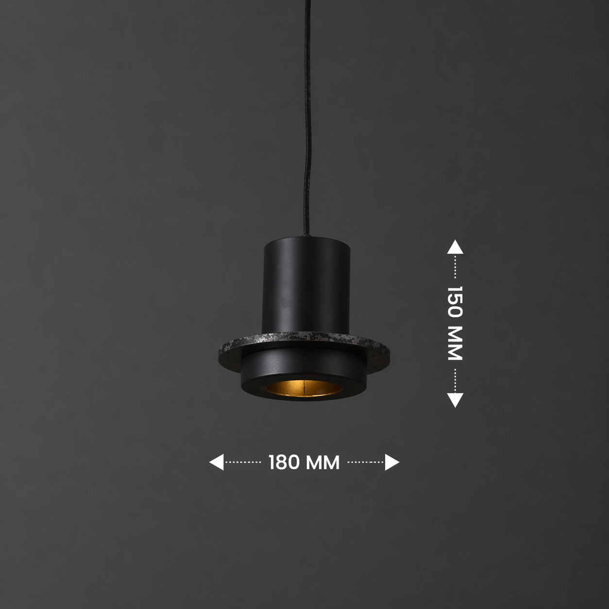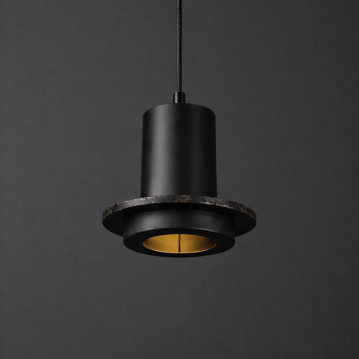 Obsidian Forge is a statement pendant light crafted in a matte black cylindrical form with a wide metal collar and warm inner reflector. The deep exterior contrasts with the golden interior glow, creating focused downward illumination with dramatic edge detail. Ideal for dining tables, loft spaces, and modern interiors that favor bold industrial character.