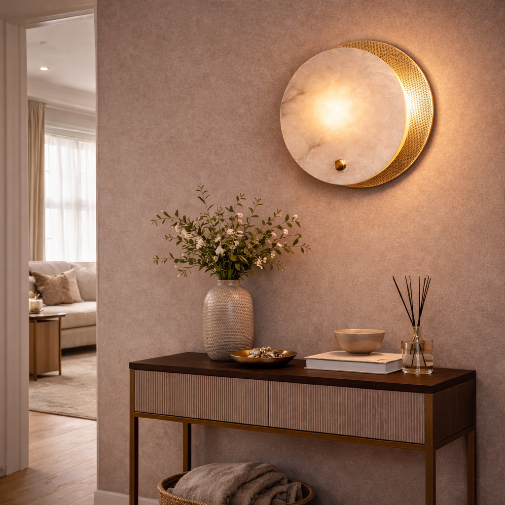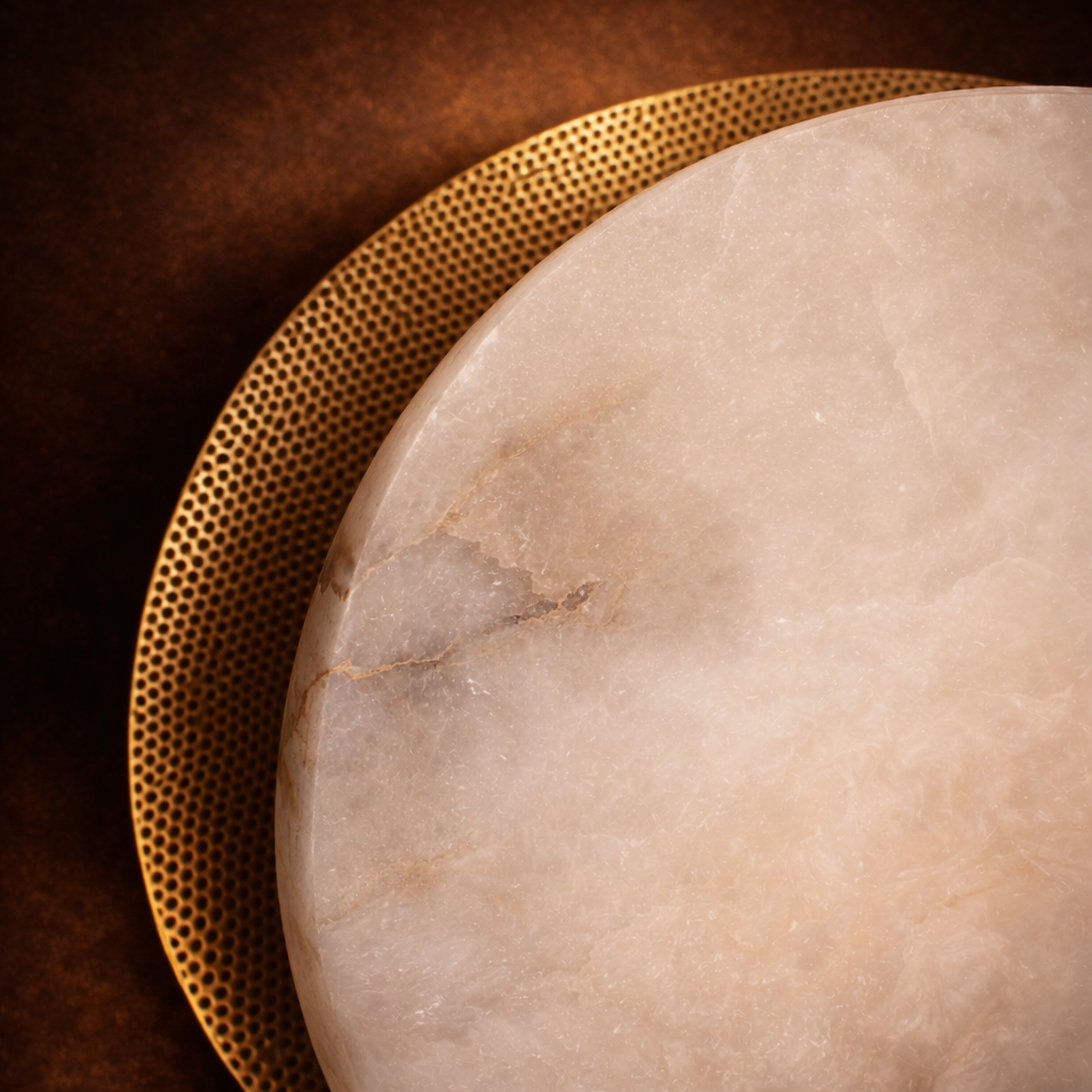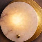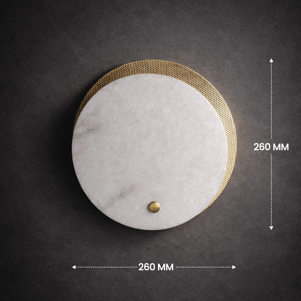 The Orbital Marble Halo Wall Sconce is a sophisticated blend of modern geometry and natural stone elegance. Designed with a luminous circular marble diffuser layered over a perforated brass backing plate, this wall light creates a captivating halo effect that radiates warm ambient light across surrounding surfaces.