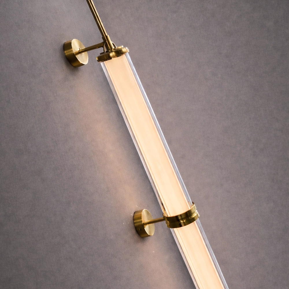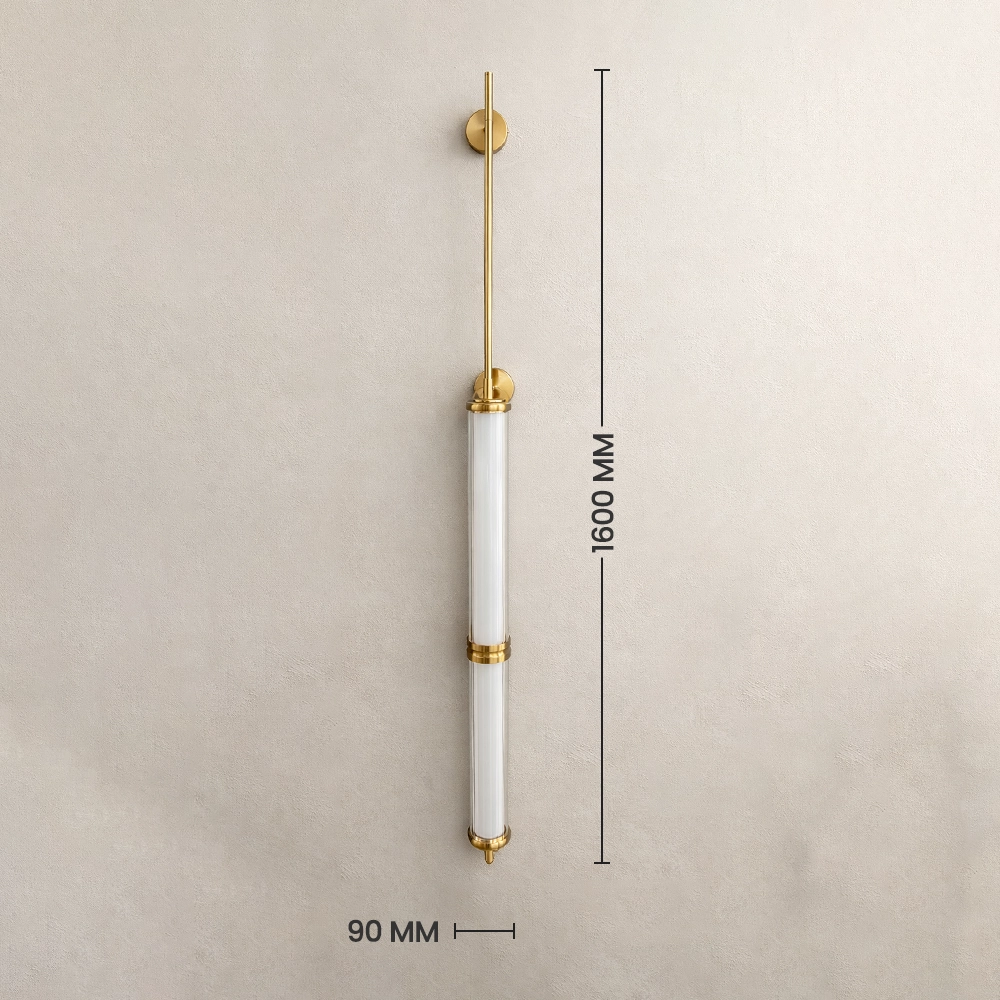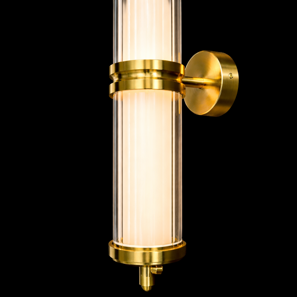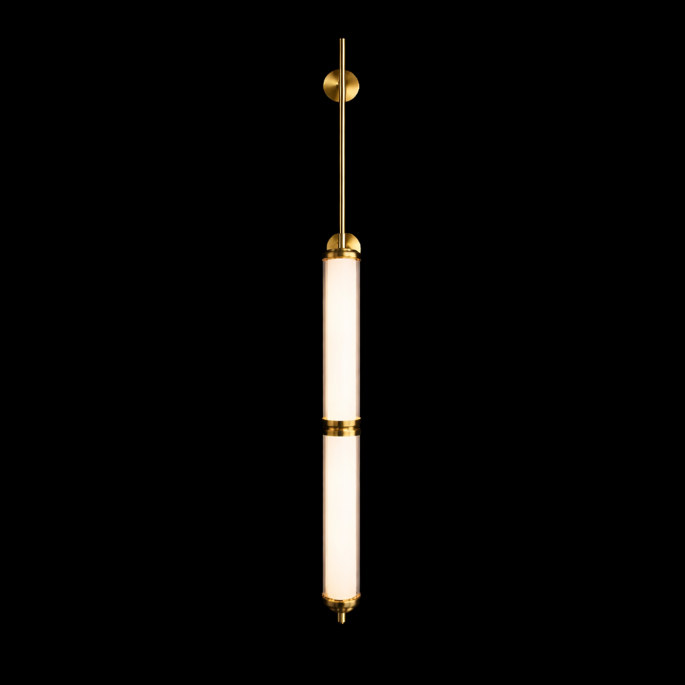 The Orion Linear Glass Tube Wall Sconce is a sleek, architectural lighting piece designed to bring refined vertical elegance to modern interiors. Featuring two illuminated glass tubes aligned along a slender brushed brass rod, this fixture creates a striking balance between minimalist design and luxurious detail.