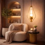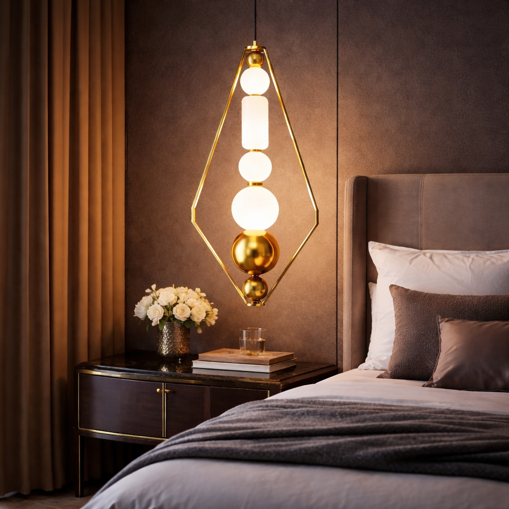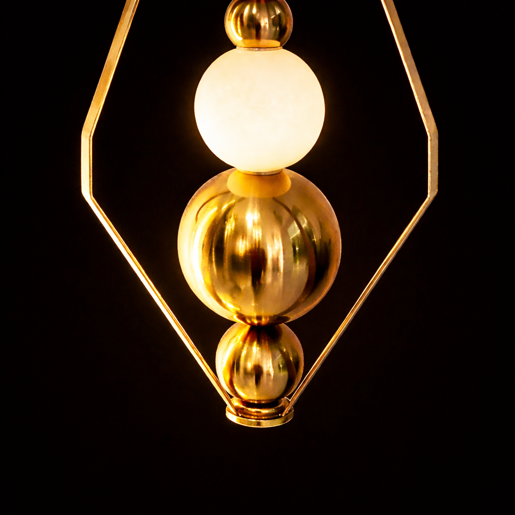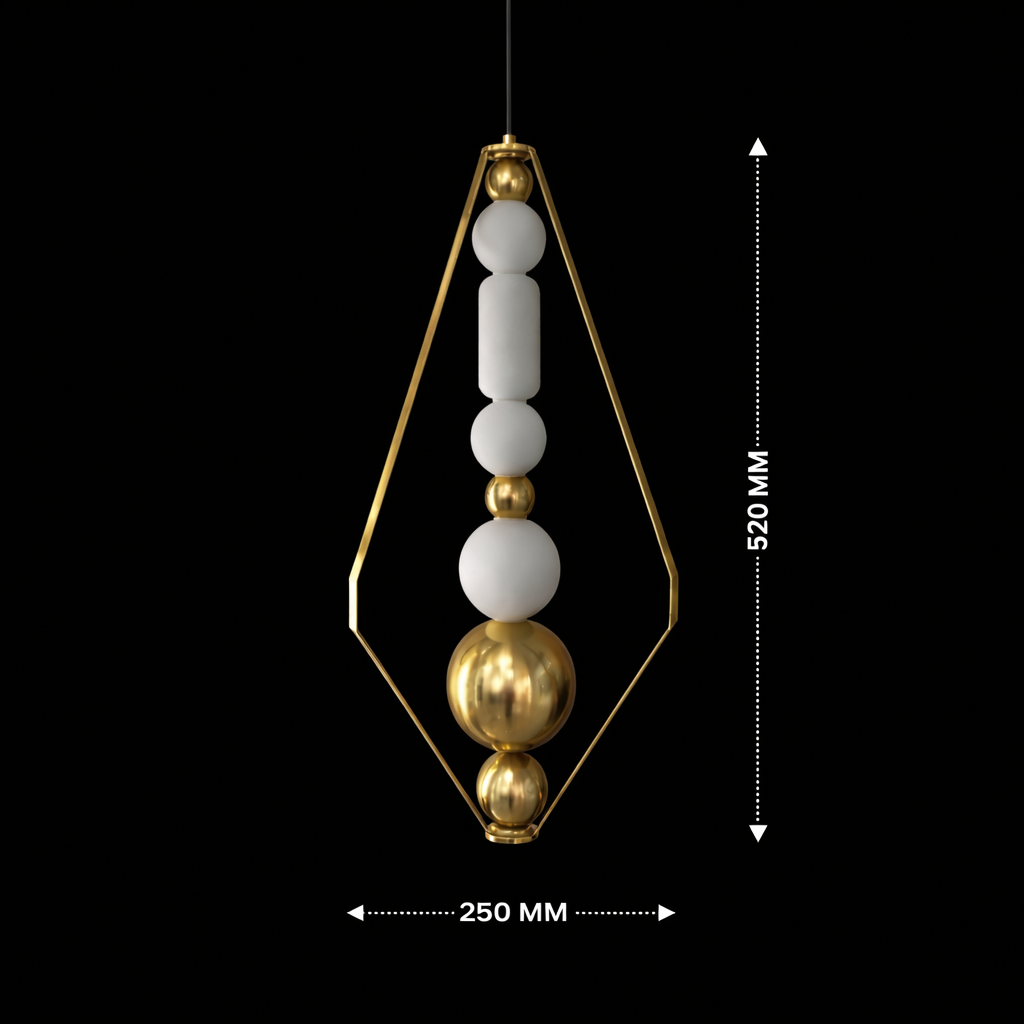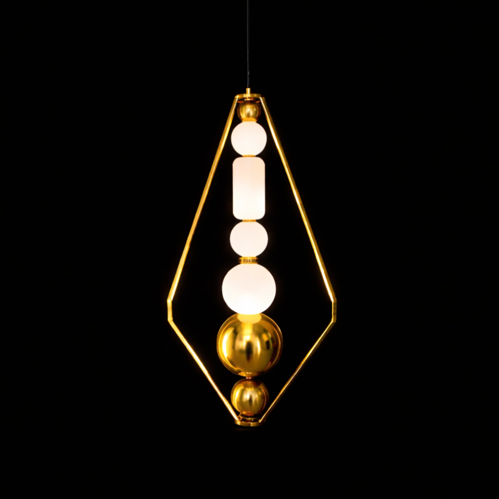 Enhance your interior with the Aurora Prism Pendant Light, a modern geometric lighting fixture featuring a sleek gold frame and glowing glass elements. This designer pendant lamp delivers warm ambient illumination, making it perfect for living rooms, dining areas, and luxury interiors. A striking blend of contemporary style and elegant lighting for sophisticated home décor. ✨
