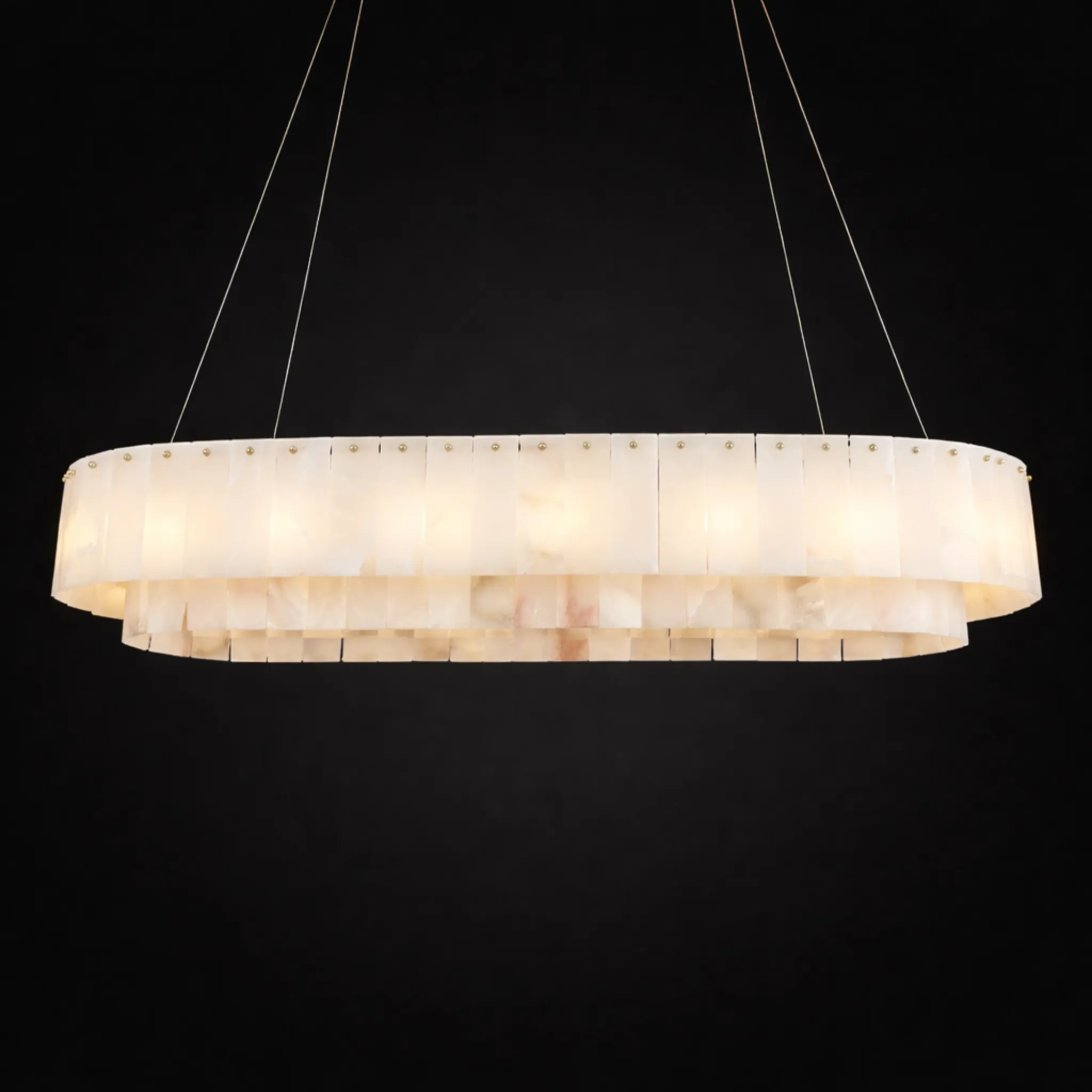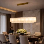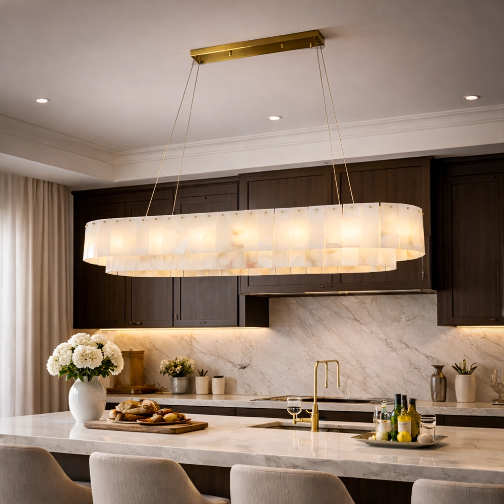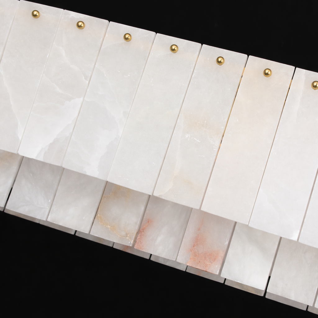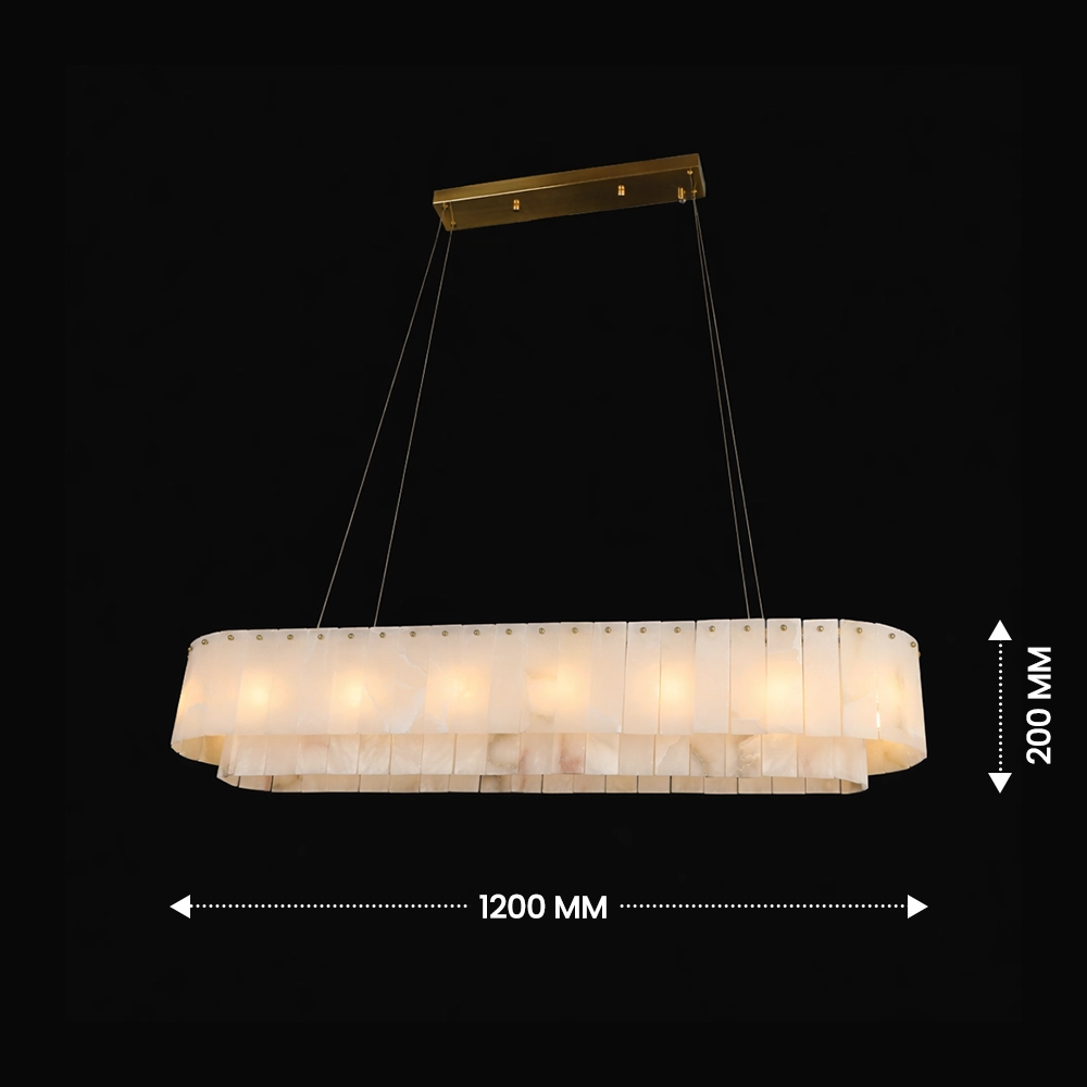 The Serenity Marble Rectangle Chandelier is a statement lighting piece that combines refined luxury with modern architectural design. Crafted with elegant marble panels arranged in a perfect circular formation, this chandelier creates a warm, soft glow that enhances the ambience of any sophisticated interior.