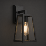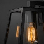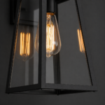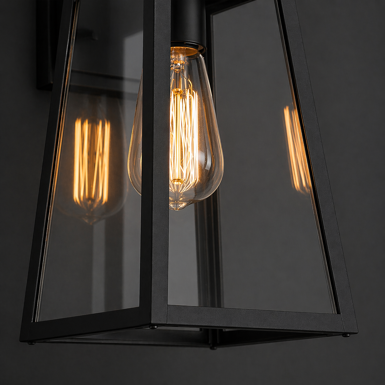 This contemporary wall lantern features a clean black metal frame with clear glass panels that highlight the warm glow of the exposed bulb, creating a bright and stylish entryway accent. The tapered geometric design sits close to the wall yet makes a bold statement, making it ideal for modern balconies, patios, corridors, and villa facades where minimal, architectural lighting is desired.