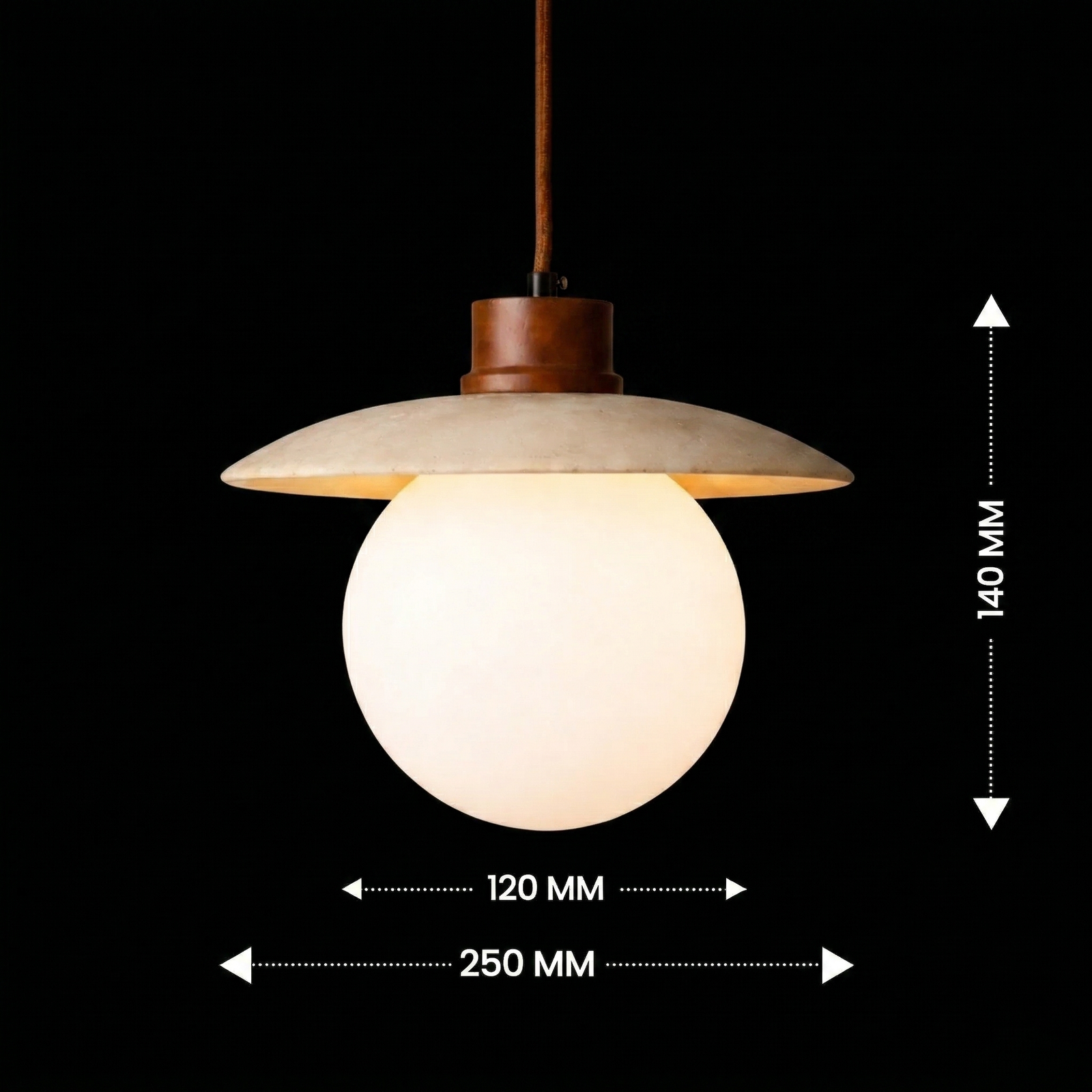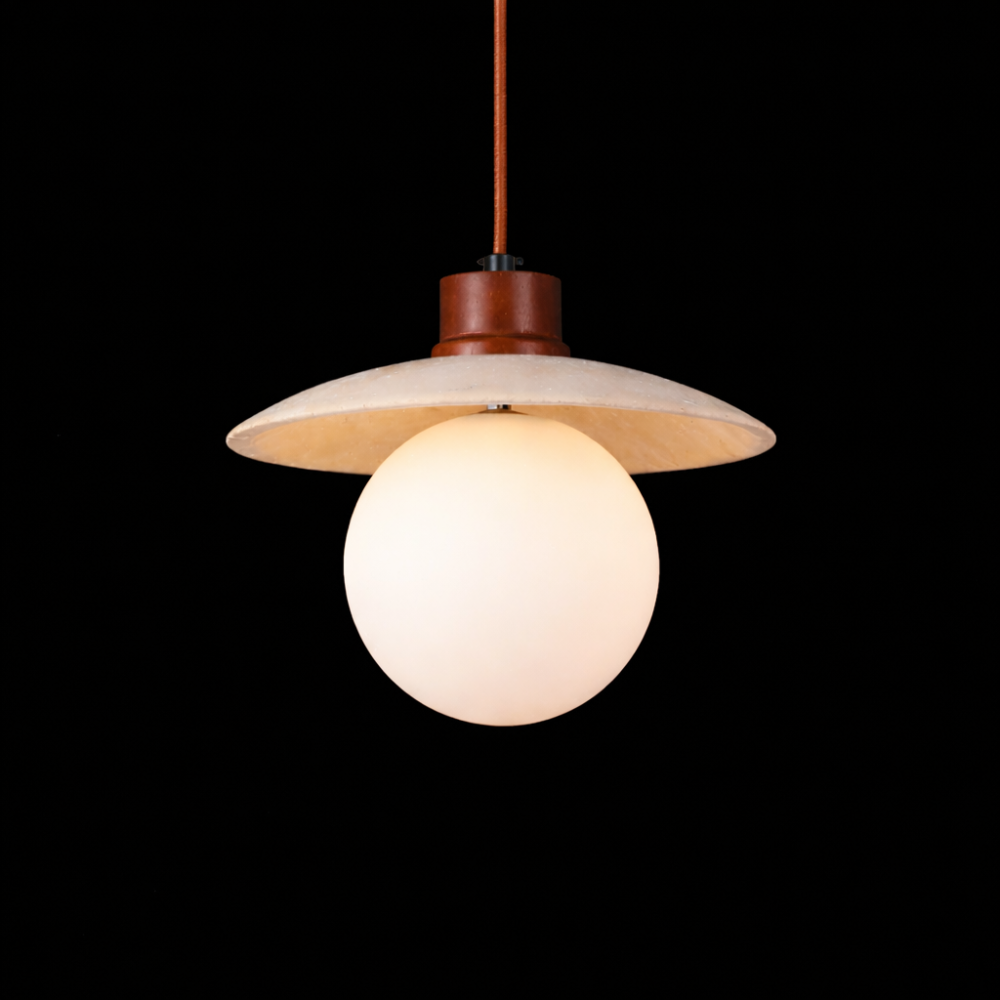 The Solterra Globe Pendant Light blends natural materials with minimalist design to create a warm, contemporary lighting statement. Featuring a smooth glowing globe suspended beneath a wide stone-inspired shade and accented with a rich wooden canopy, this pendant delivers a balanced fusion of organic texture and modern simplicity.