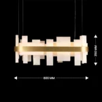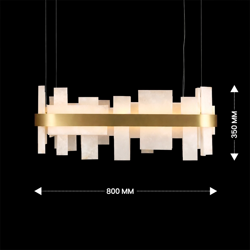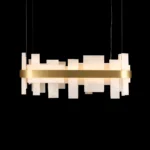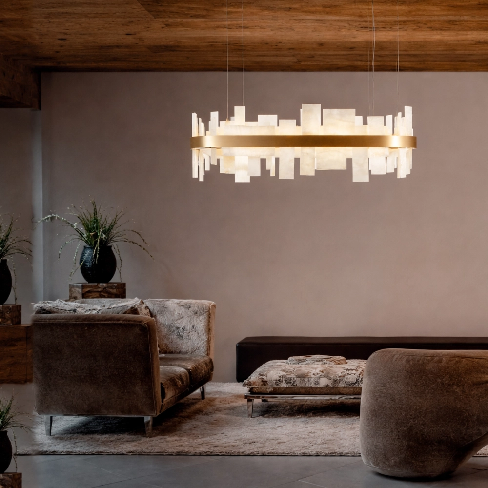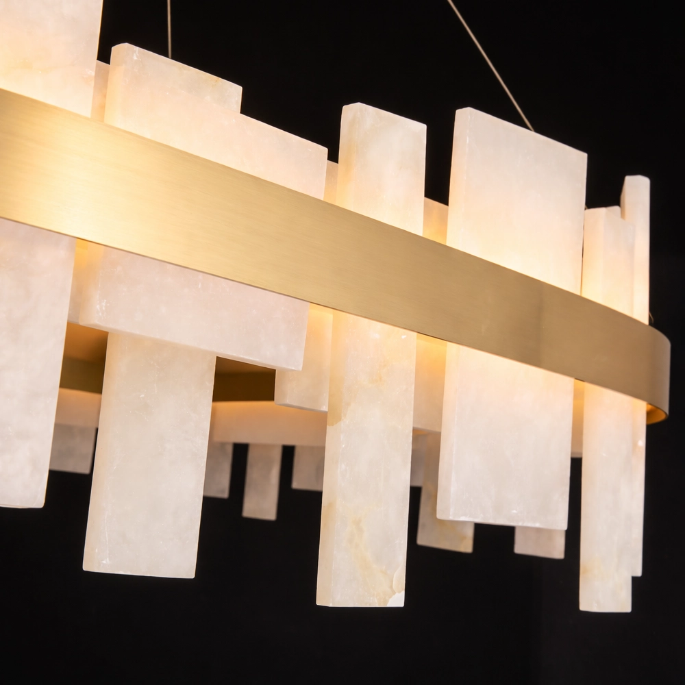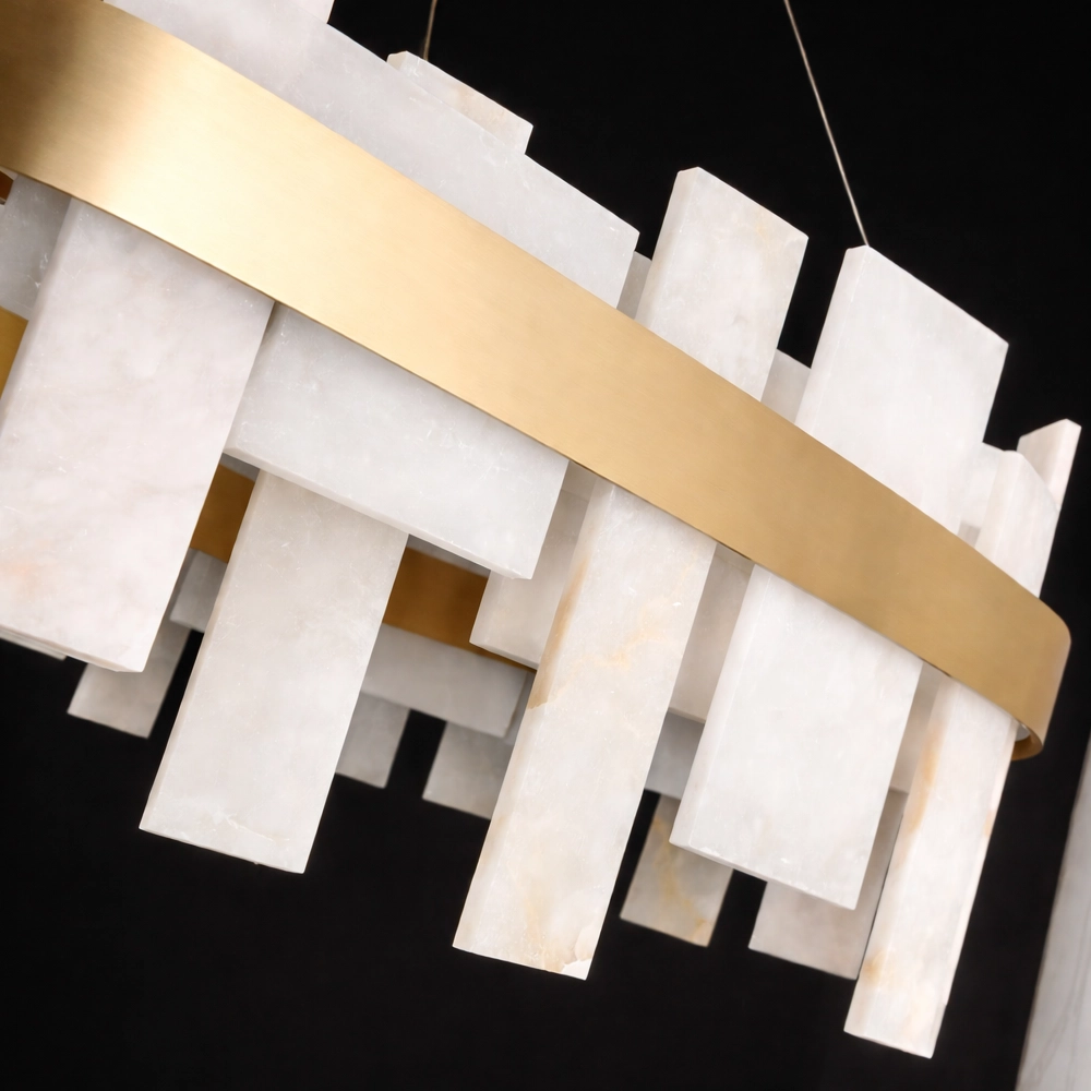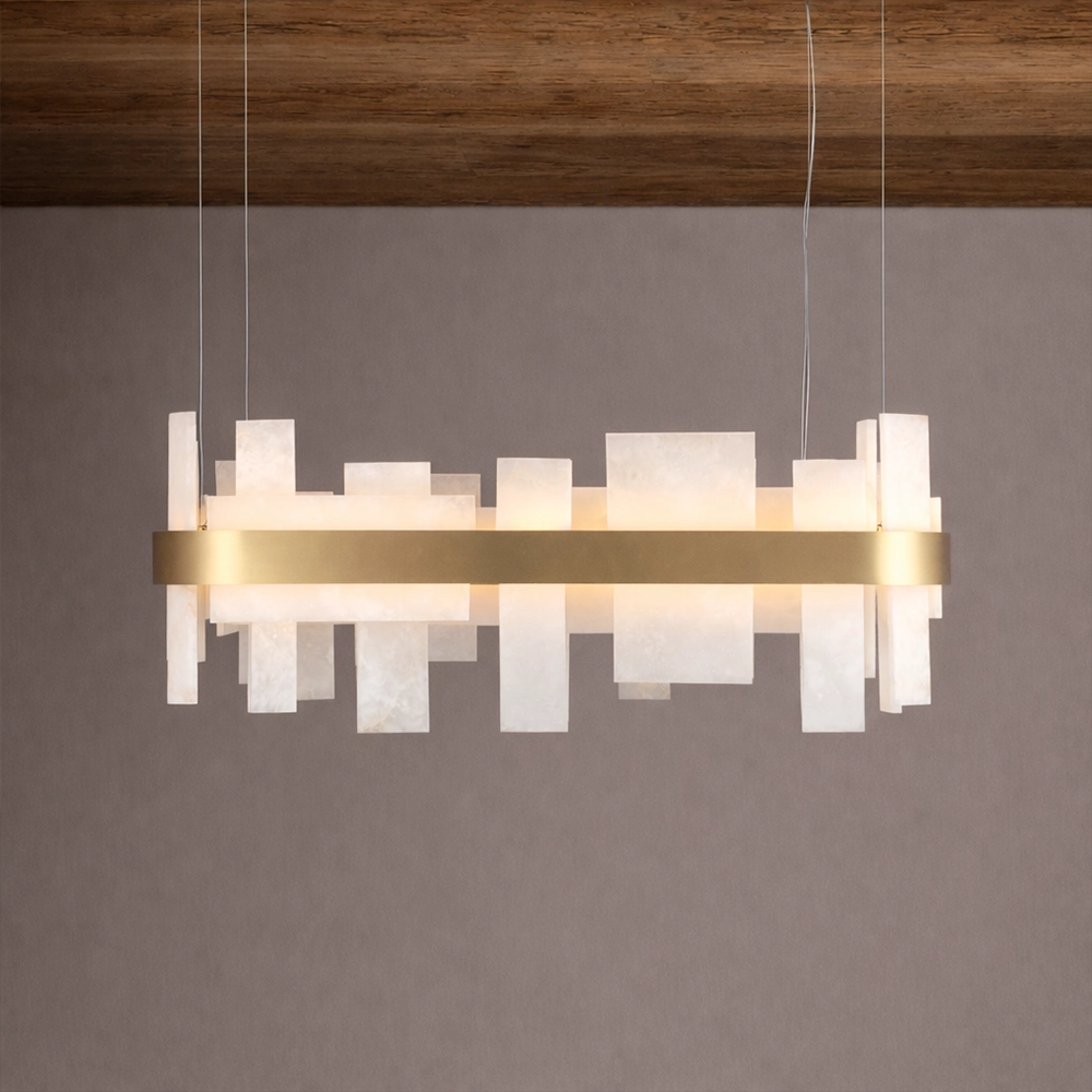 Strata Marble Skyline is a sculptural chandelier featuring staggered marble blocks arranged around a sleek brushed brass band. The layered stone pieces create a skyline-like silhouette while softly diffusing warm light from within. Designed for dining rooms, statement living spaces, and modern interiors that appreciate architectural lighting with natural stone elegance.